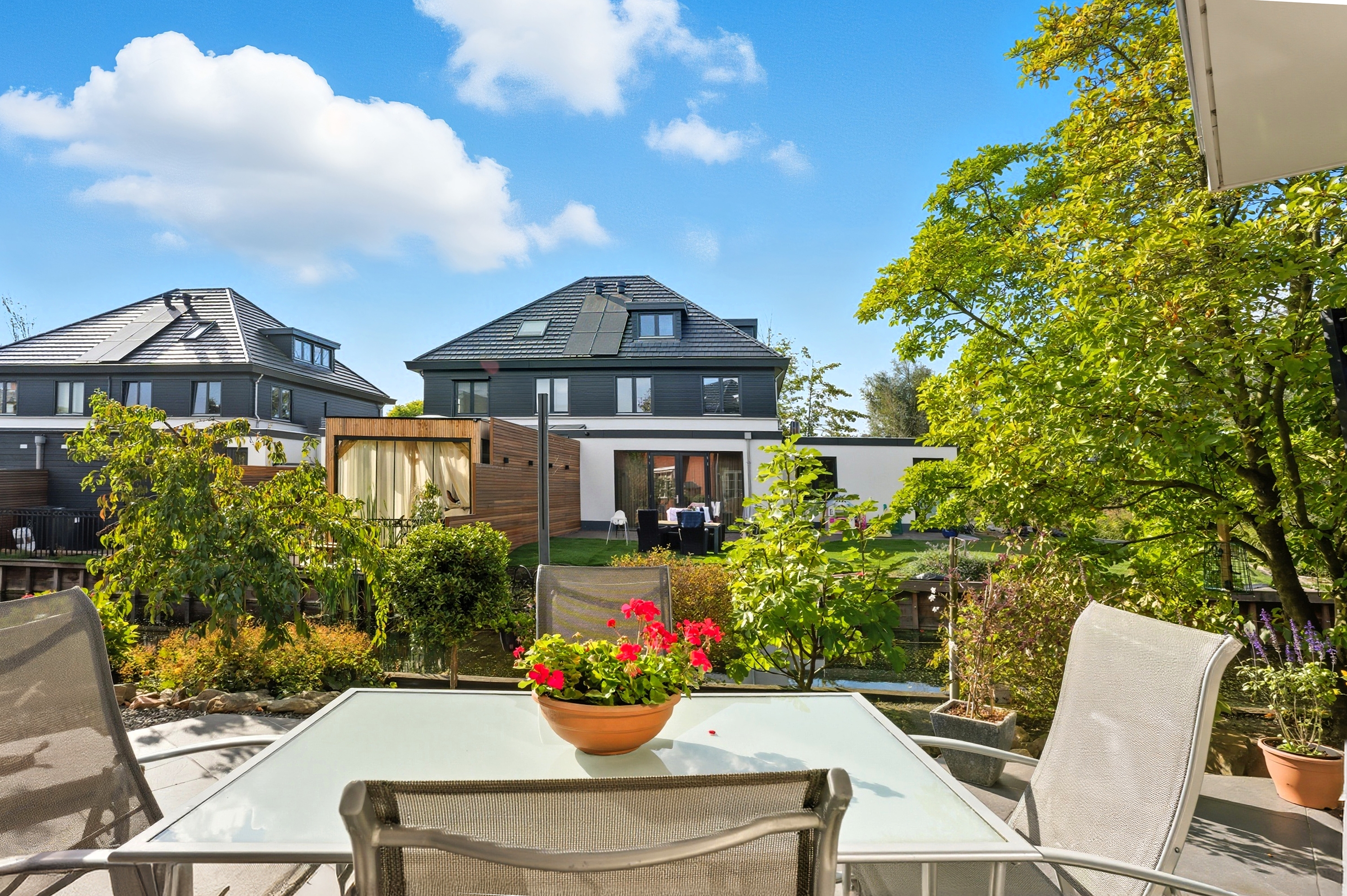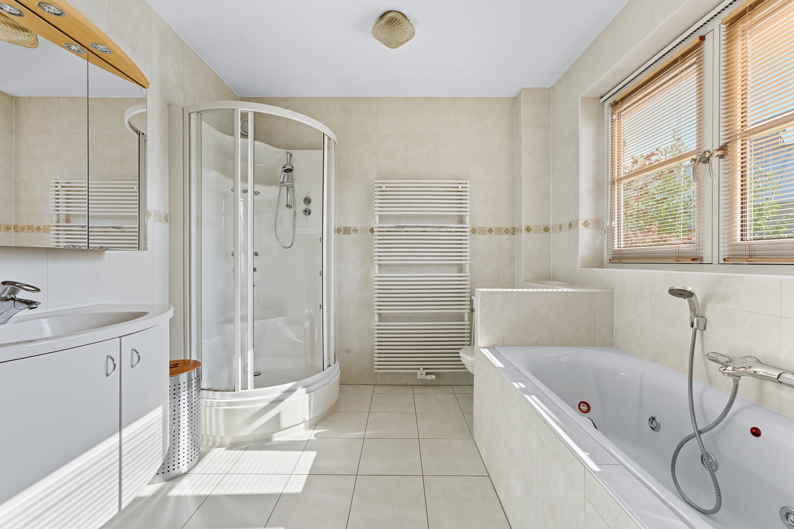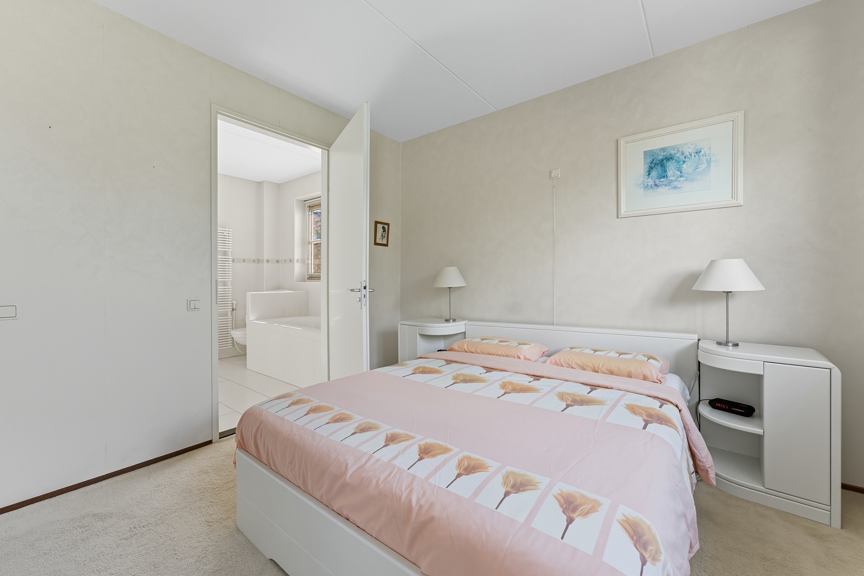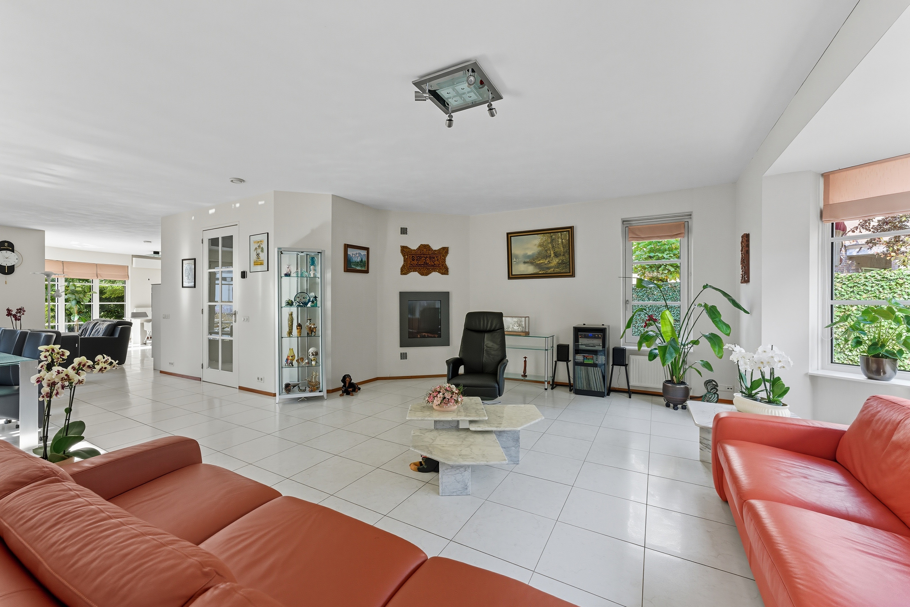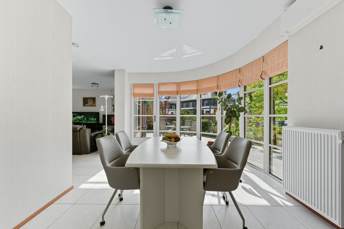 De royale woonkamer is een heerlijke, lichte leefruimte met een sfeervolle erker en grote raampartijen rondom. Vanuit elke hoek kijk je uit over groen en water, wat zorgt voor een rustgevende sfeer. De vloer is voorzien van lichte vloertegels met vloerverwarming en de afwerking is tot in de puntjes verzorgd. Er zijn openslaande deuren wat een fijne verbinding geeft met de tuin.