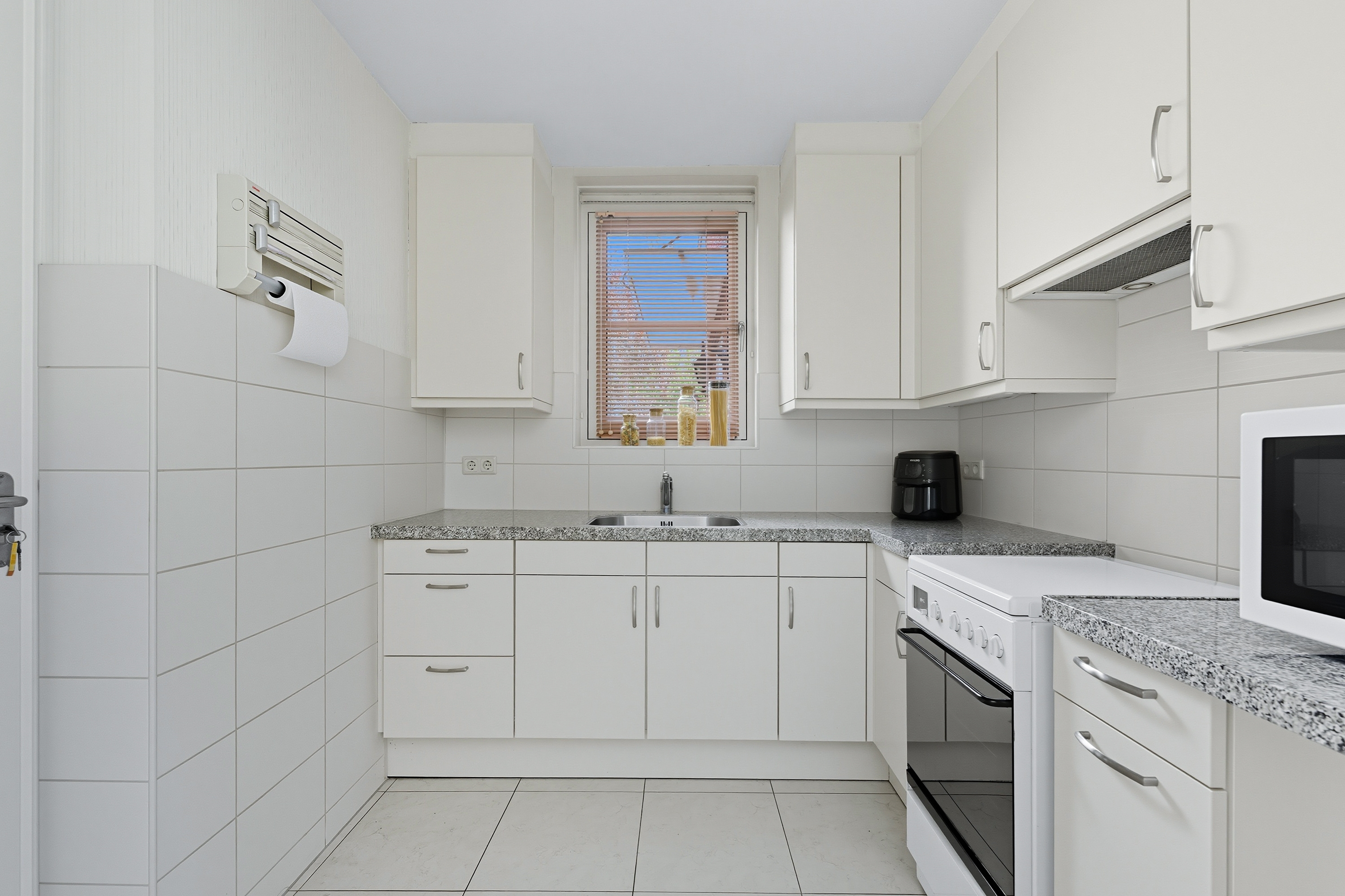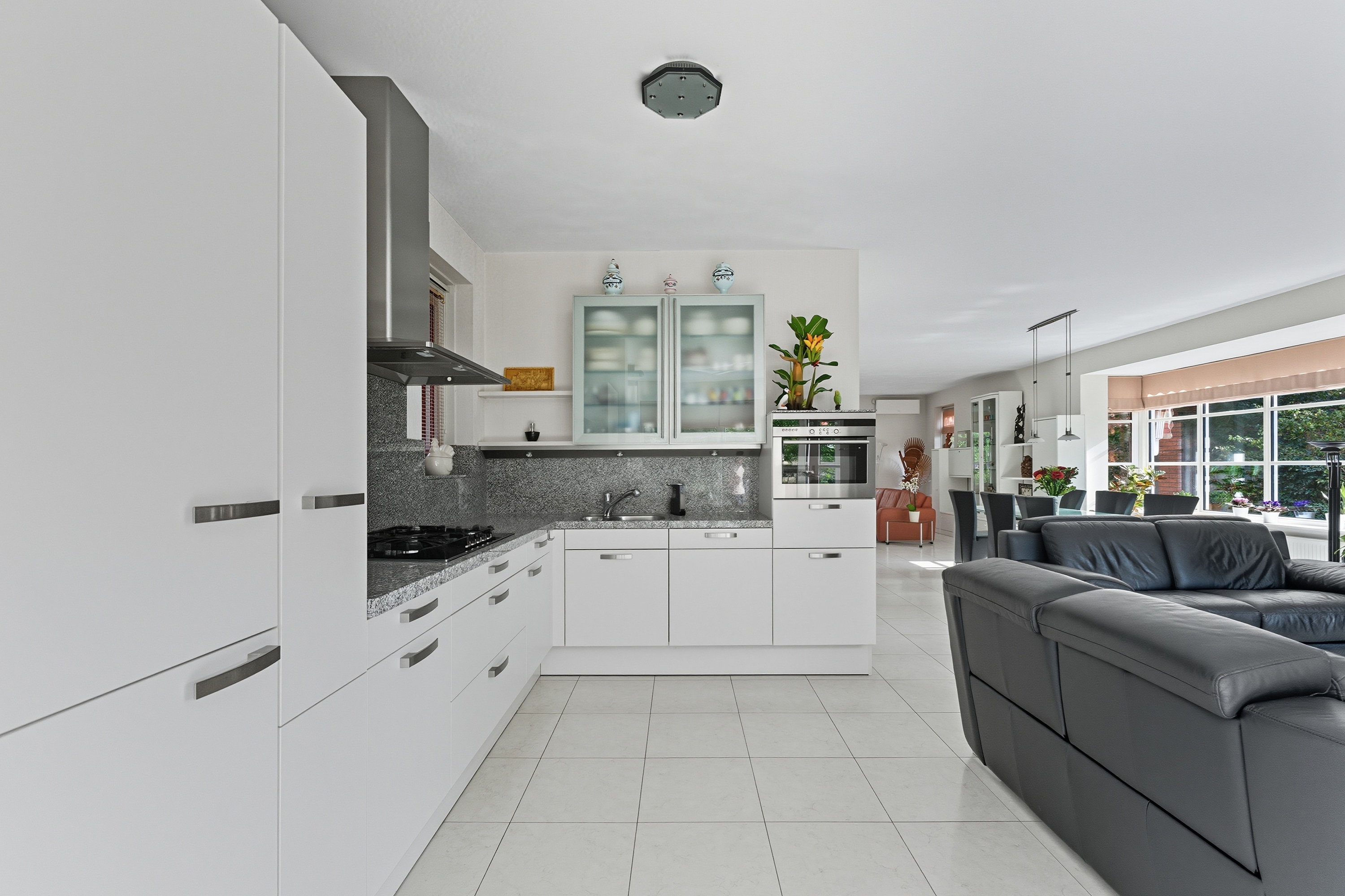 De open keuken is uitgevoerd in een luxe, tijdloze stijl met granieten blad en hoogwaardige apparatuur: een 5-pits gaskookplaat, afzuigkap, combimagnetron, oven, koelkast, vaatwasser en veel kastruimte. Aansluitend is er de serre met een speelse ronding, de ideale plek voor lekker tafelen! Via deze ruimte is er de bijkeuken met wasruimte en doorgang naar de dubbele garage. Boven de garage is een vliering aanwezig met betonvloer, het is hier ongeveer 70 cm hoog