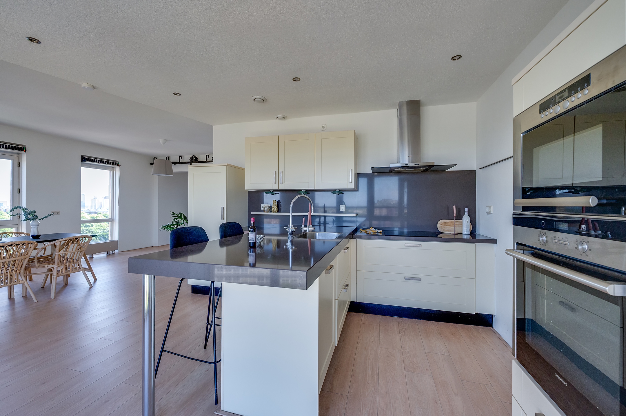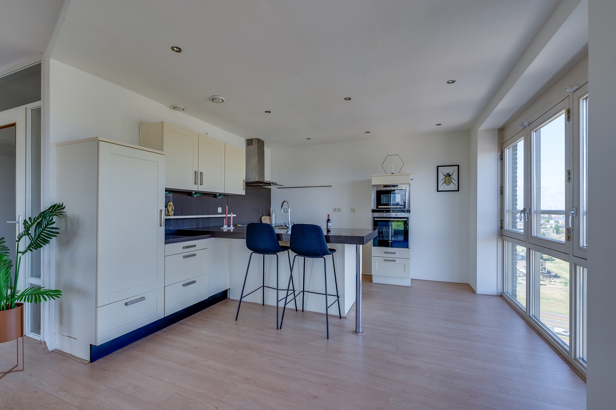 Op de 14e verdieping stap je binnen in de hal met het toilet, meterkast en toegang tot alle vertrekken. De woonkamer is heerlijk licht dankzij de grote raampartijen over twee zijden – het uitzicht is hier werkelijk spectaculair! De open keuken met bar is strak afgewerkt en voorzien van diverse inbouwapparatuur zoals een vaatwasser, inductiekookplaat, afzuigkap, koelkast, vriezer, oven en magnetron.