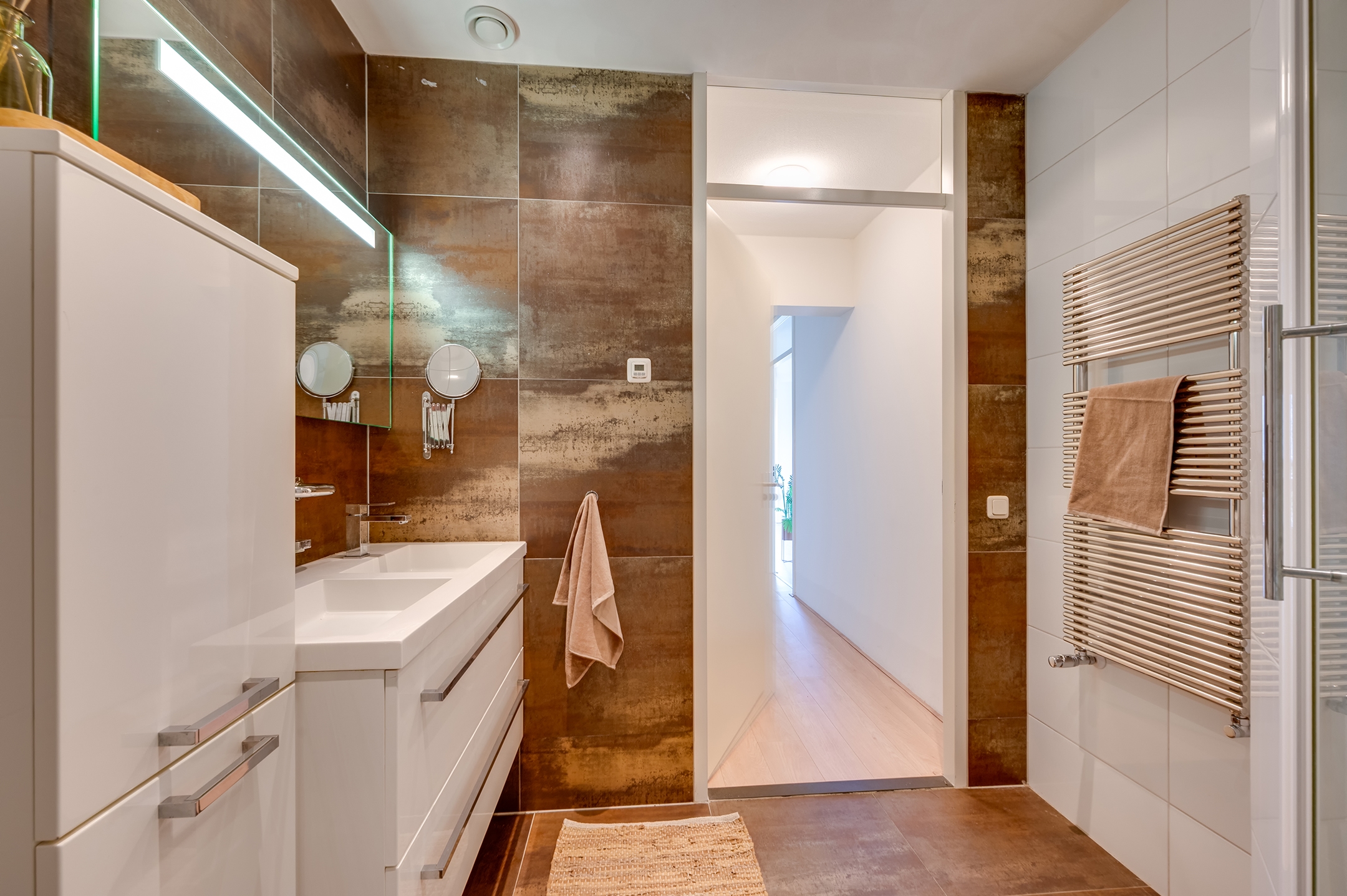 7. Badkamer met vloerverwarming, dubbele wastafel en douchecabine