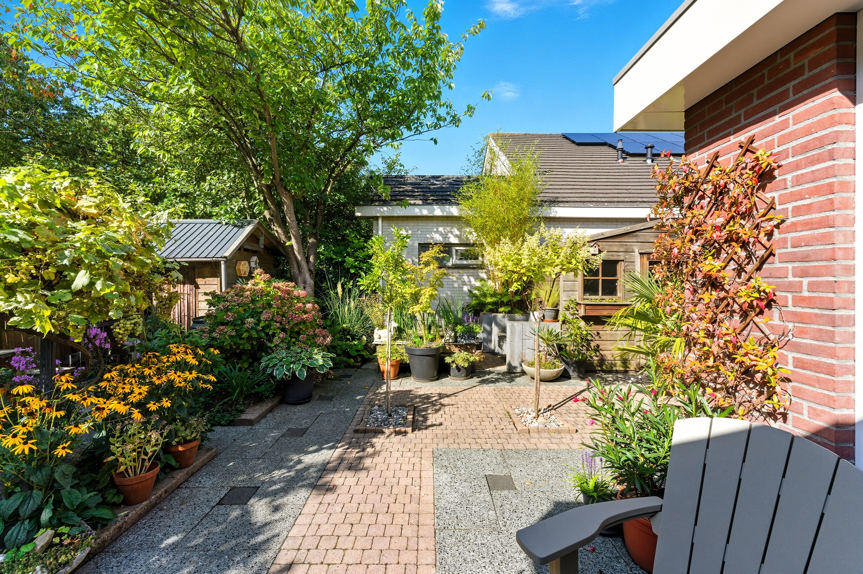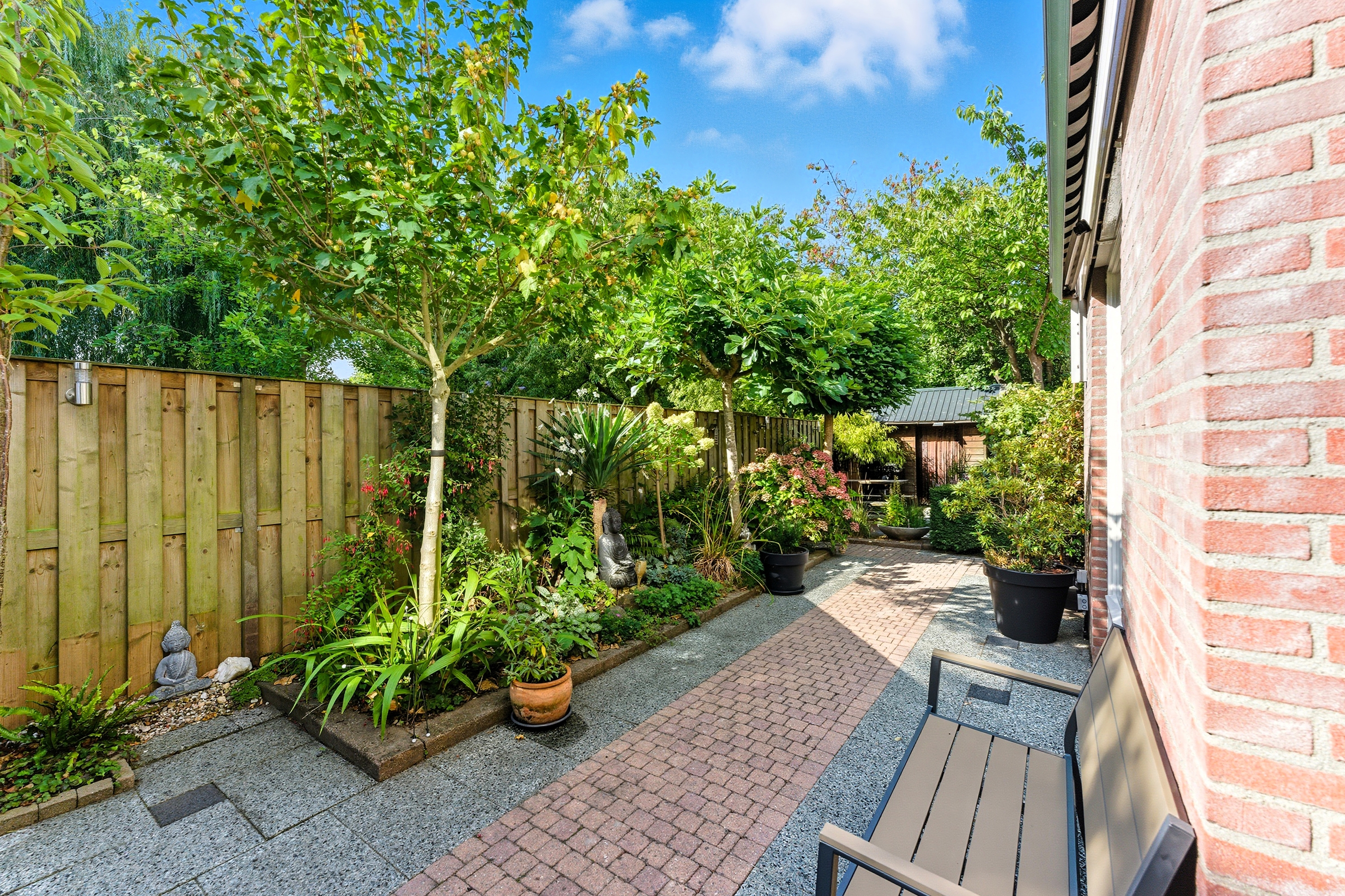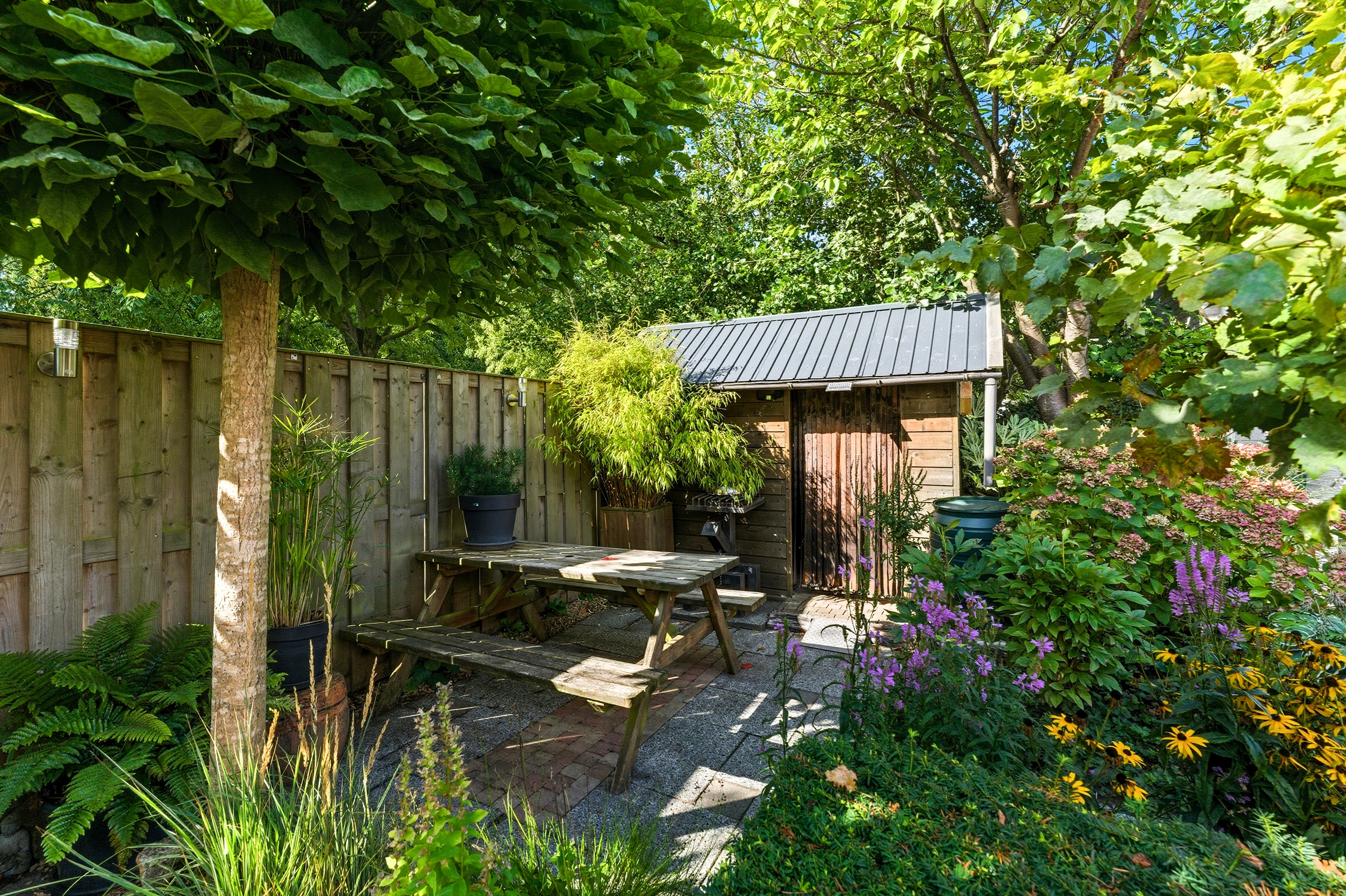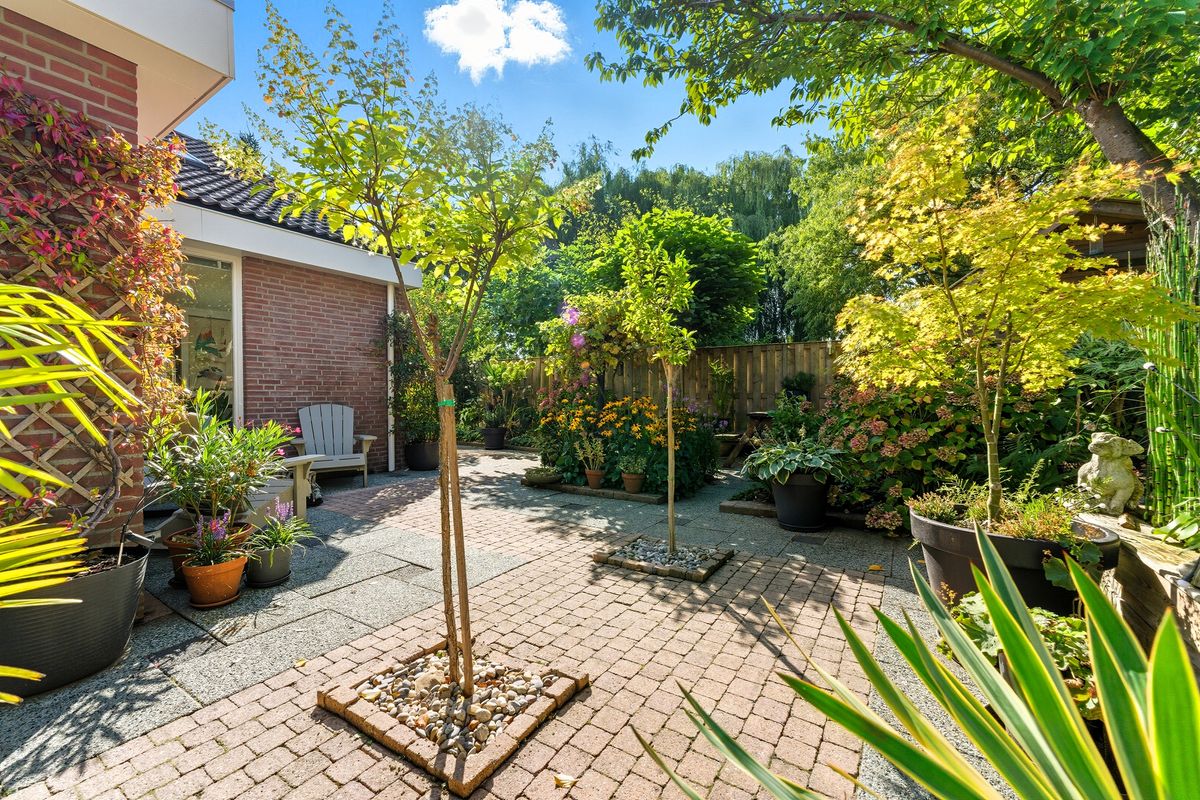 De achtertuin is groen en sfeervol aangelegd met diverse beplanting en terrassen. Doordat de tuin grenst aan een groenstrook geniet je hier van extra privacy en rust. Ook zijn er twee bergingen in de tuin aanwezig.