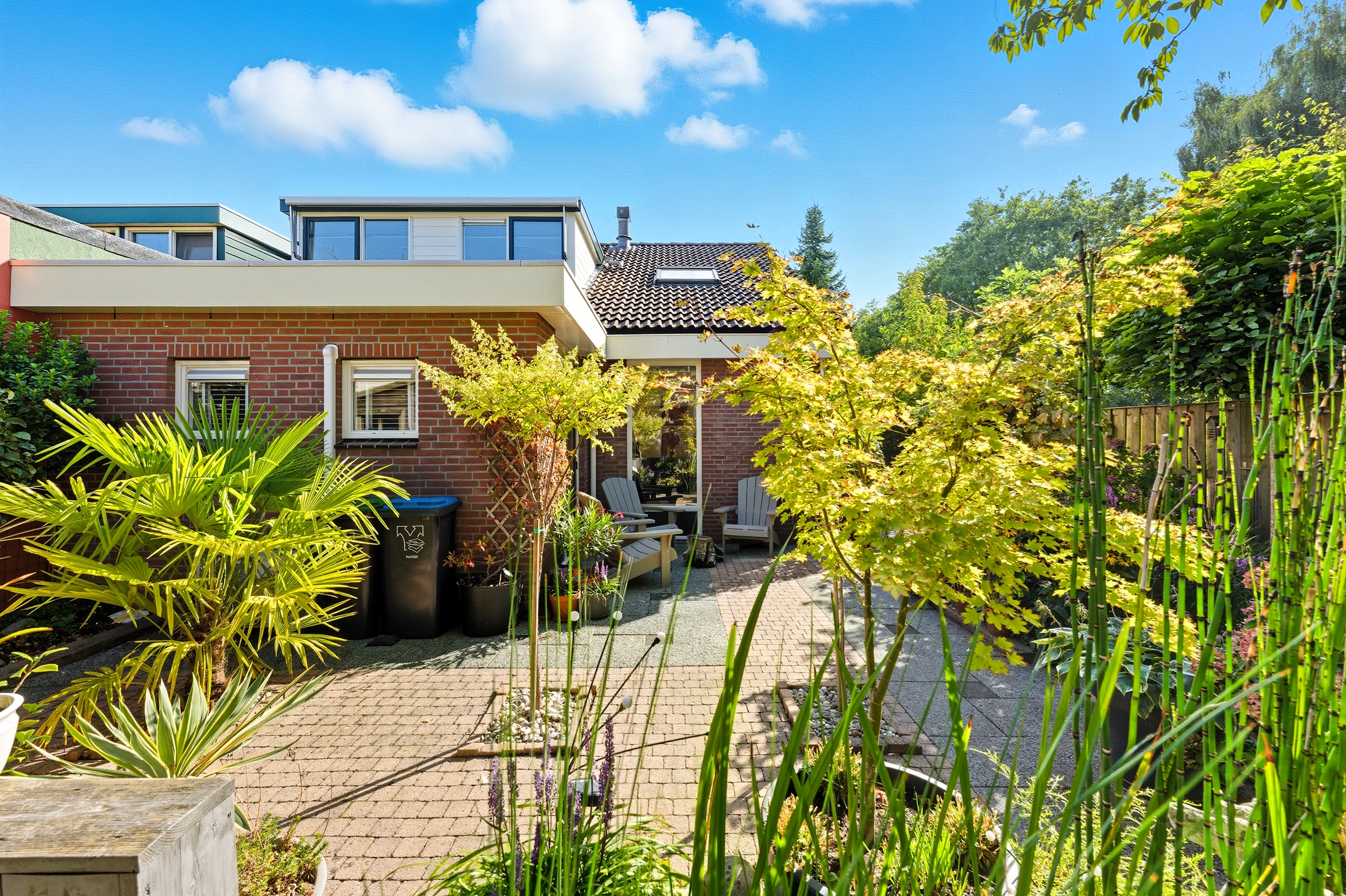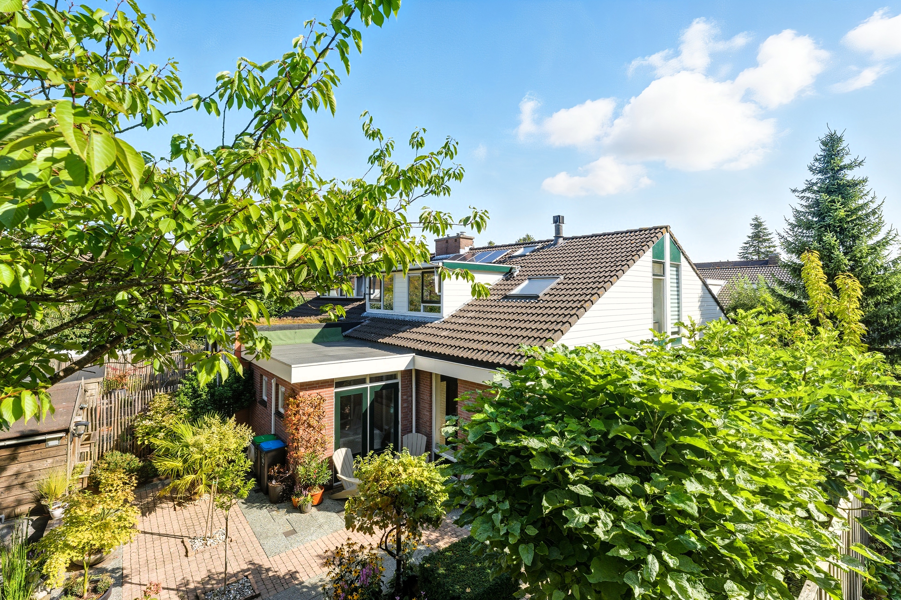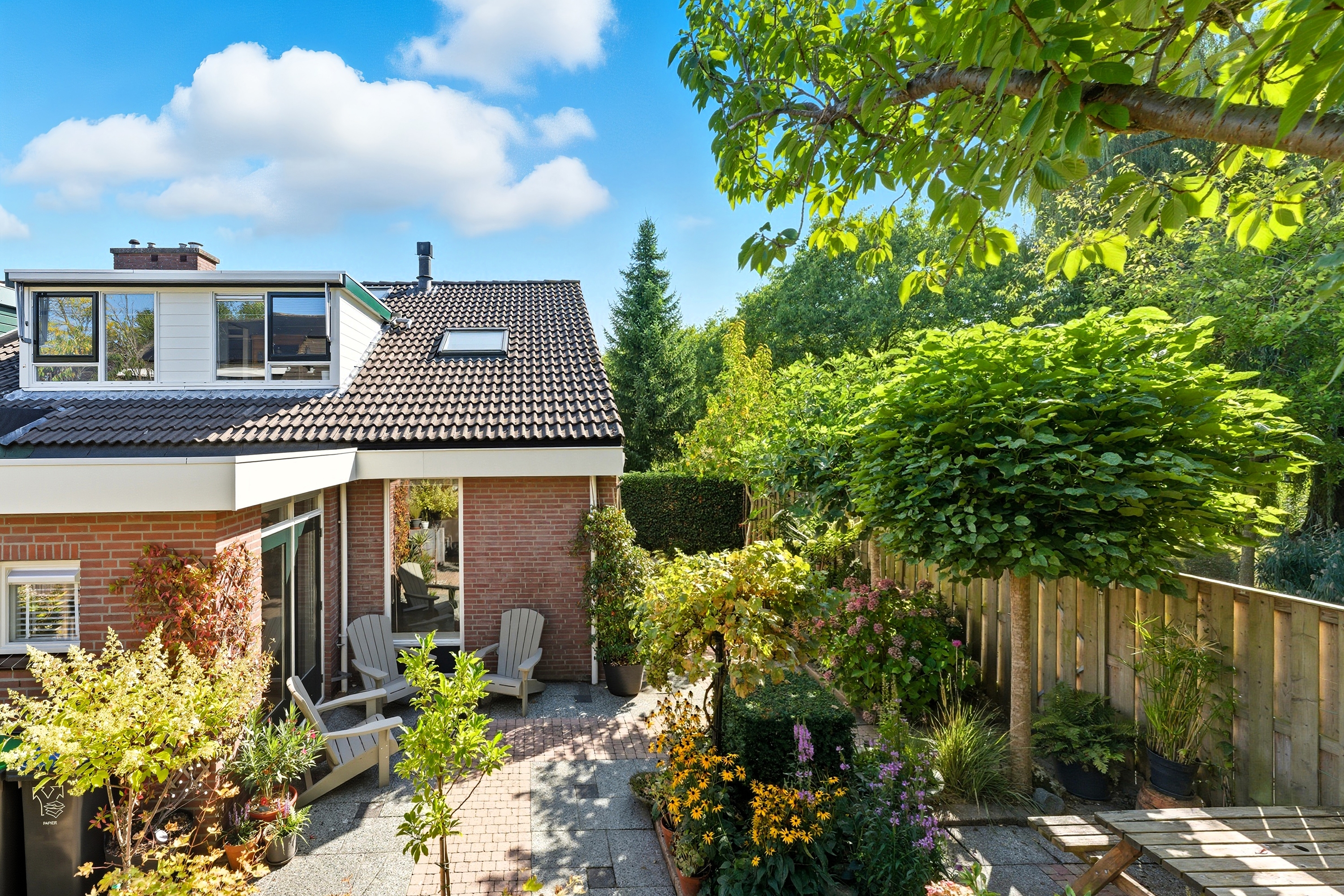 De achtertuin is groen en sfeervol aangelegd met diverse beplanting en terrassen. Doordat de tuin grenst aan een groenstrook geniet je hier van extra privacy en rust. Ook zijn er twee bergingen in de tuin aanwezig.