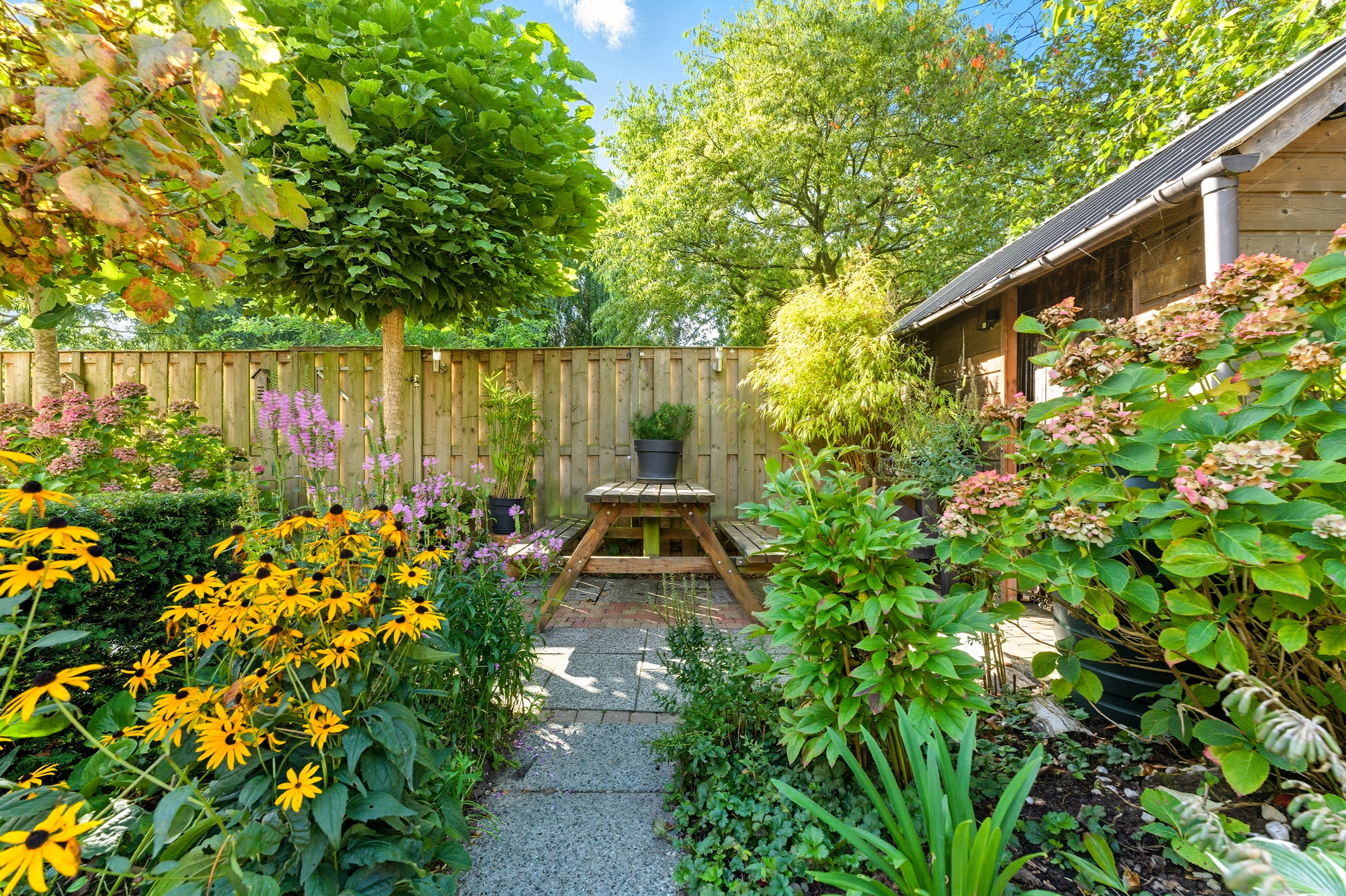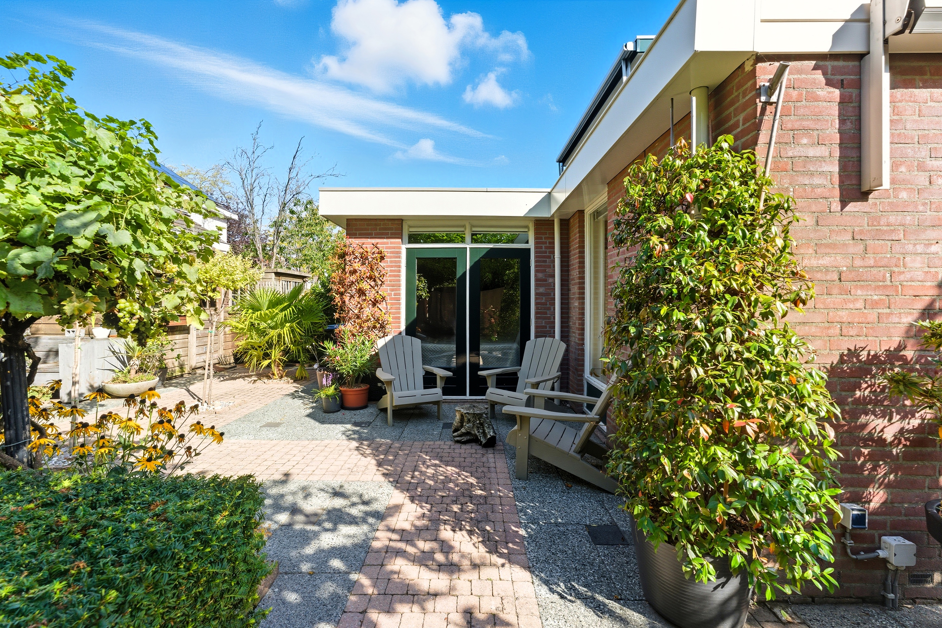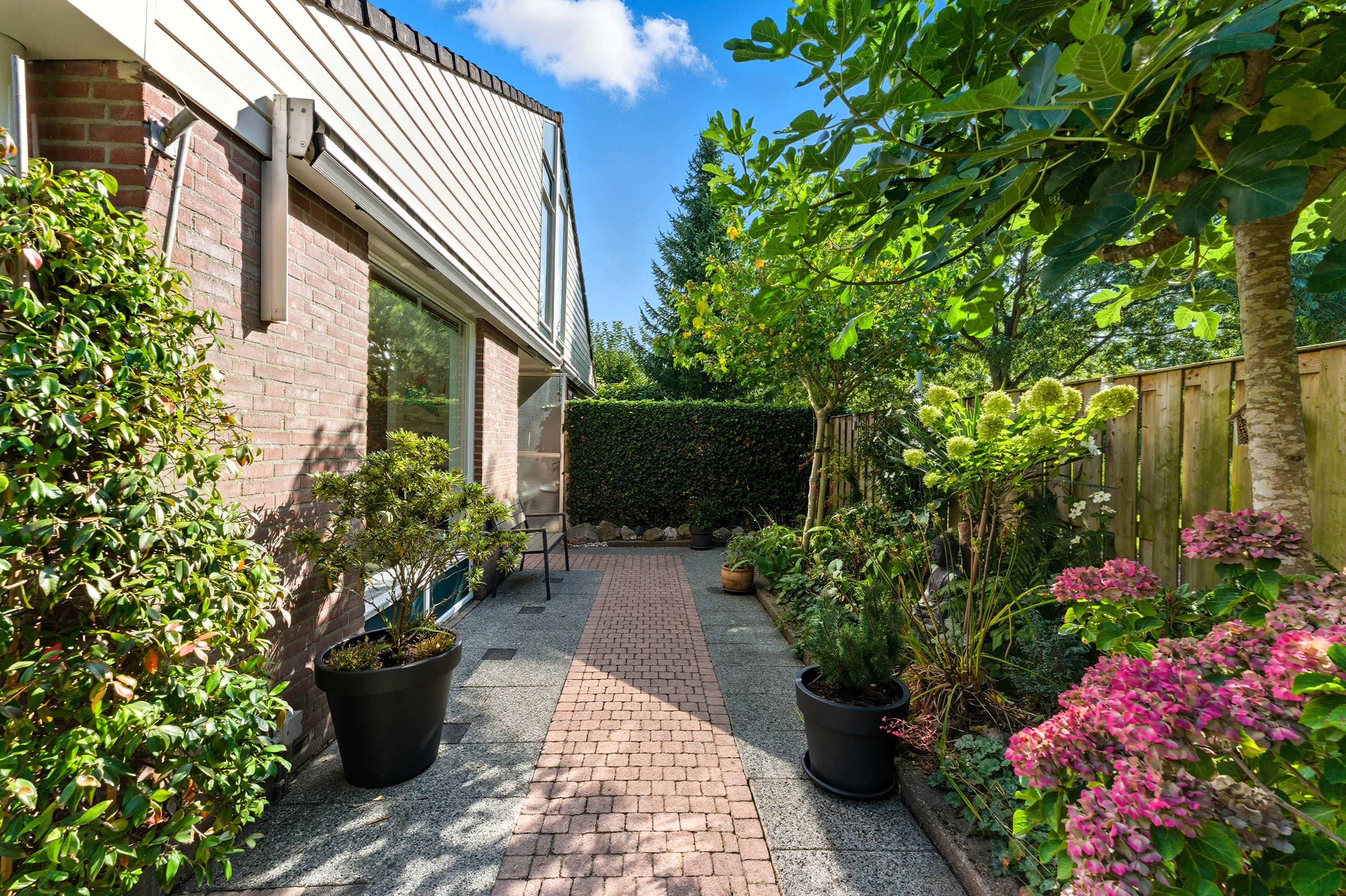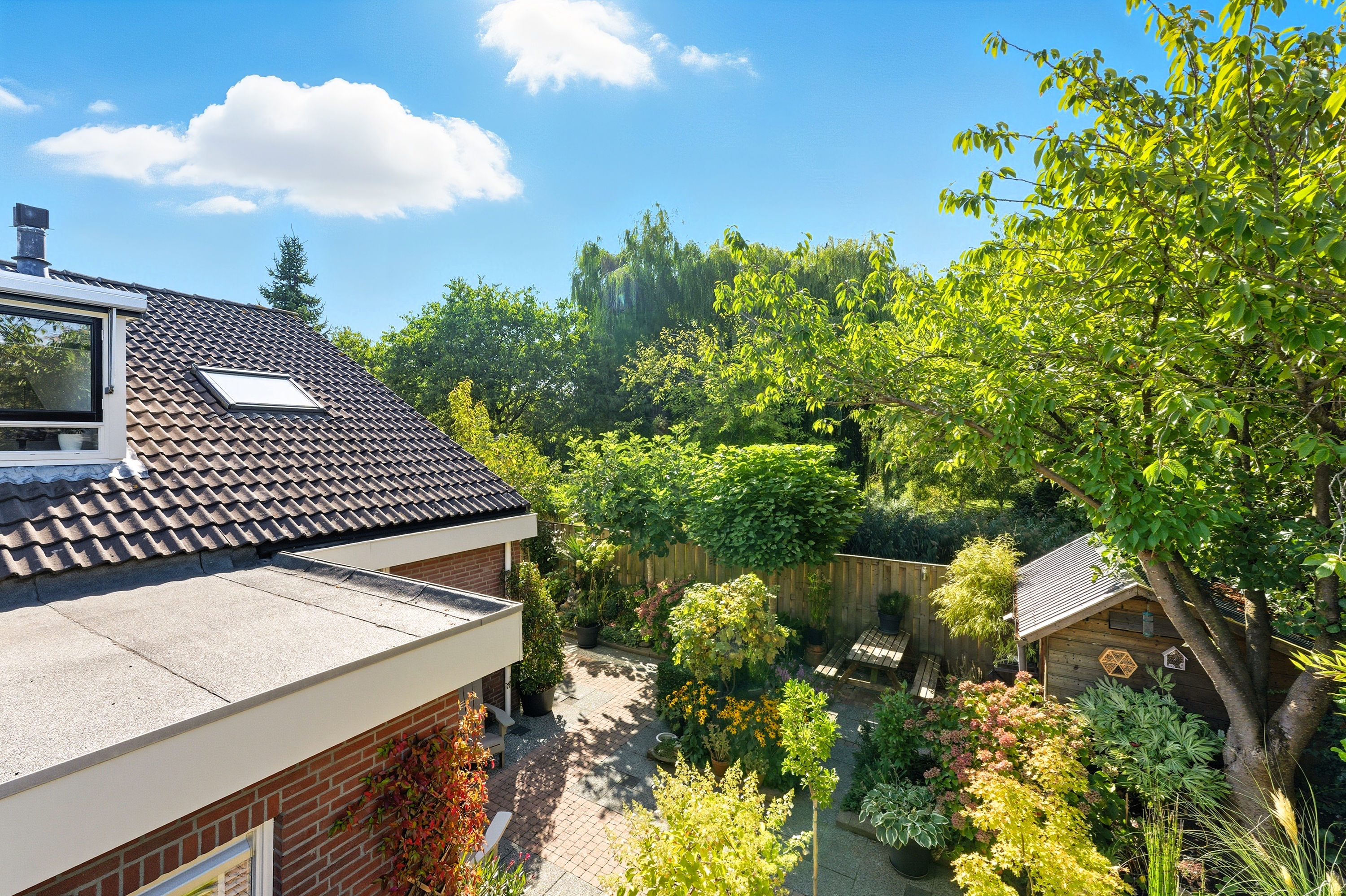 De achtertuin is groen en sfeervol aangelegd met diverse beplanting en terrassen. Doordat de tuin grenst aan een groenstrook geniet je hier van extra privacy en rust. Ook zijn er twee bergingen in de tuin aanwezig.