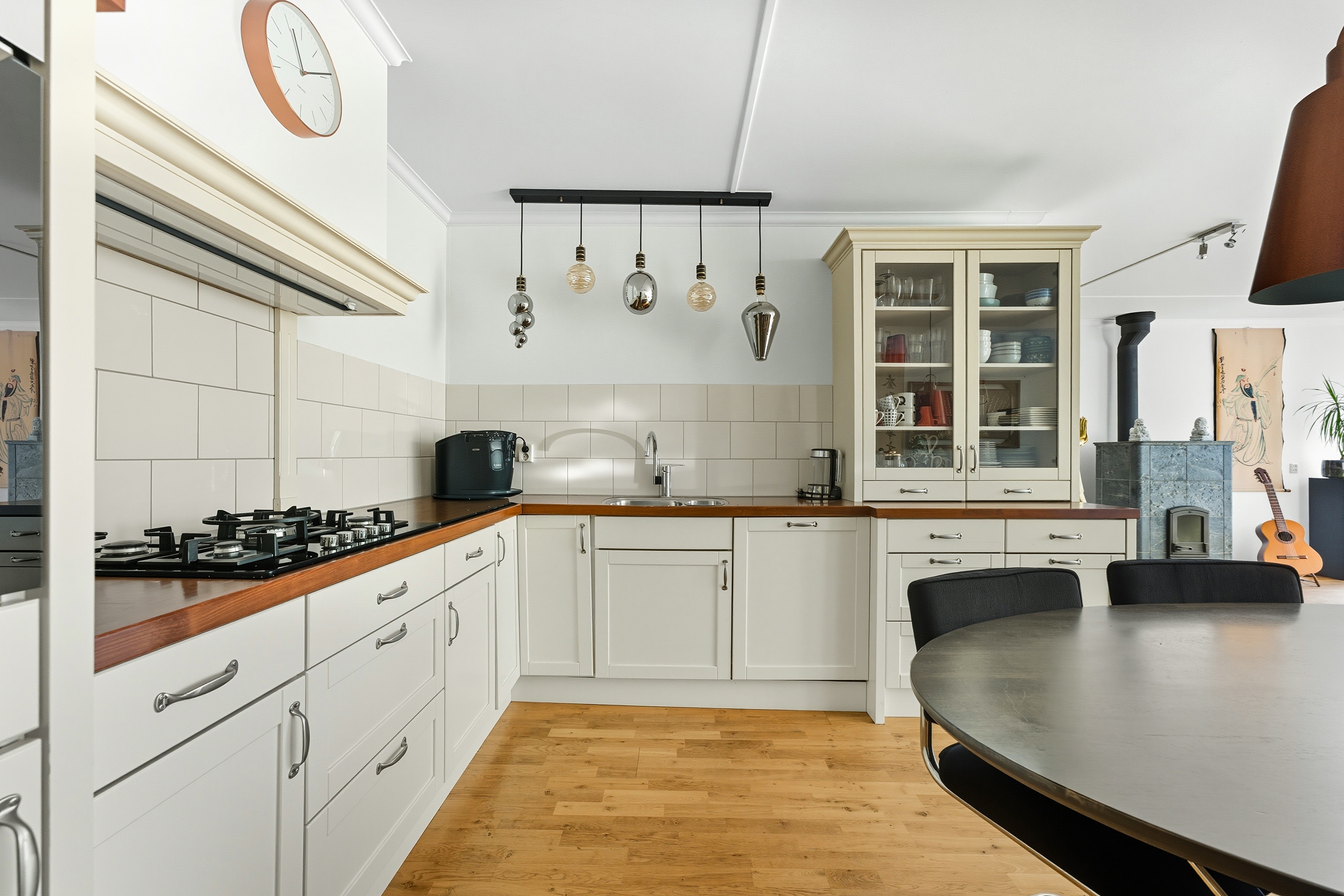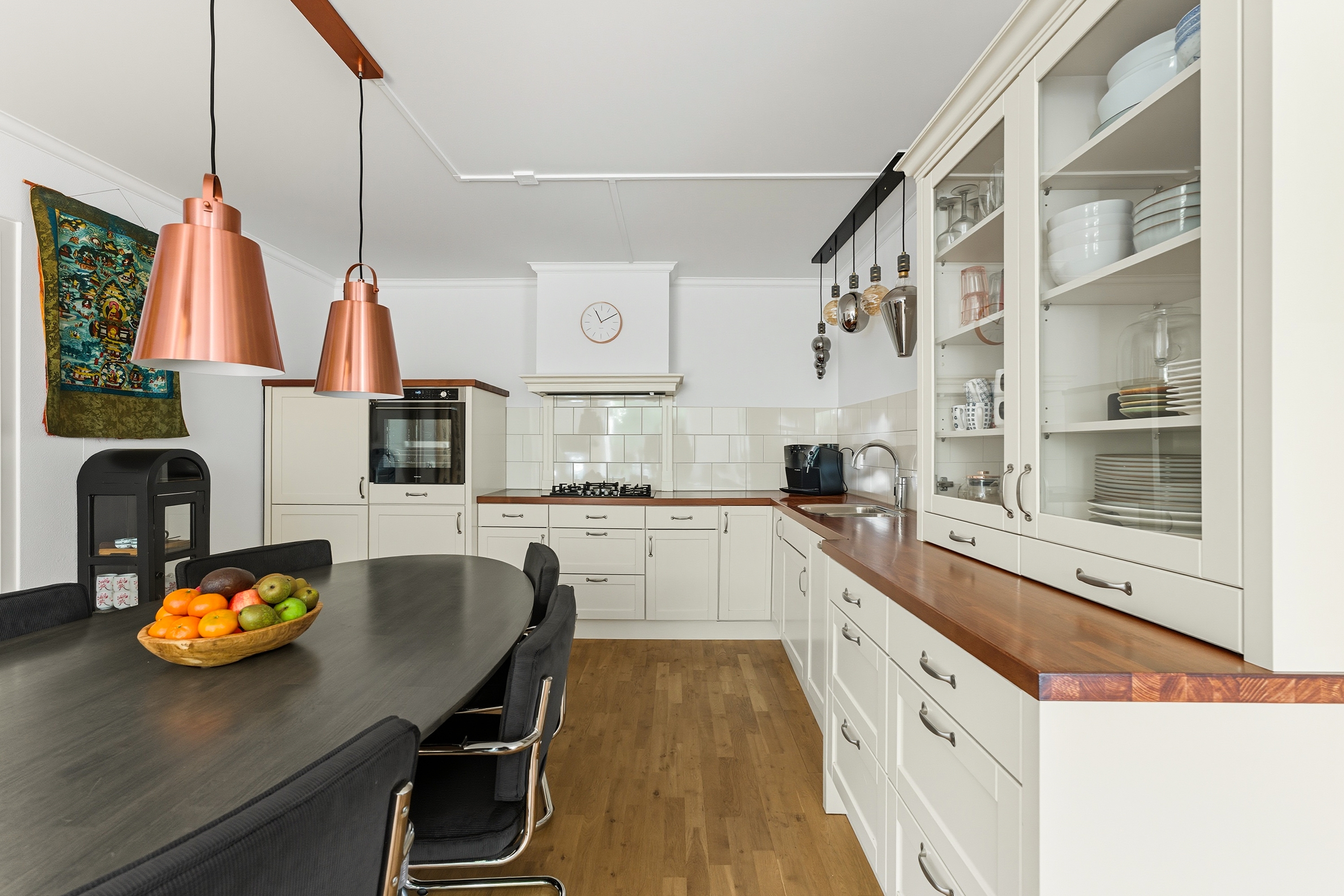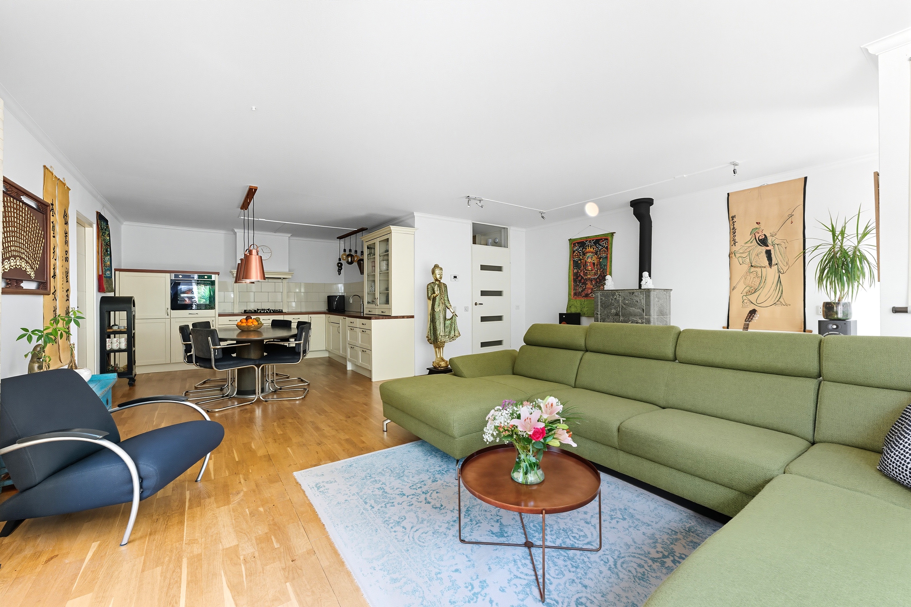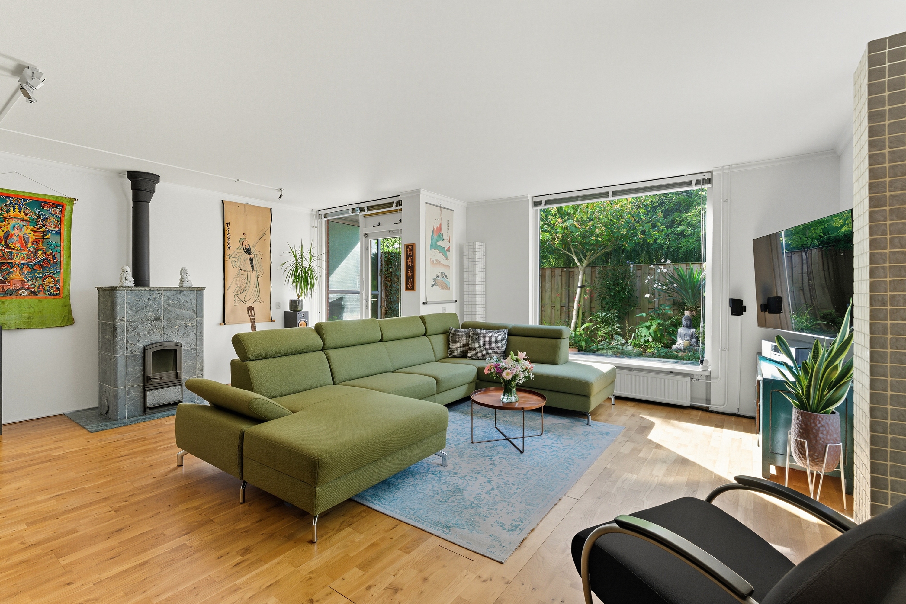 De woonkamer is heerlijk licht dankzij de grote raampartijen en het uitzicht op de groene tuin. De speksteenkachel zorgt voor extra sfeer en warmte in de wintermaanden. De indeling is speels, waardoor je verschillende gezellige zithoeken kunt creëren.