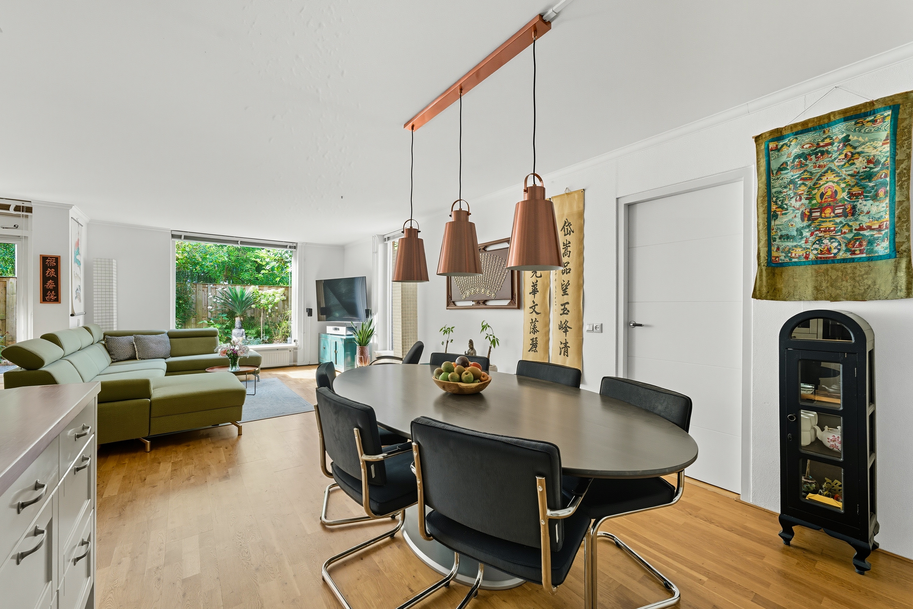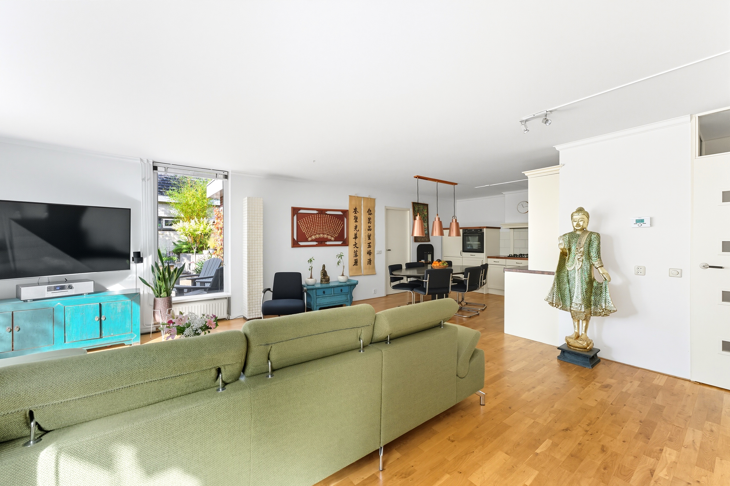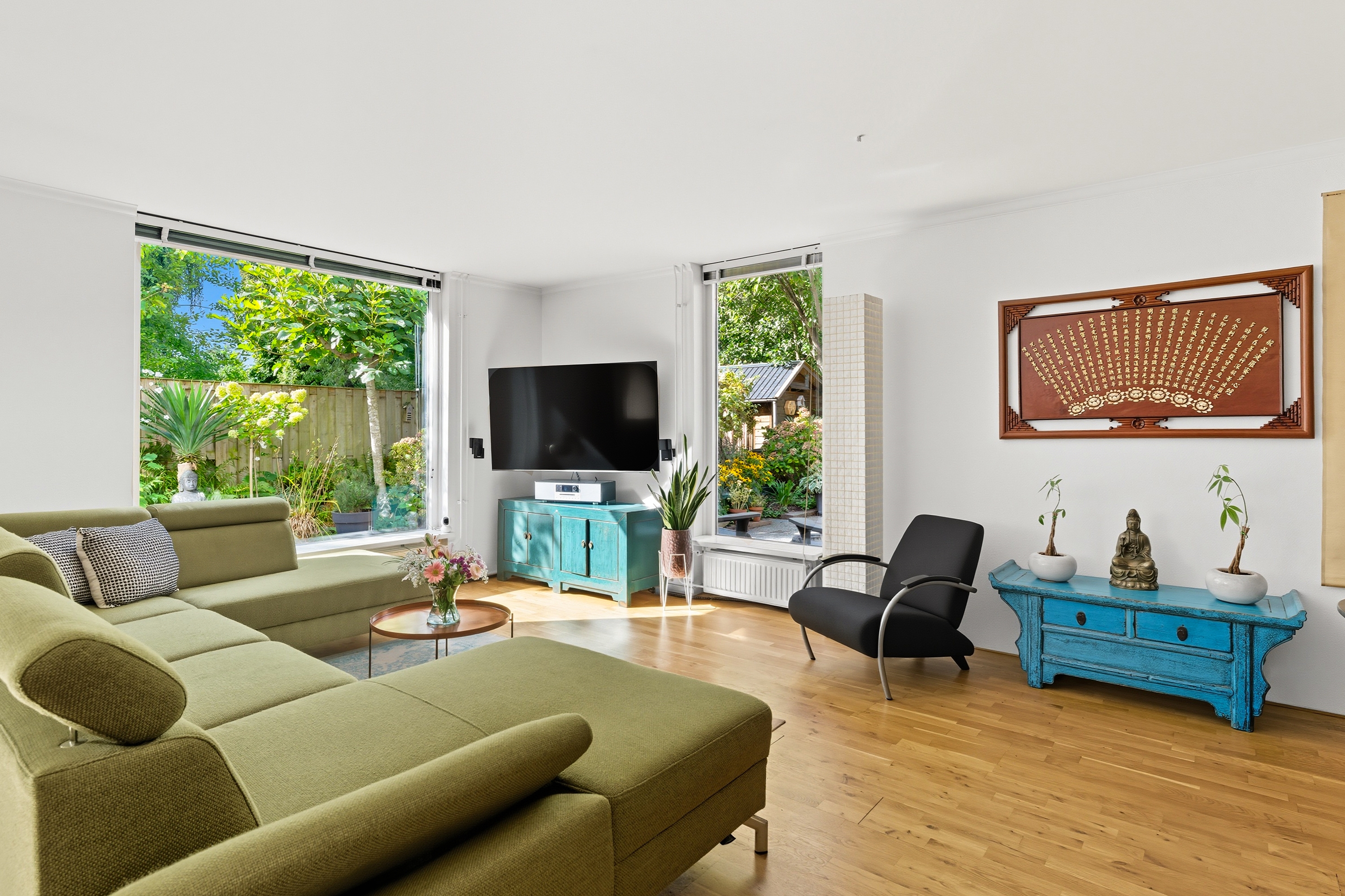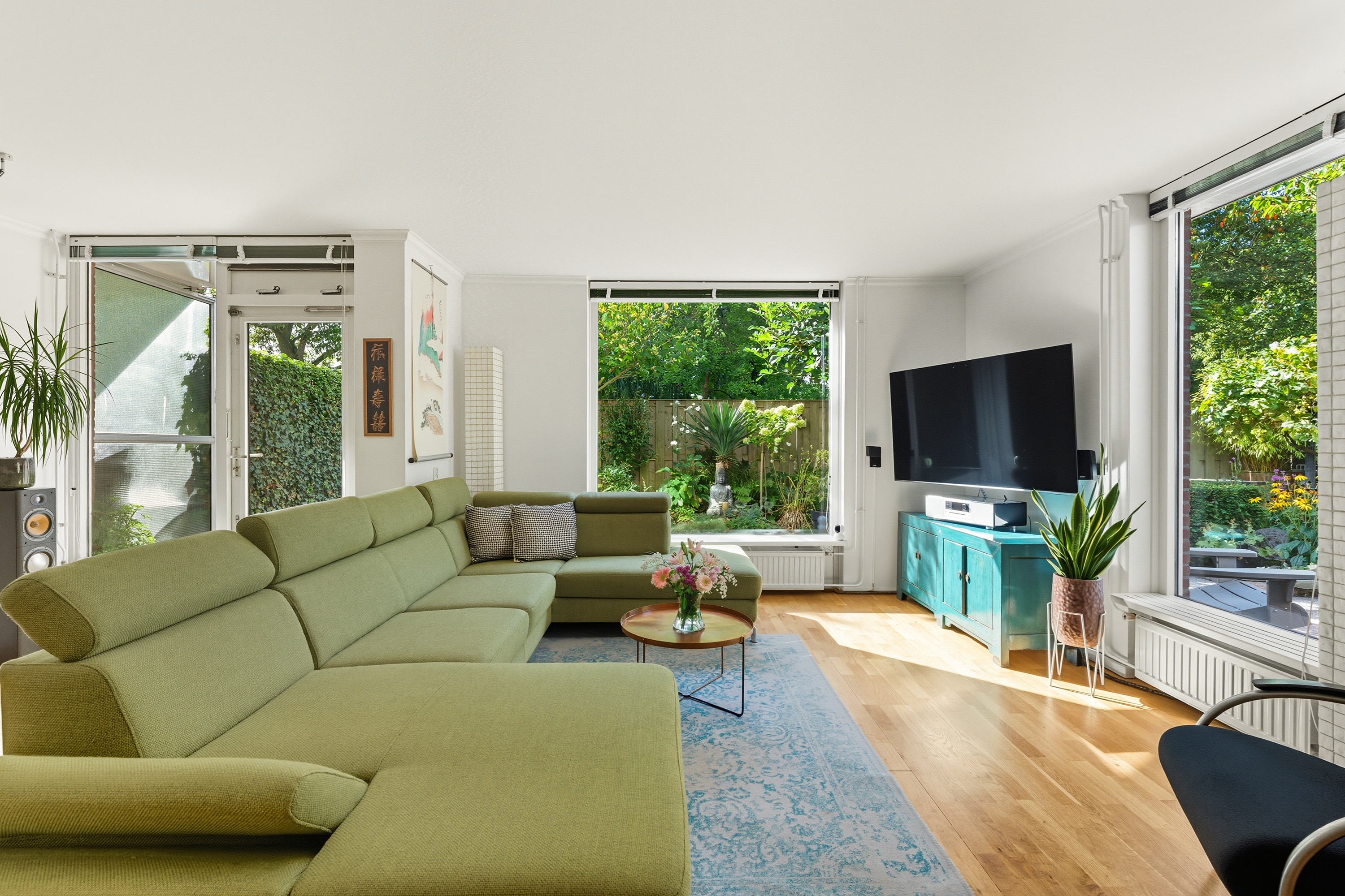 6. Lichte woonkamer met grote raampartijen en uitzicht op het groen;