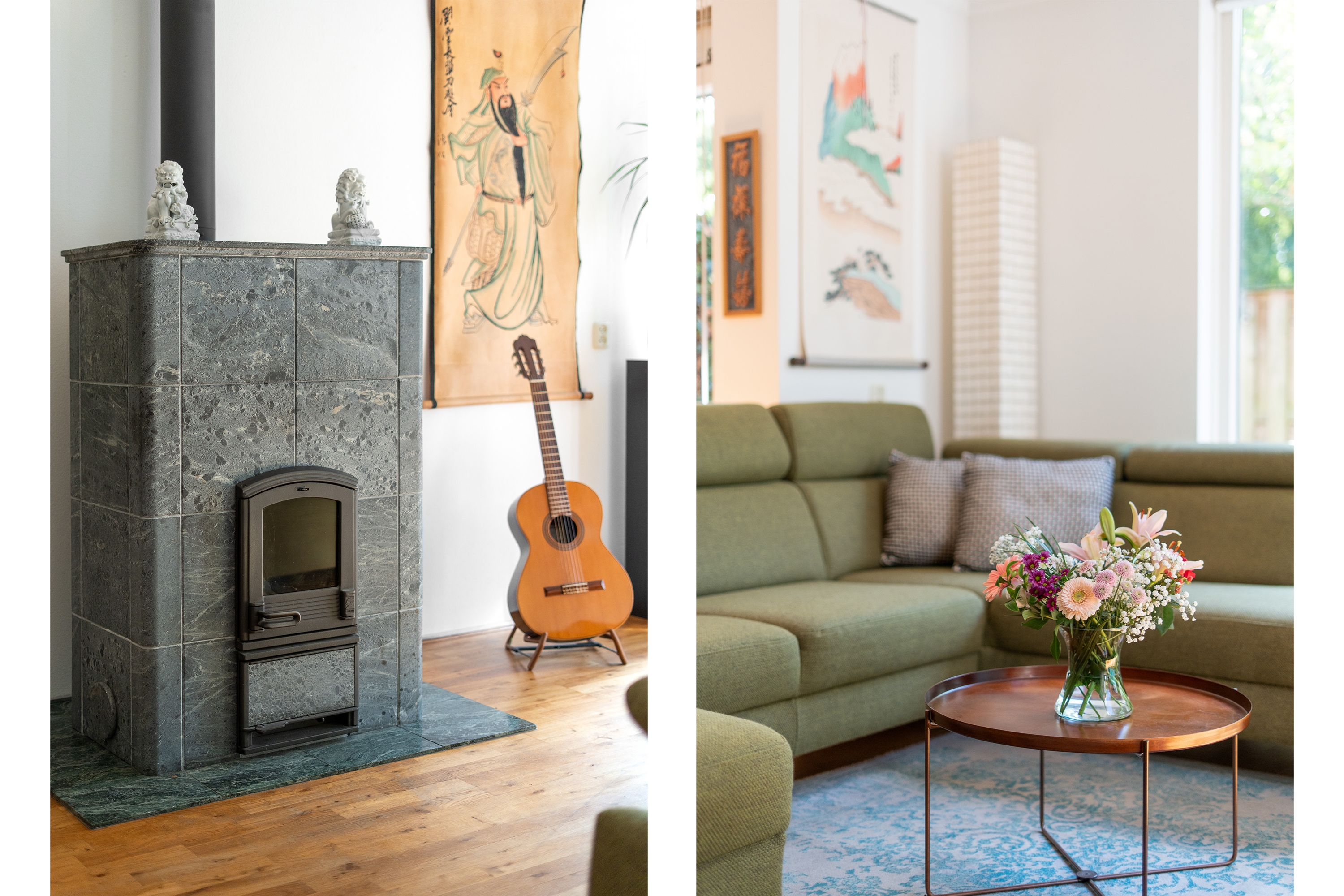 7. Sfeervolle speksteenkachel in de woonkamer;