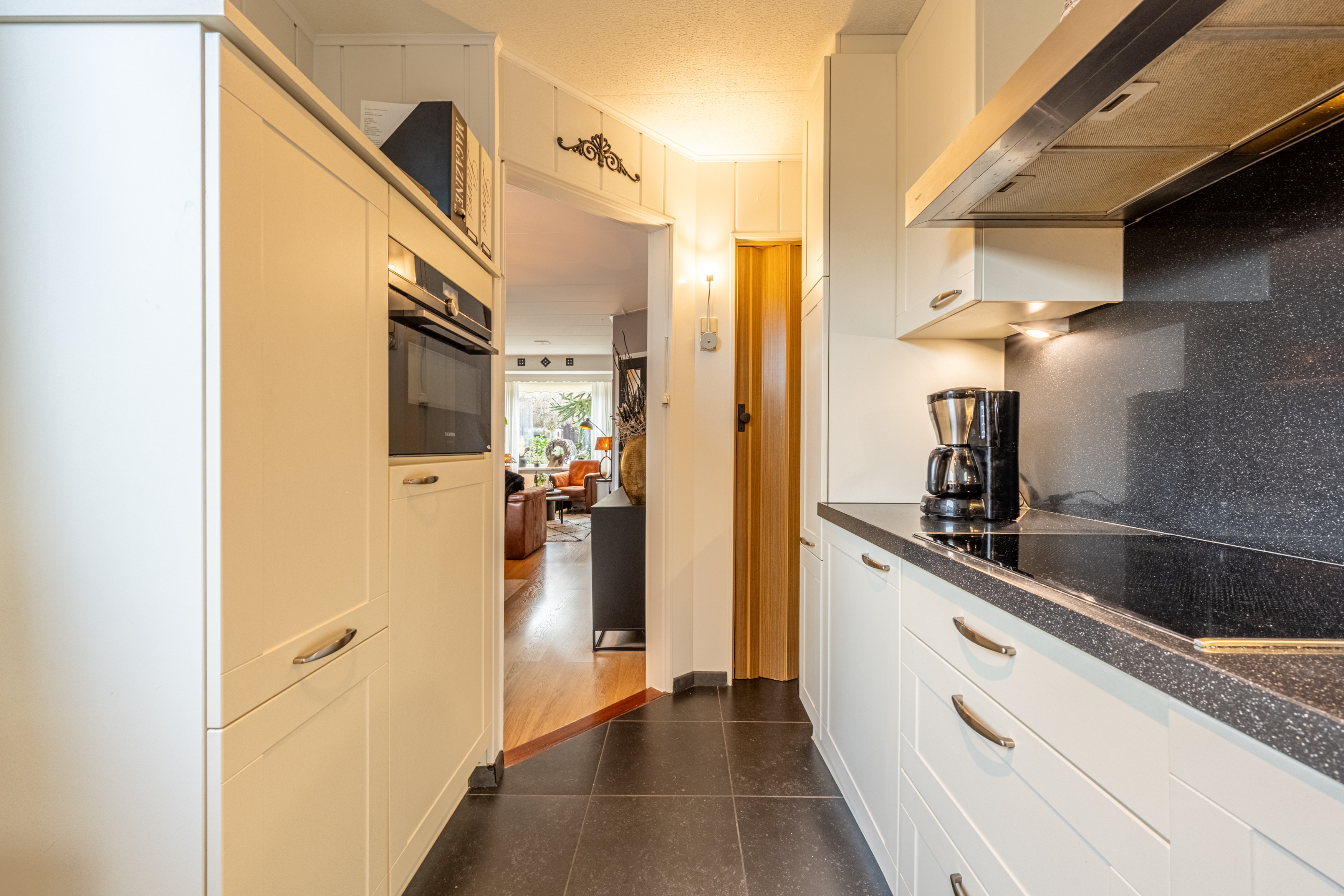 Aan de achterzijde van de woning vind je de keuken, die praktisch en verzorgd is uitgevoerd en voorzien van de benodigde inbouwapparatuur. Extra leuk detail: vanuit de keuken leidt een trapje naar beneden naar een enorme trappenkast/kelder, ideaal voor extra voorraad, opslag of zelfs een wijnkast.