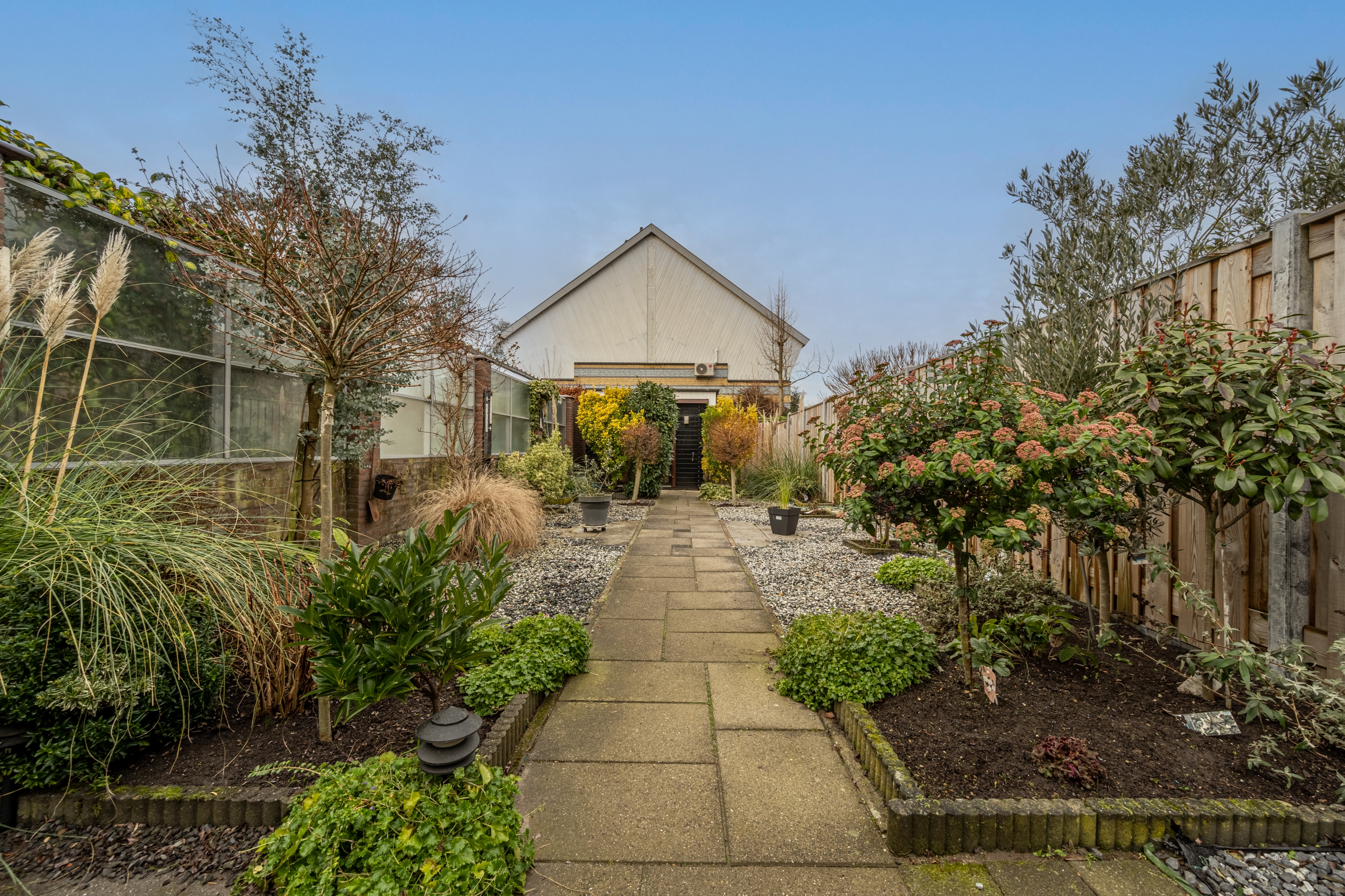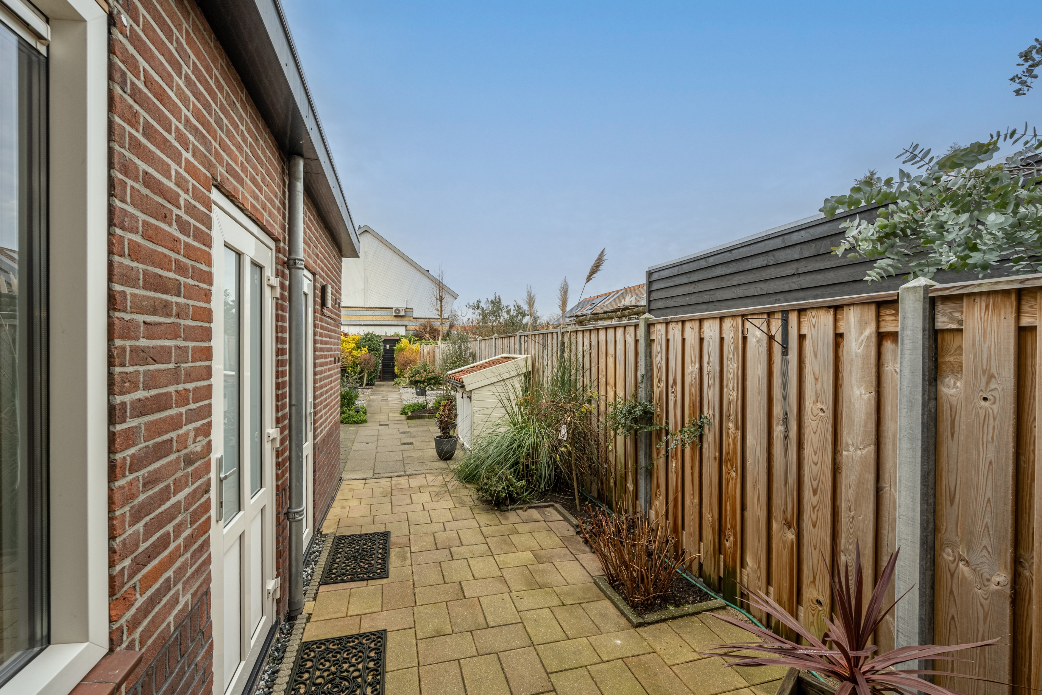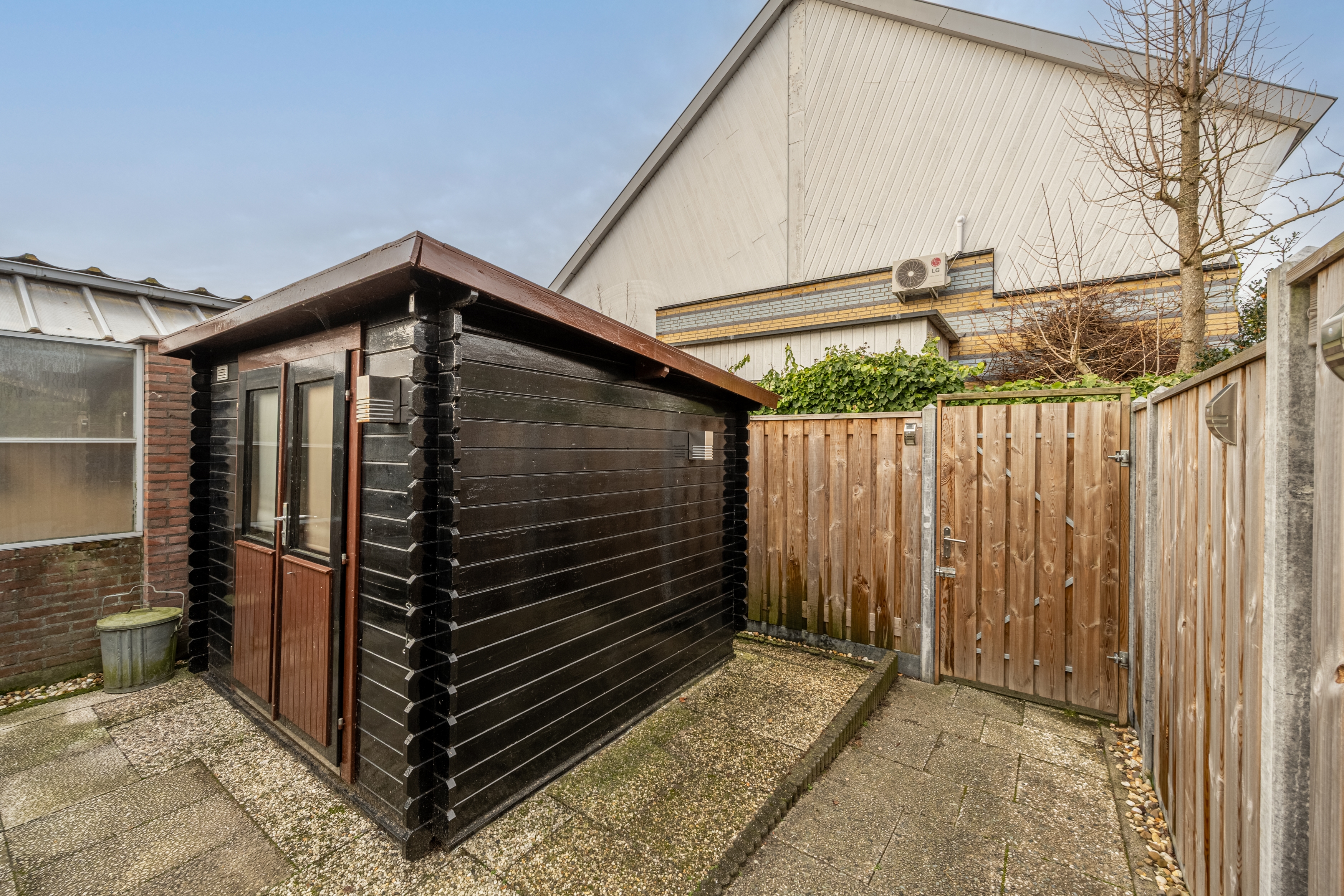 Via de achterzijde stap je zo de diepe achtertuin in. Deze tuin is met zorg aangelegd en in 2025 opnieuw bestraat, waardoor het geheel strak en onderhoudsvriendelijk is. Je vindt hier meerdere fijne plekken om te zitten én er is volop praktische bergruimte aanwezig. Achter in de tuin staan een schuur en een extra blokhut – ideaal voor fietsen, gereedschap en hobbyspullen – en bovendien is er stroom aanwezig.