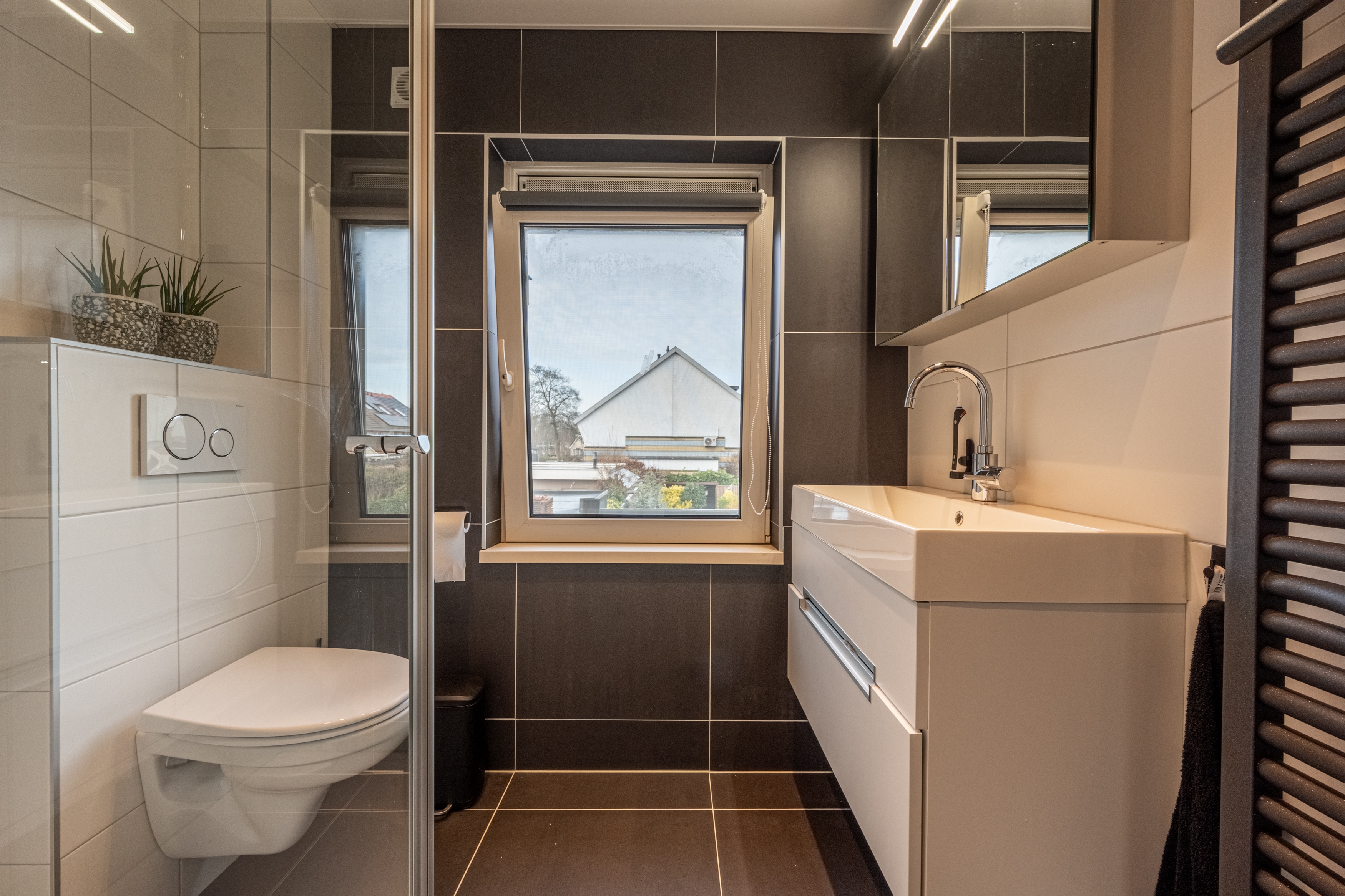 De badkamer is gerenoveerd in 2021 en netjes ingericht en voorzien van een douche, wastafel en toilet. Een fijne ruimte waar je de dag fris begint en ontspannen afsluit.
