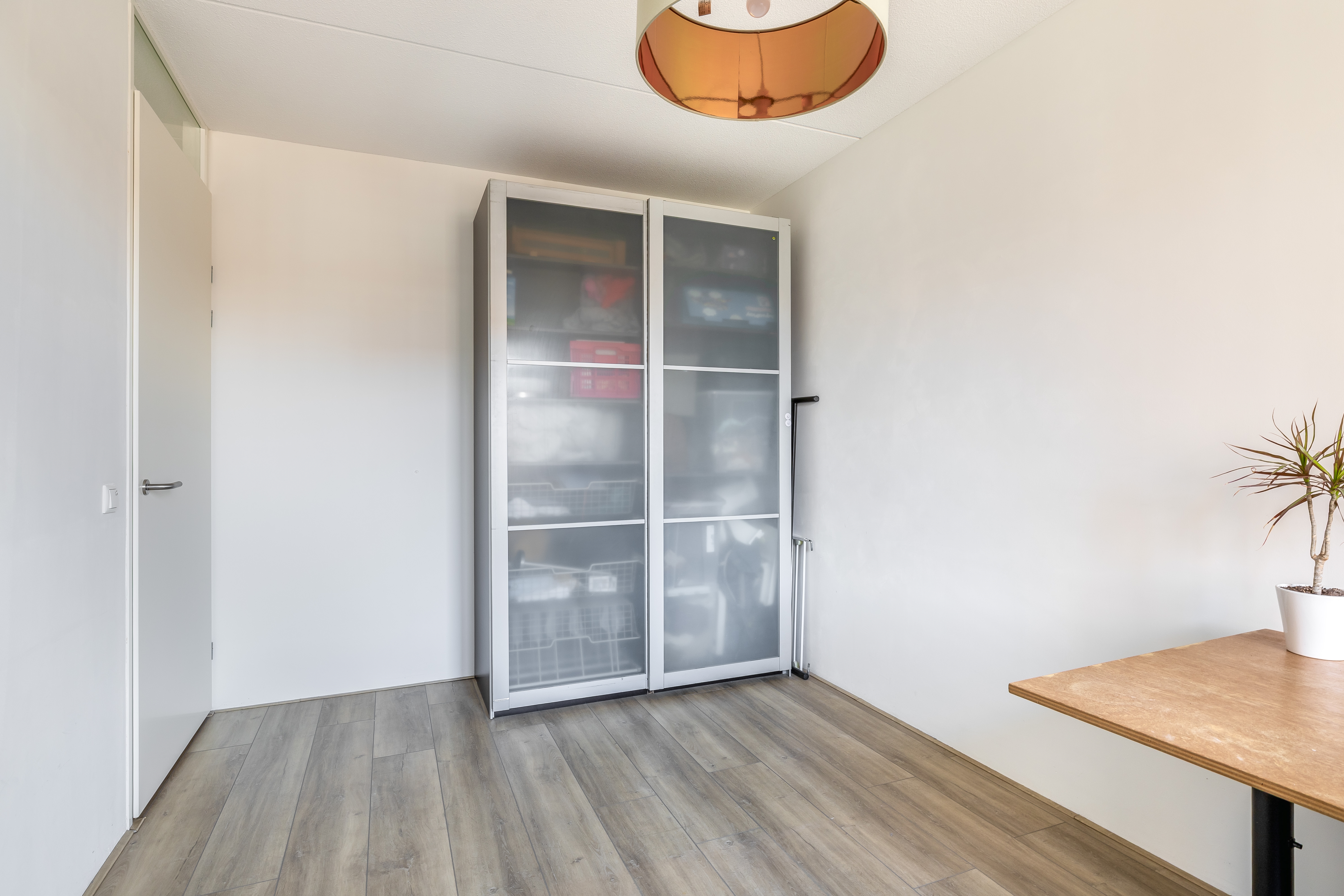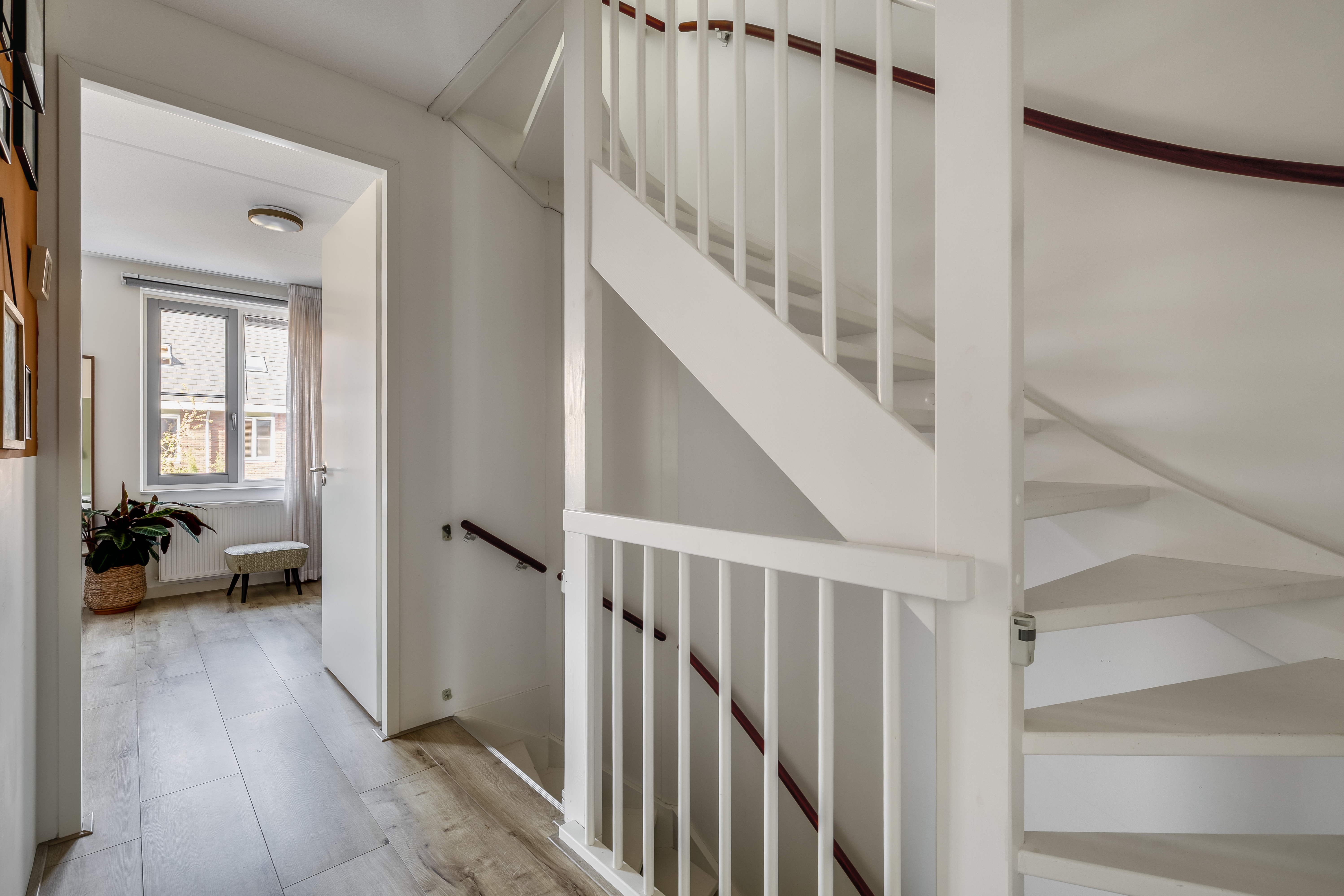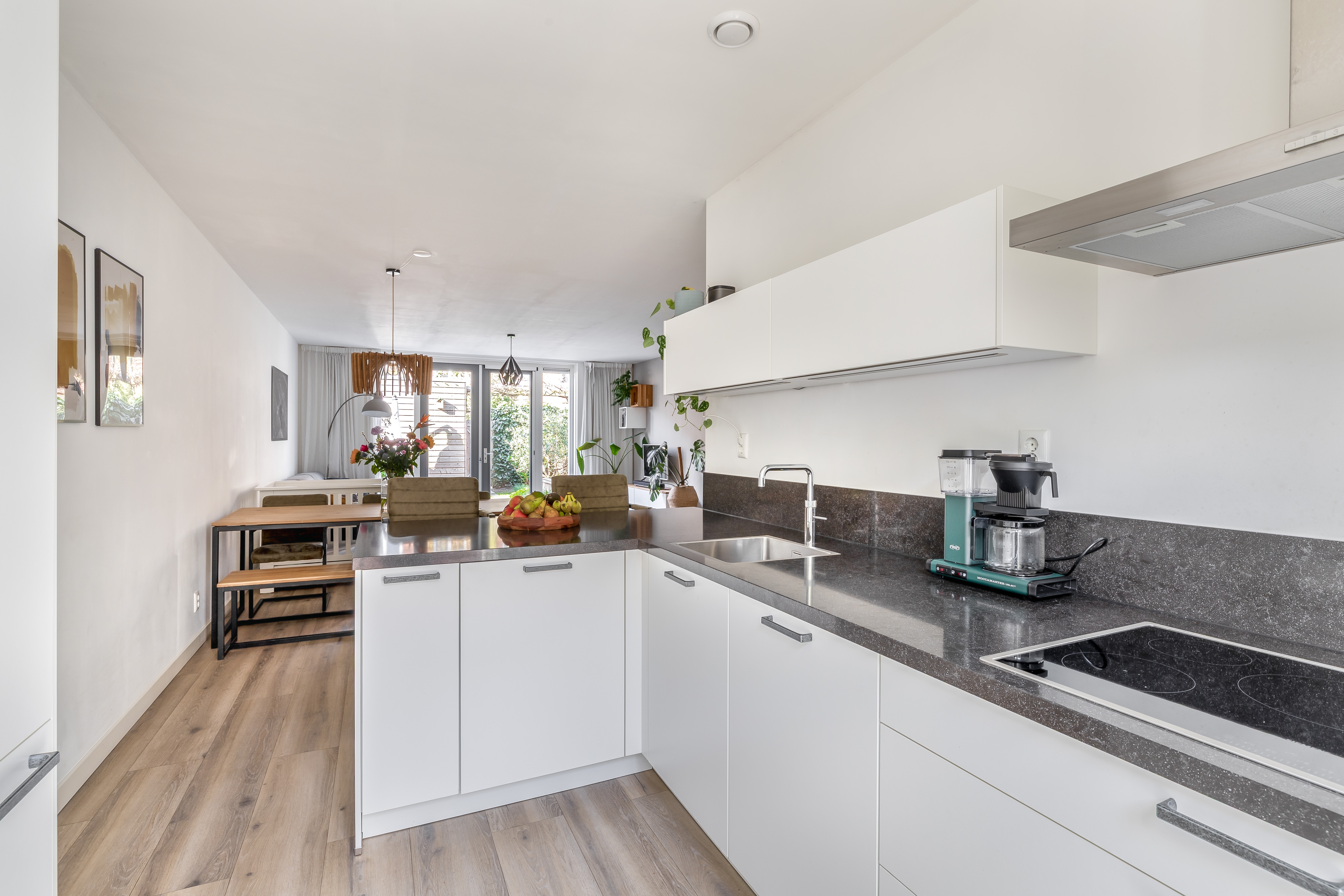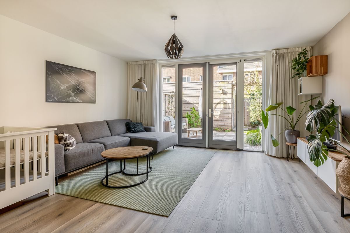 De tuingerichte woonkamer is lekker licht en ruim opgezet. Dankzij de openslaande deuren haal je buiten echt naar binnen en loop je zo de zonnige achtertuin in, gelegen op het zuidwesten. De begane grond is strak afgewerkt met gestucte wanden en plafonds en voorzien van vloerverwarming.