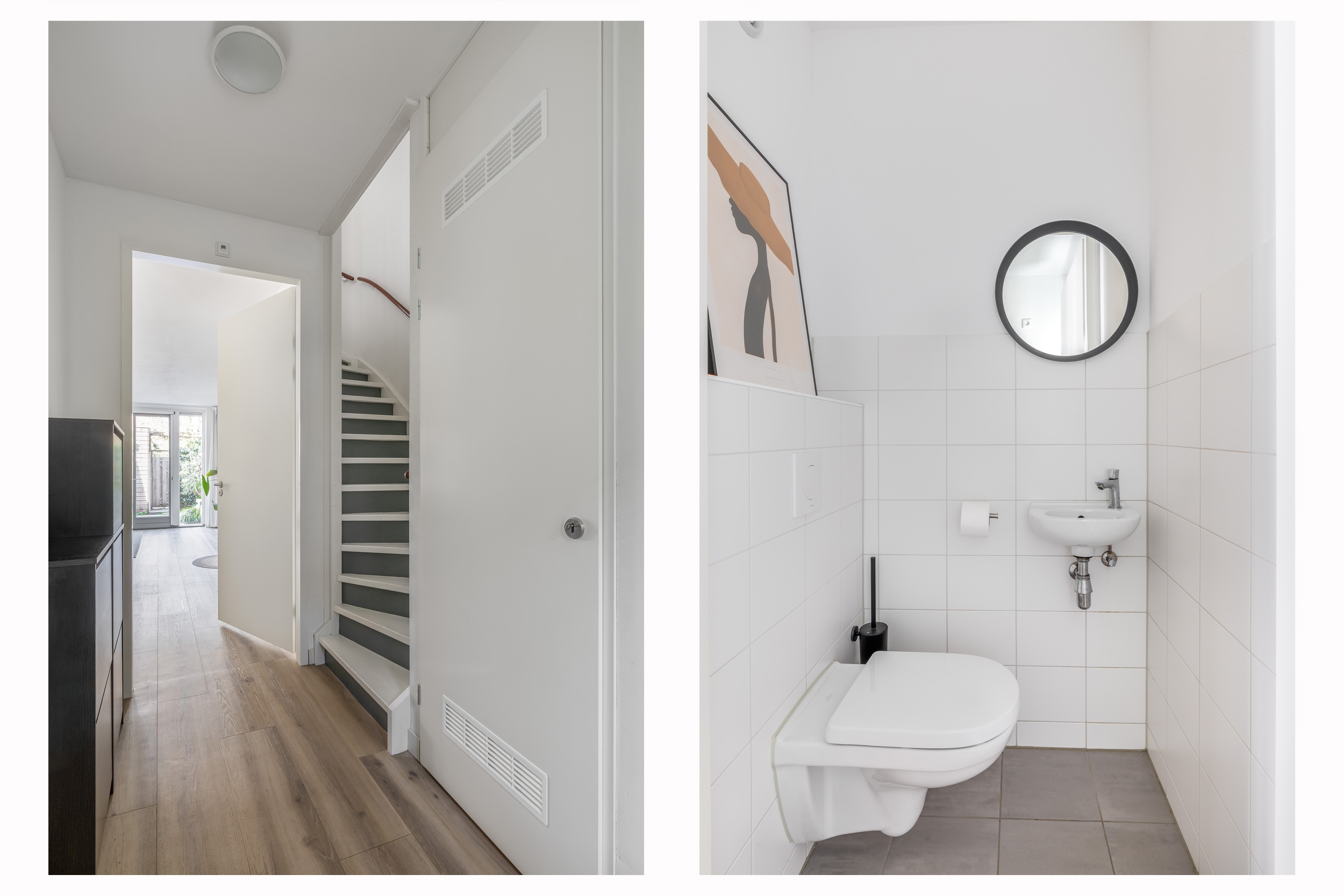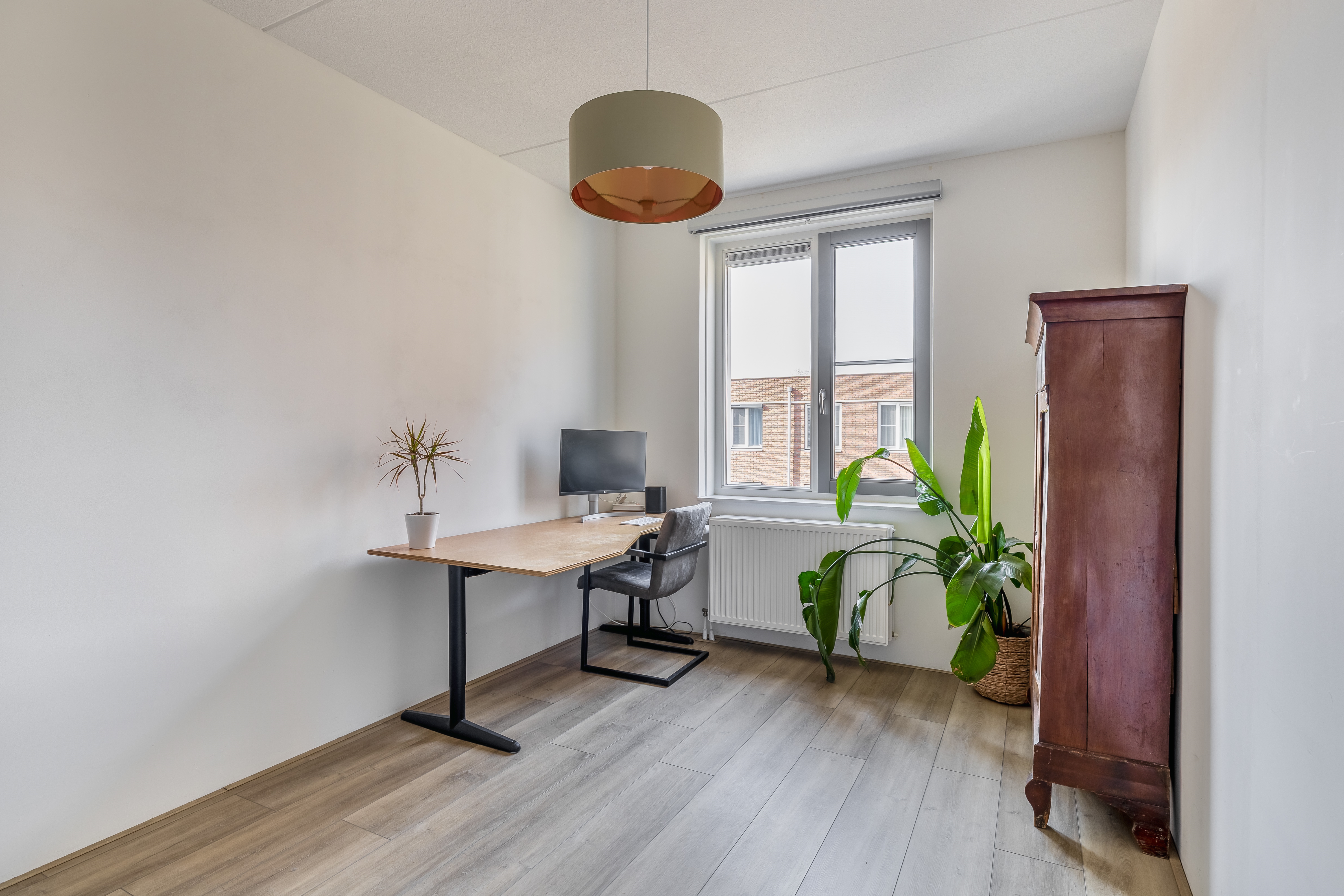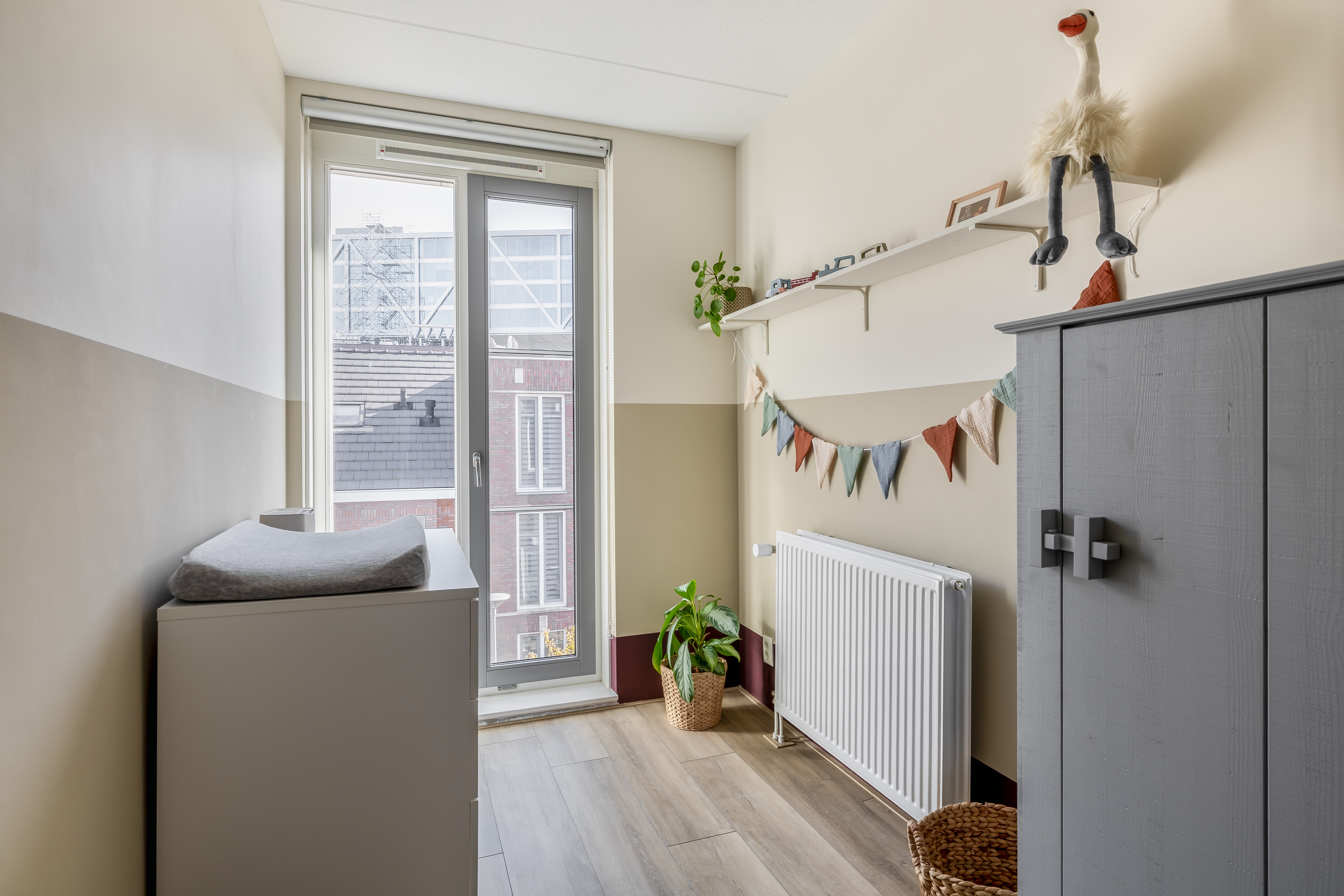 De tuingerichte woonkamer is lekker licht en ruim opgezet. Dankzij de openslaande deuren haal je buiten echt naar binnen en loop je zo de zonnige achtertuin in, gelegen op het zuidwesten. De begane grond is strak afgewerkt met gestucte wanden en plafonds en voorzien van vloerverwarming.