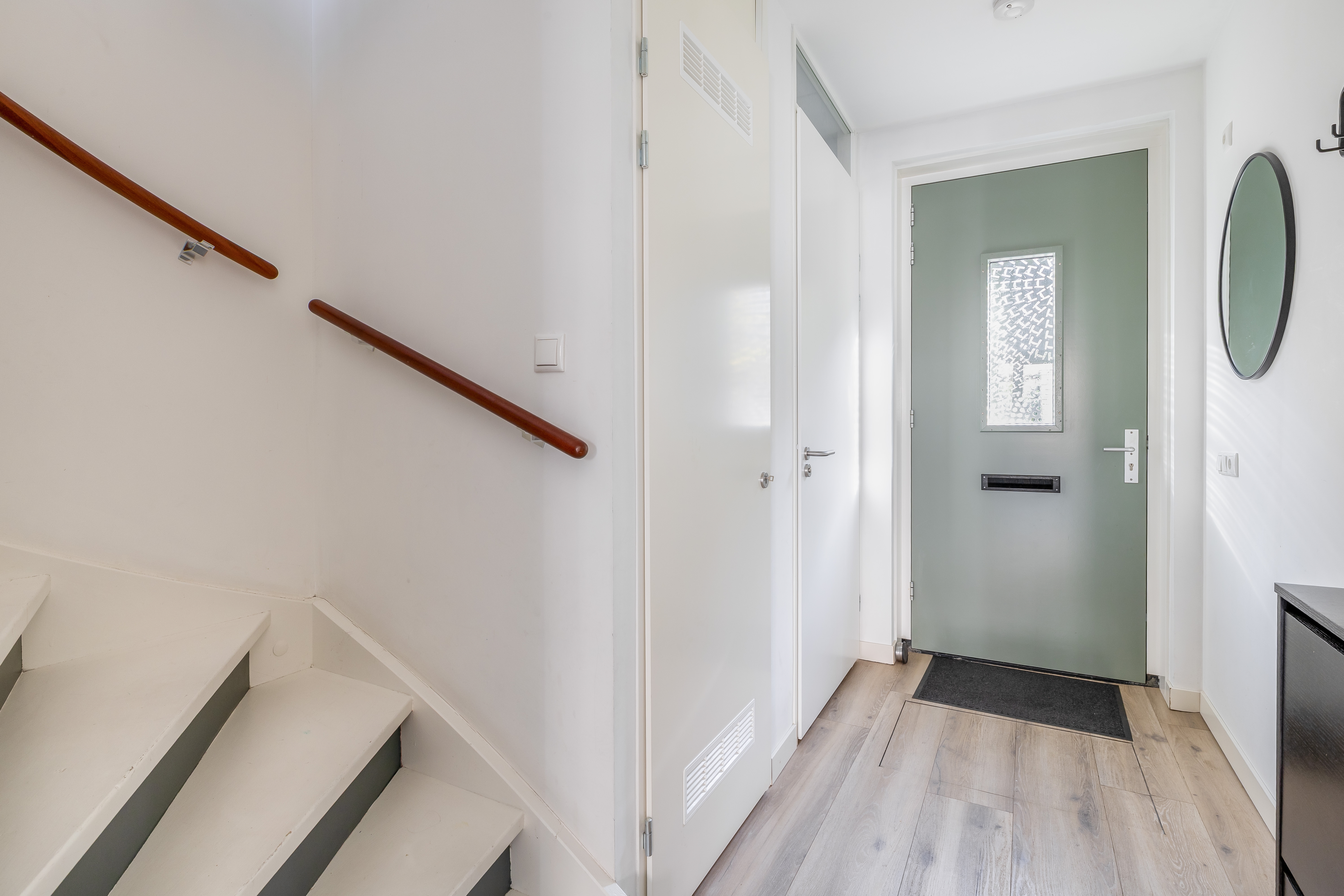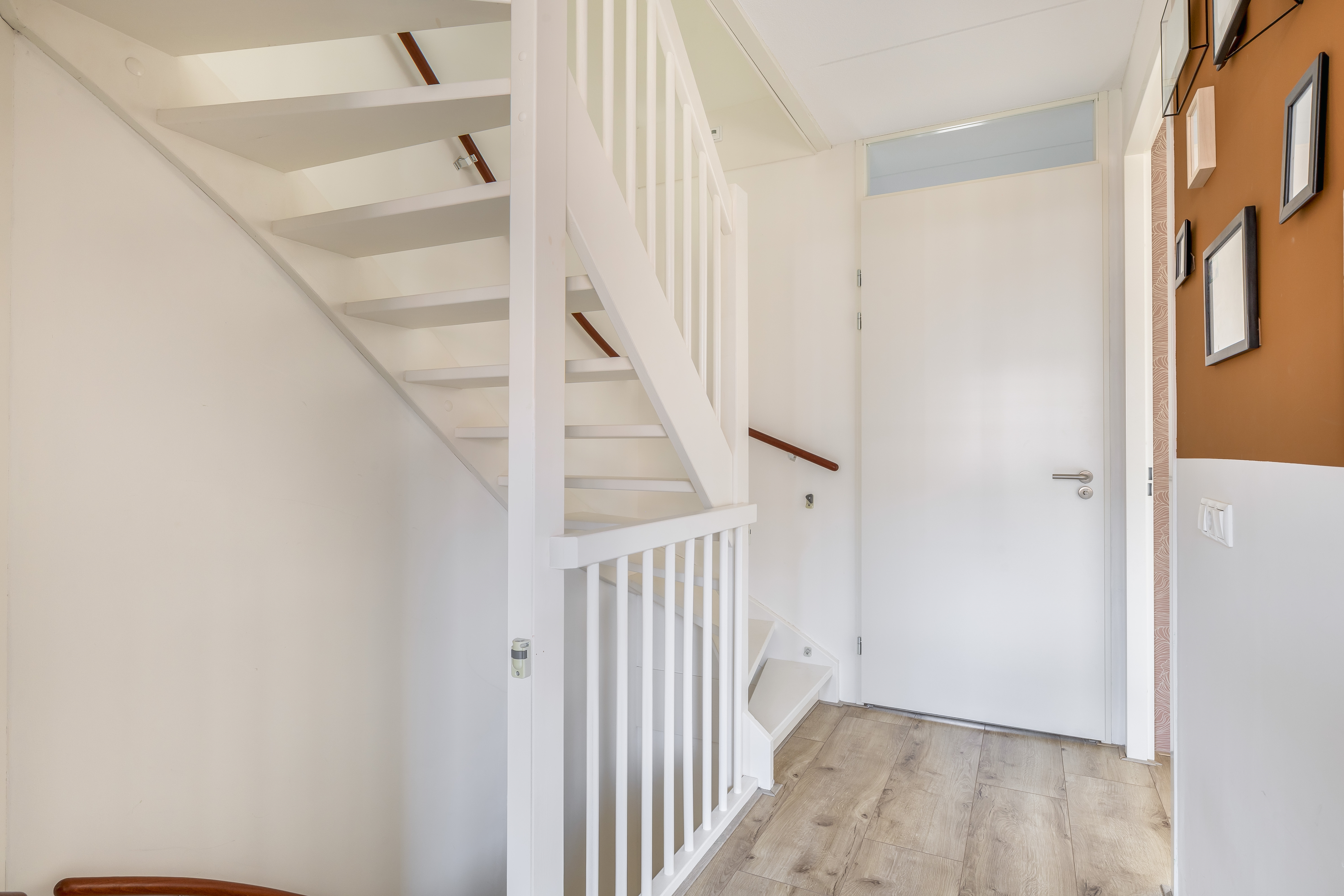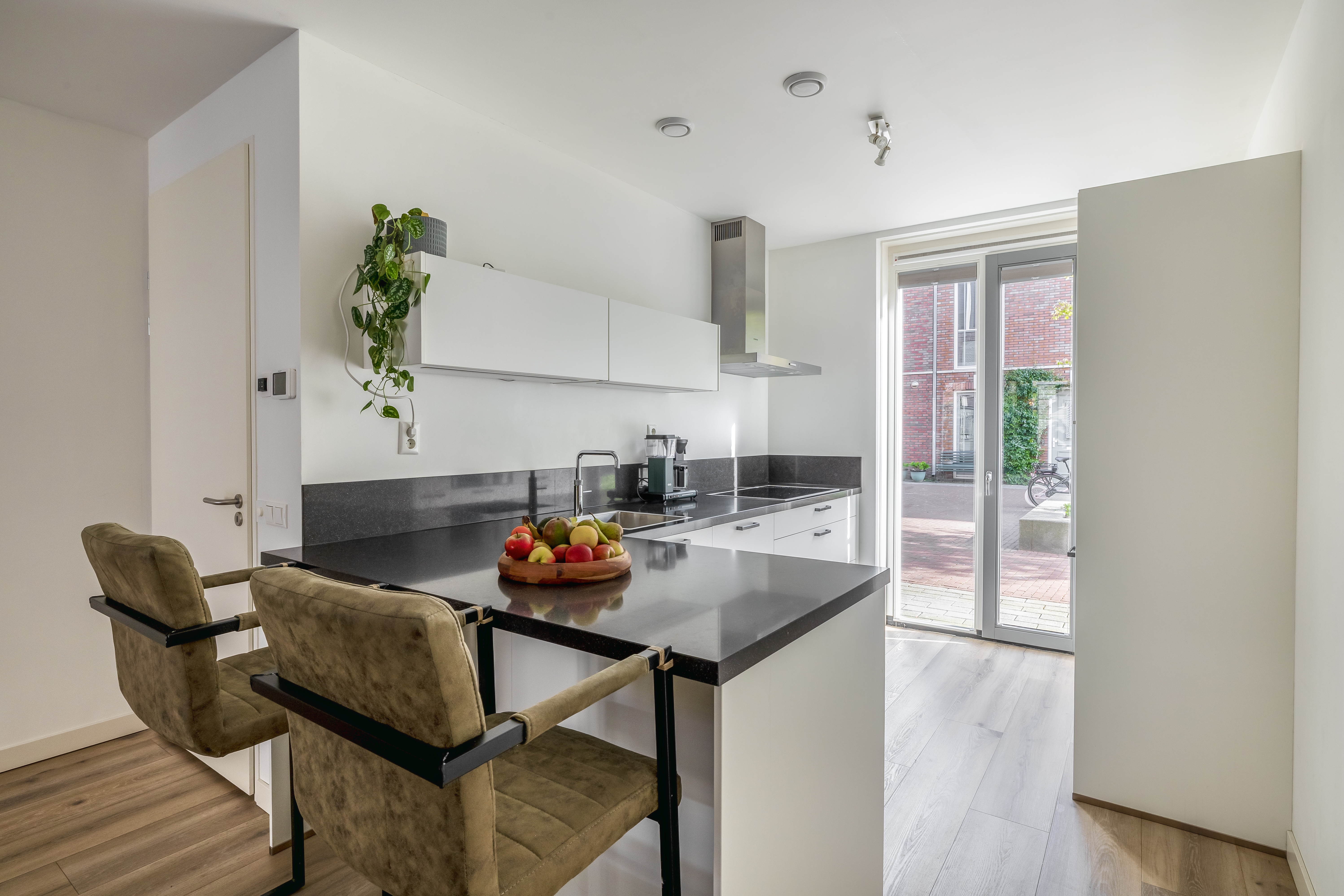 Je komt binnen in de hal met meterkast en modern toilet. Vanuit hier loop je door naar de open keuken aan de voorzijde, uitgevoerd met een strak schiereiland en veel werk- en kastruimte – een heerlijke plek voor kookliefhebbers!