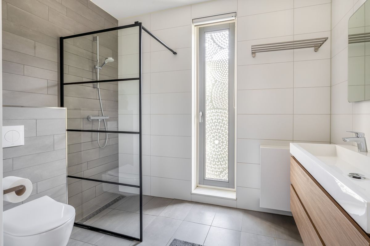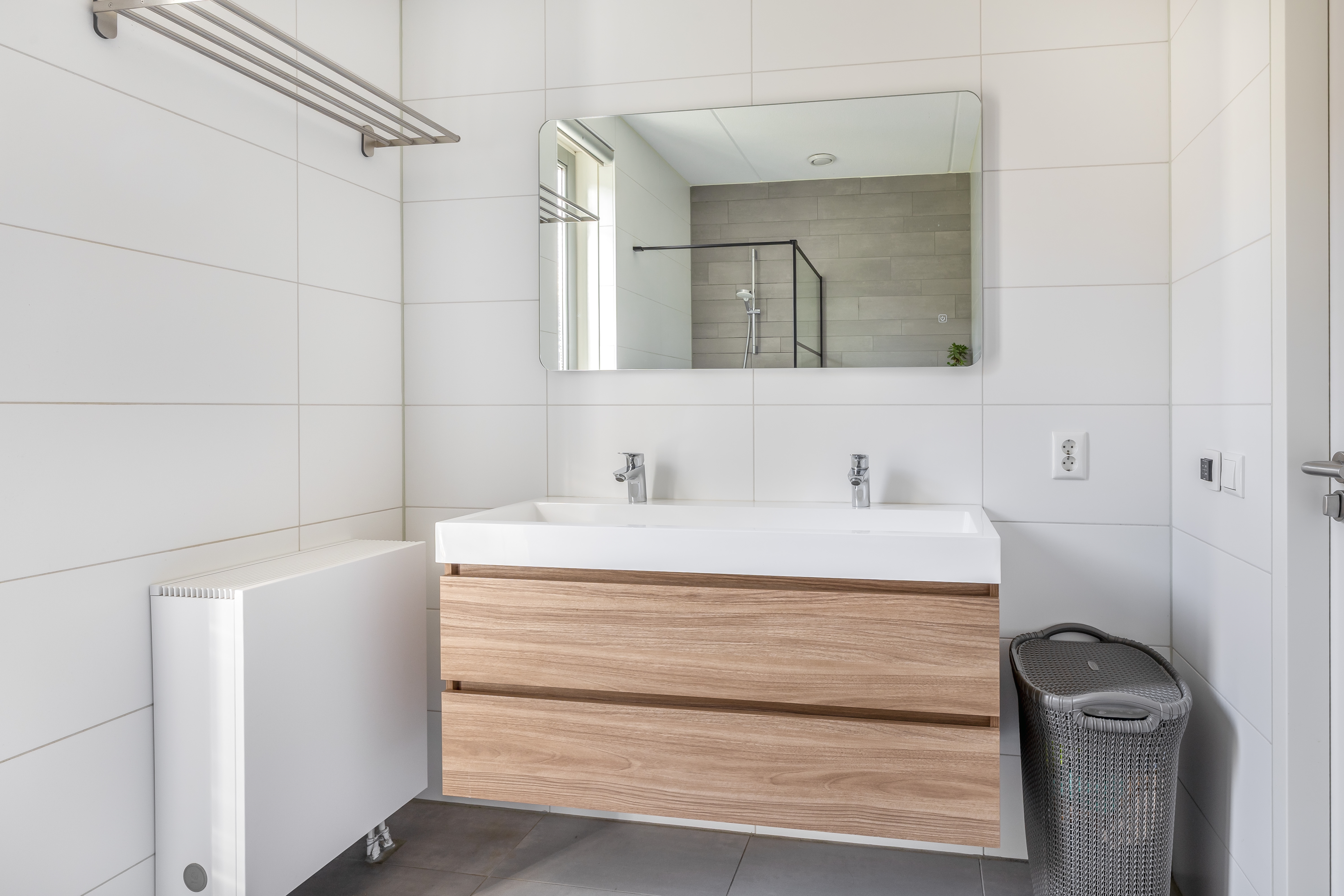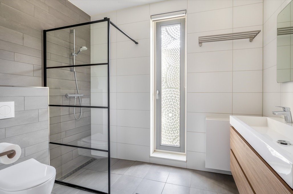 De badkamer is compleet uitgevoerd met een inloopdouche, hangend toilet en een dubbel wastafelmeubel en biedt alles wat je nodig hebt voor een frisse start van de dag.