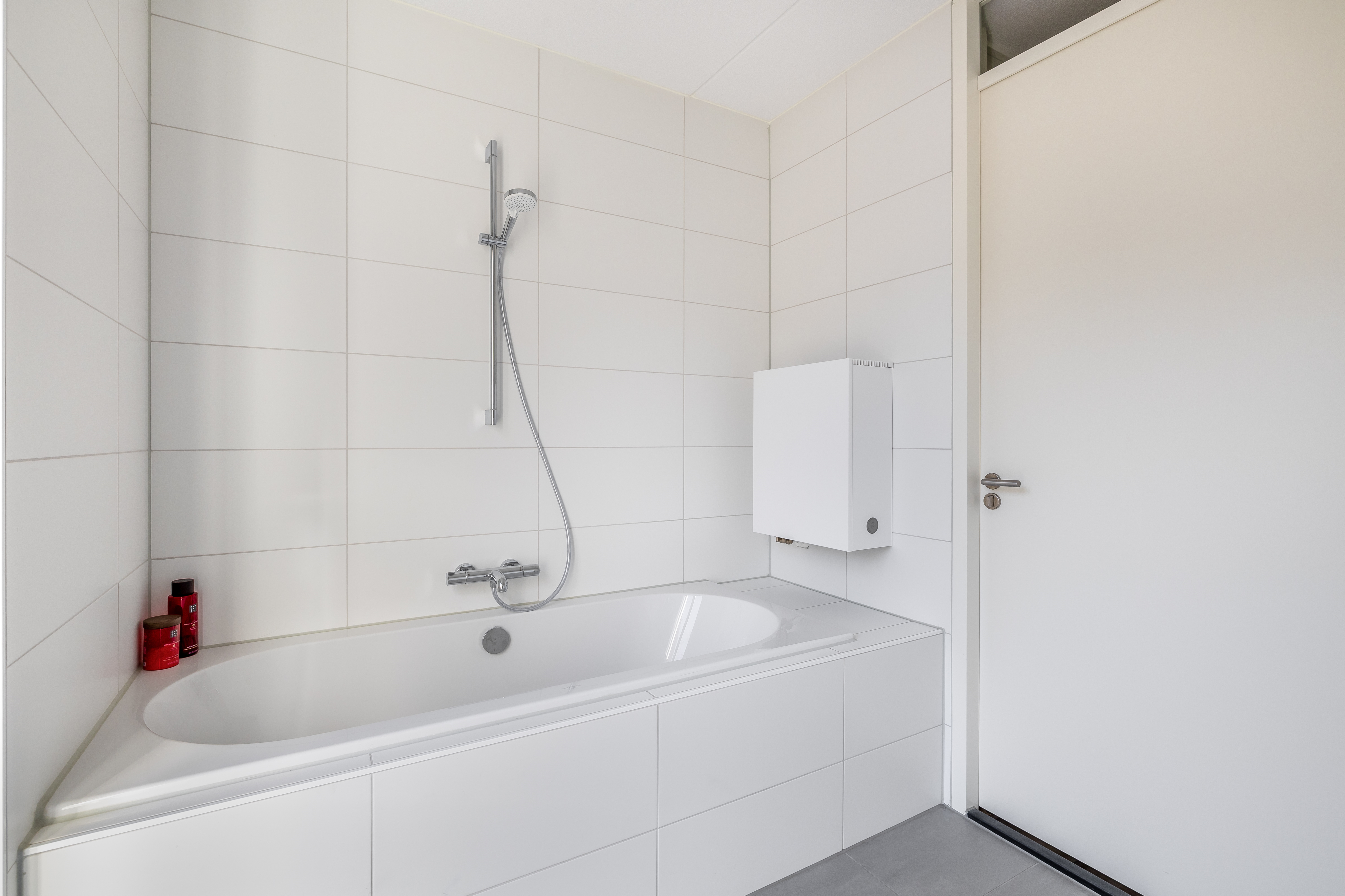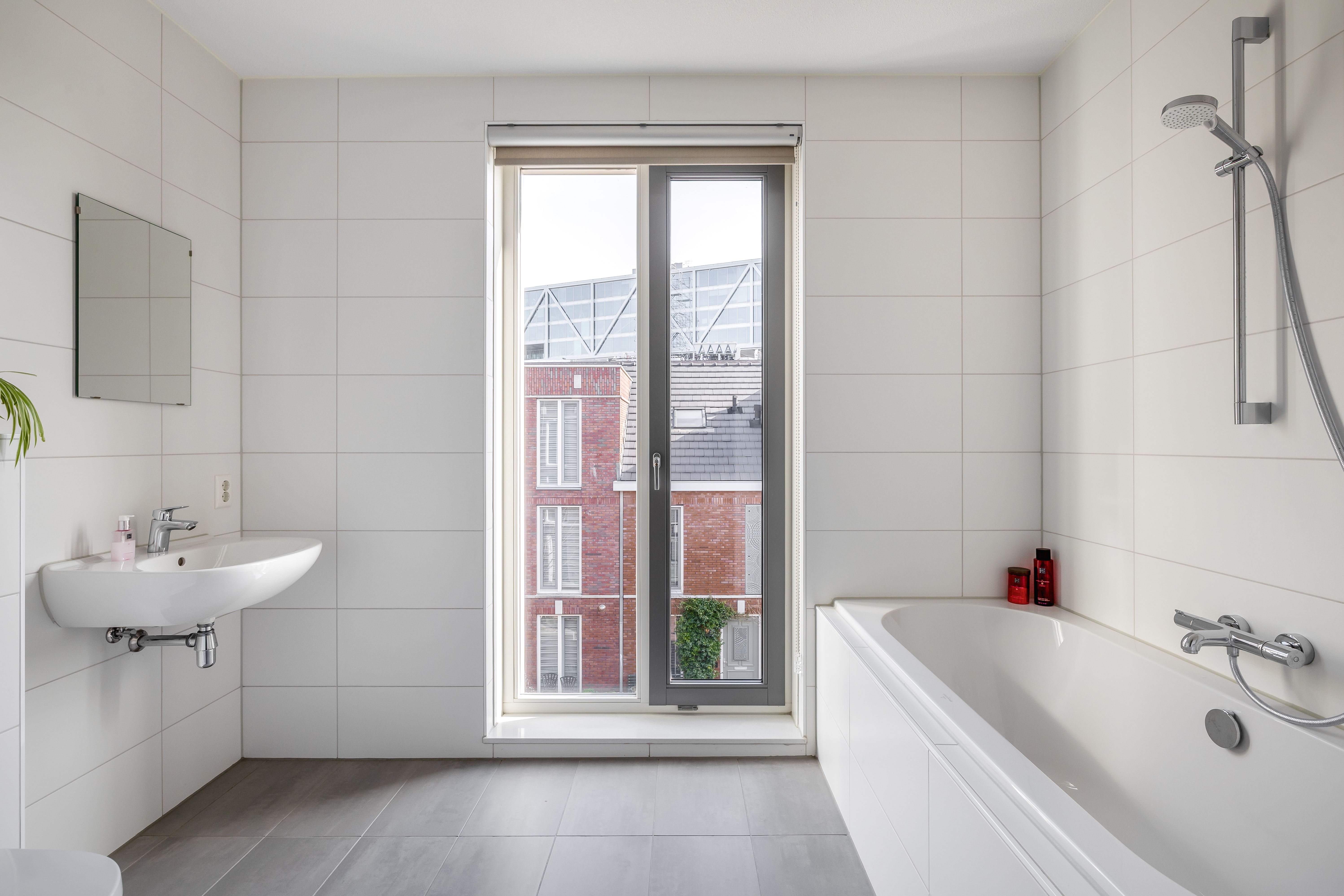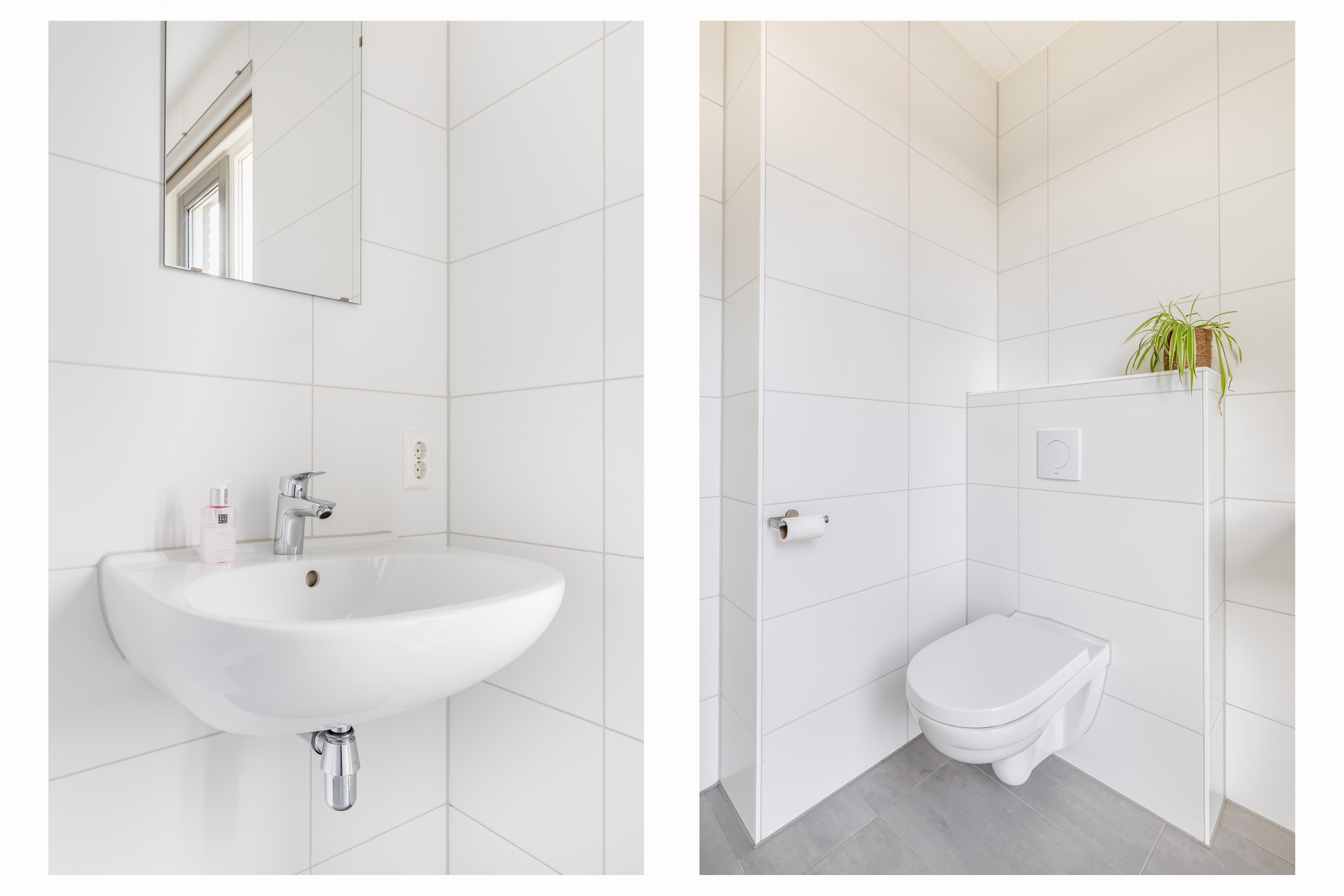 De badkamer is compleet uitgevoerd met een inloopdouche, hangend toilet en een dubbel wastafelmeubel en biedt alles wat je nodig hebt voor een frisse start van de dag.