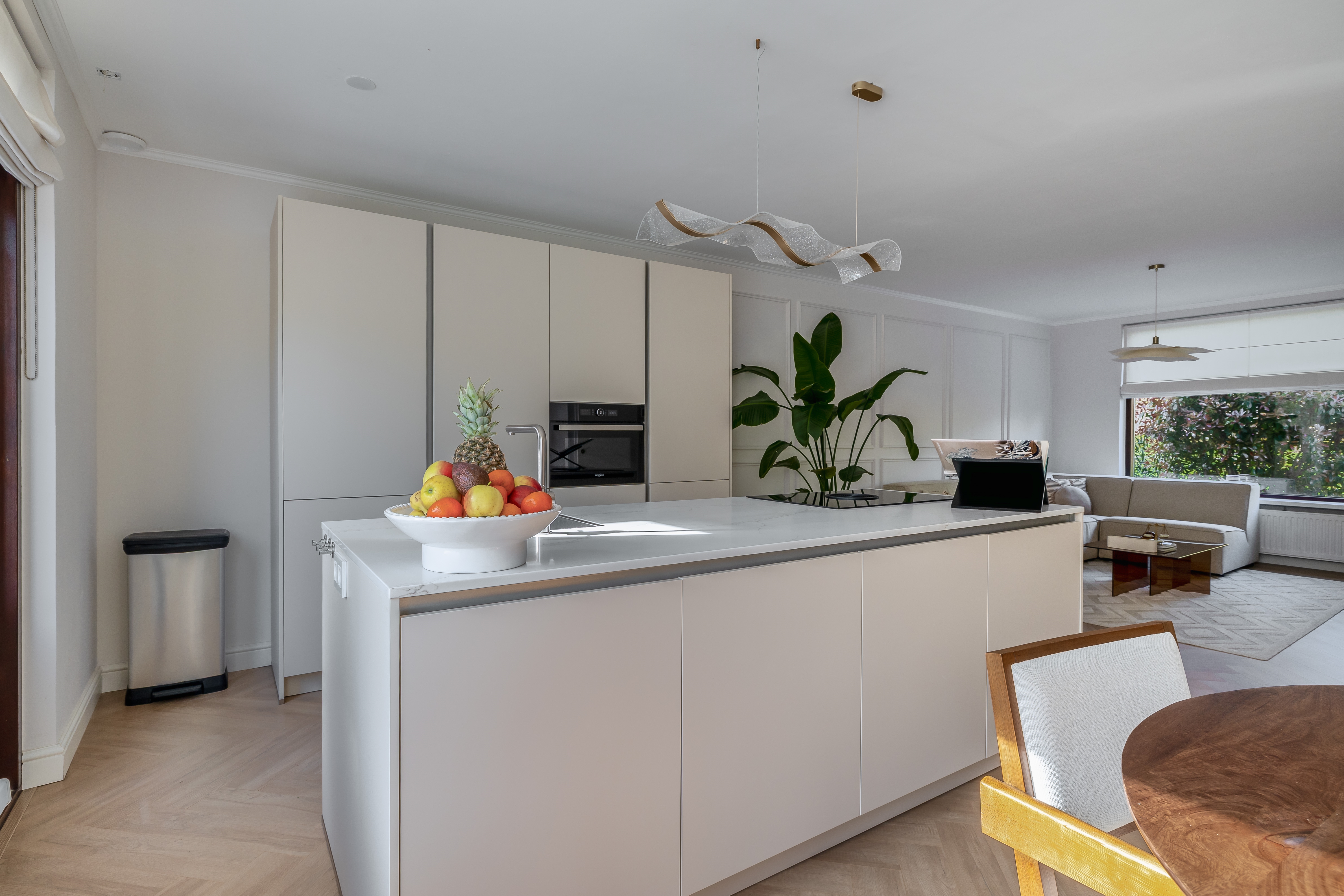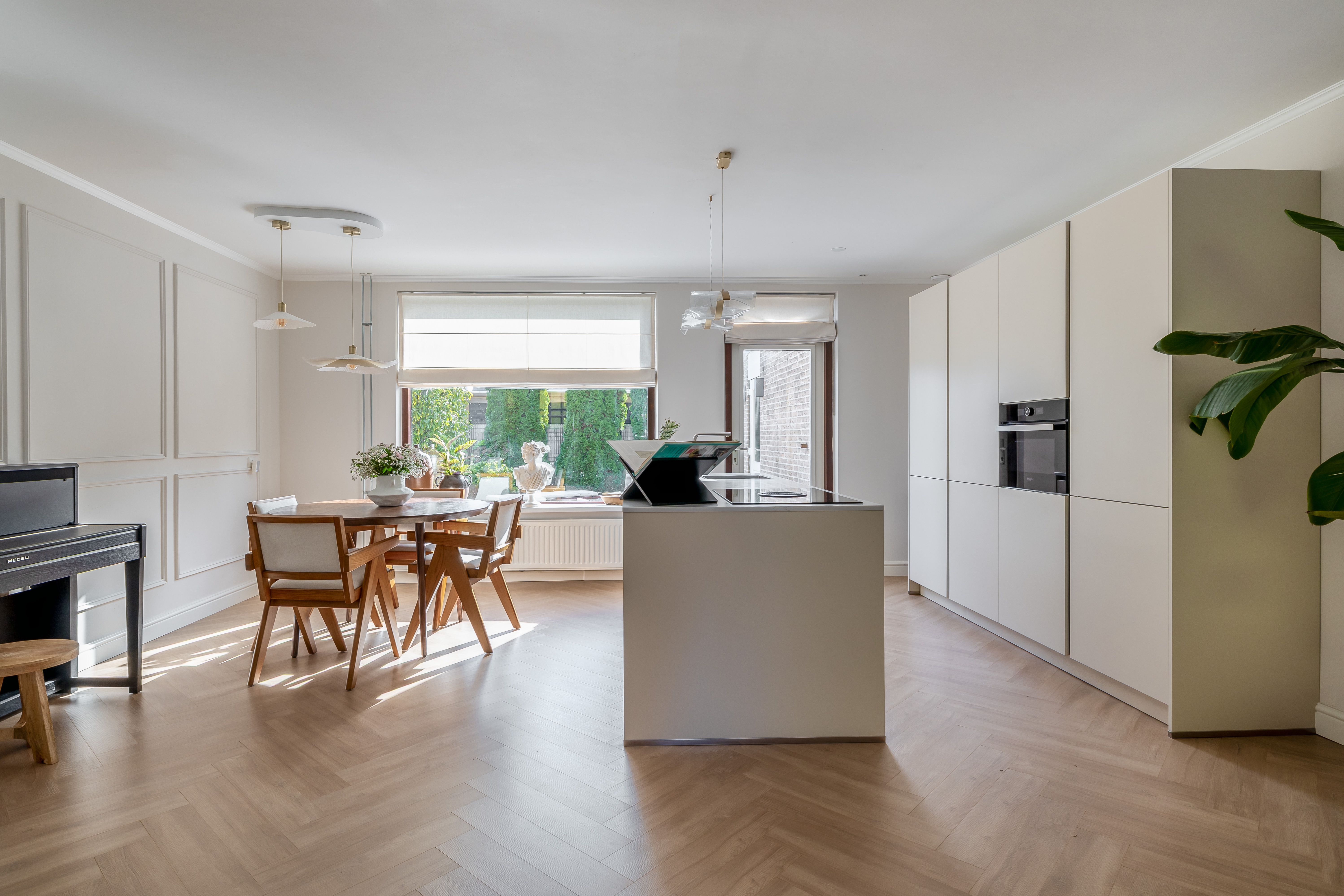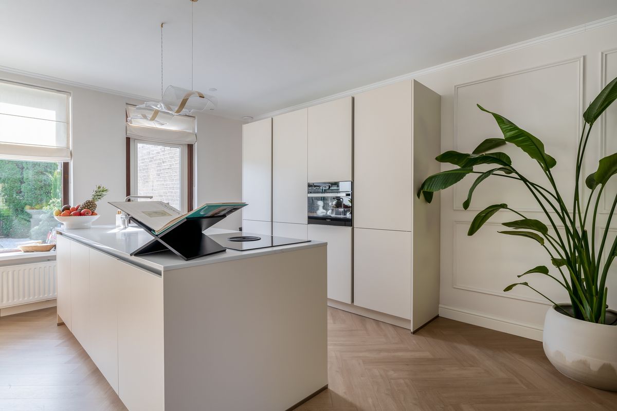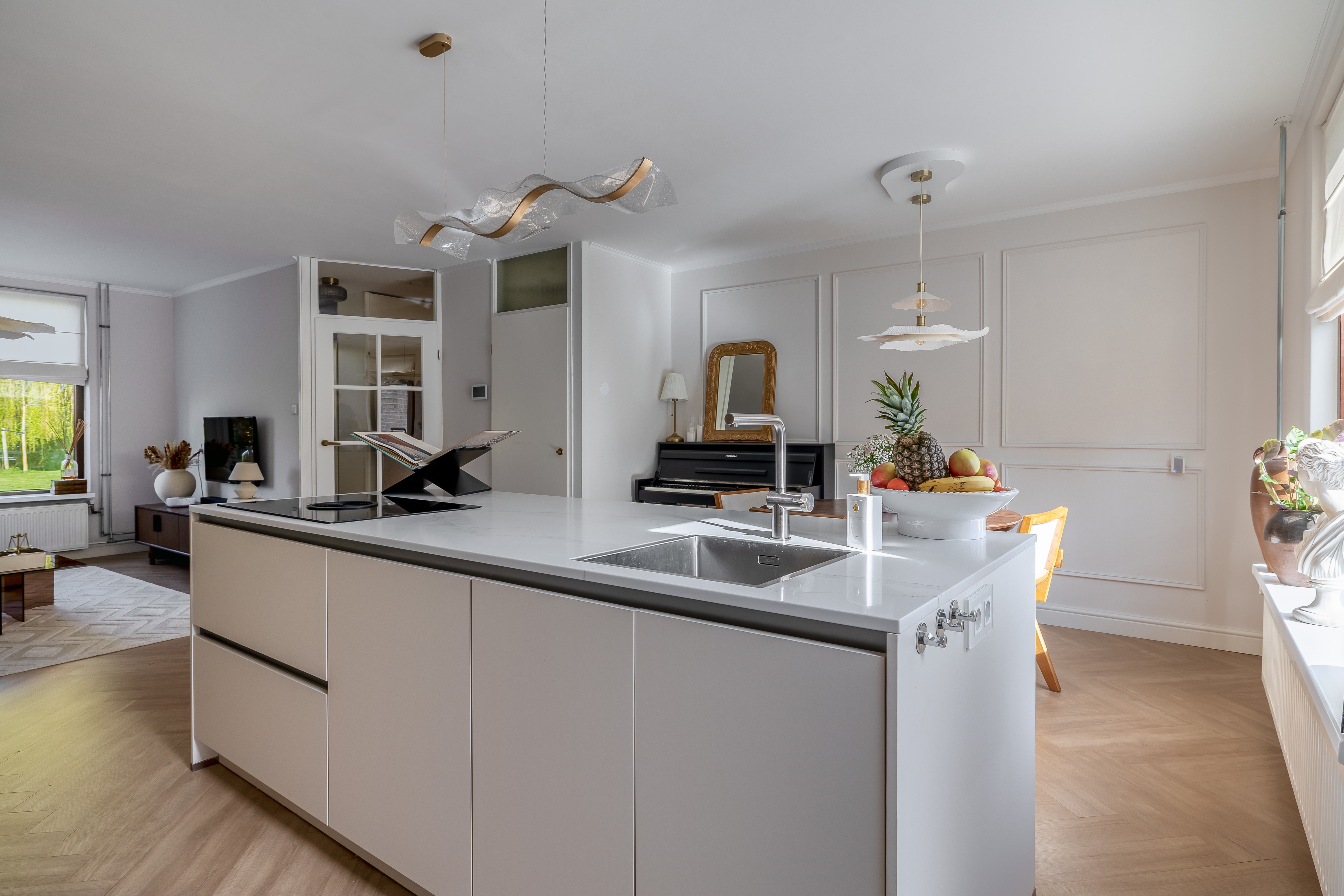 Aan de achterzijde vind je de prachtige open keuken met kookeiland, dé plek waar koken en gezelligheid samenkomen. De keuken is modern uitgevoerd en voorzien van diverse inbouwapparatuur en veel kastruimte. Vanuit de keuken heb je leuk zicht op de tuin.