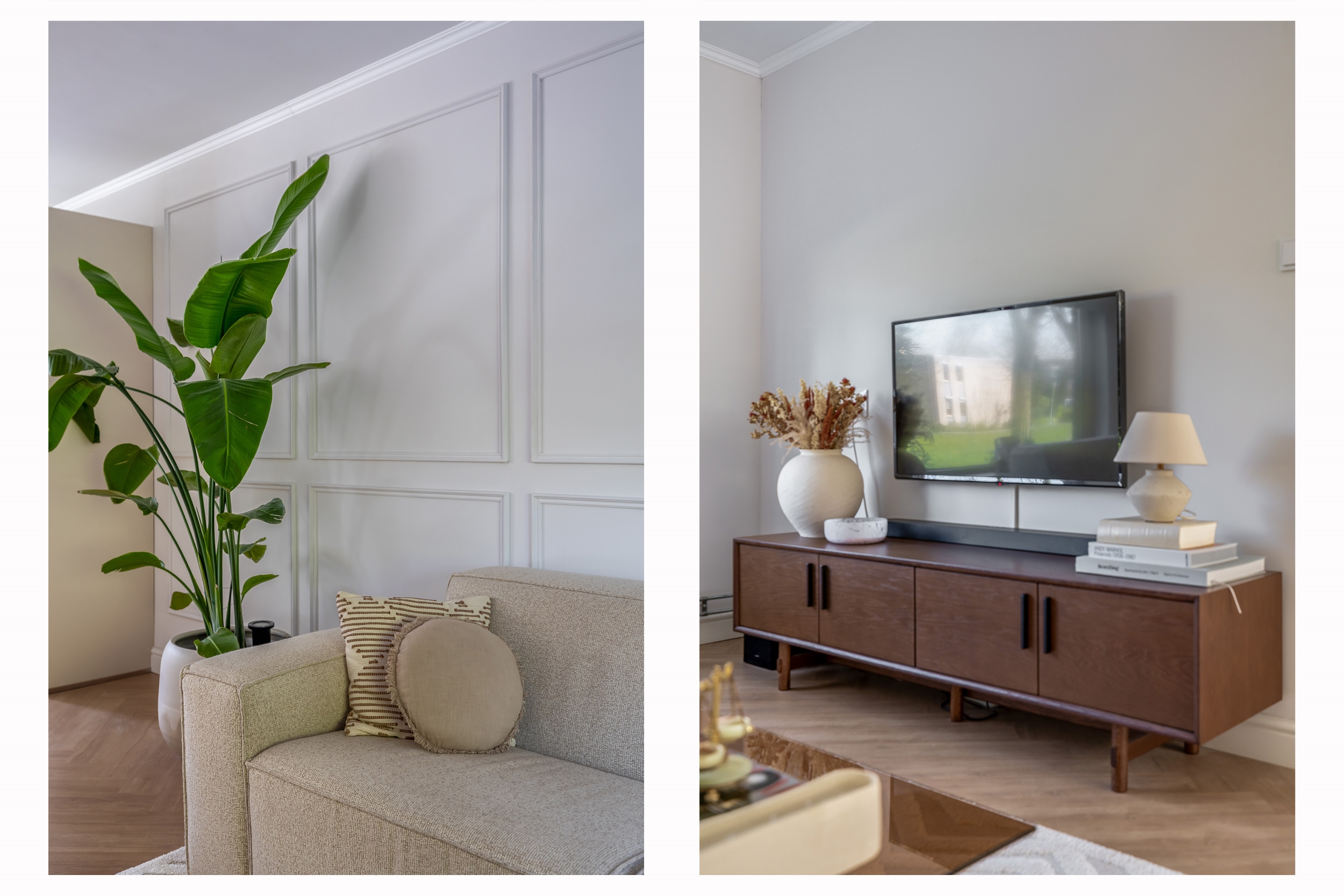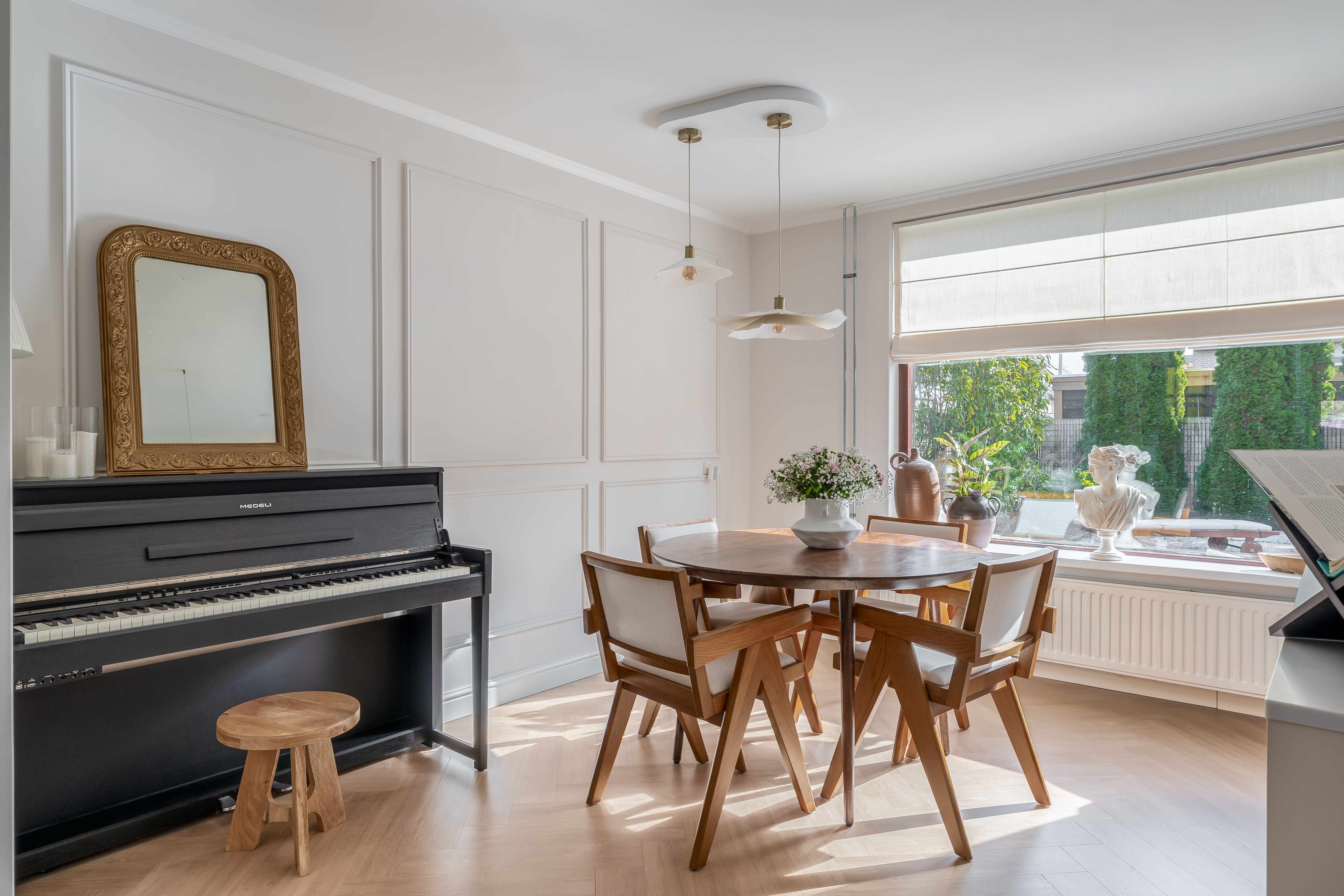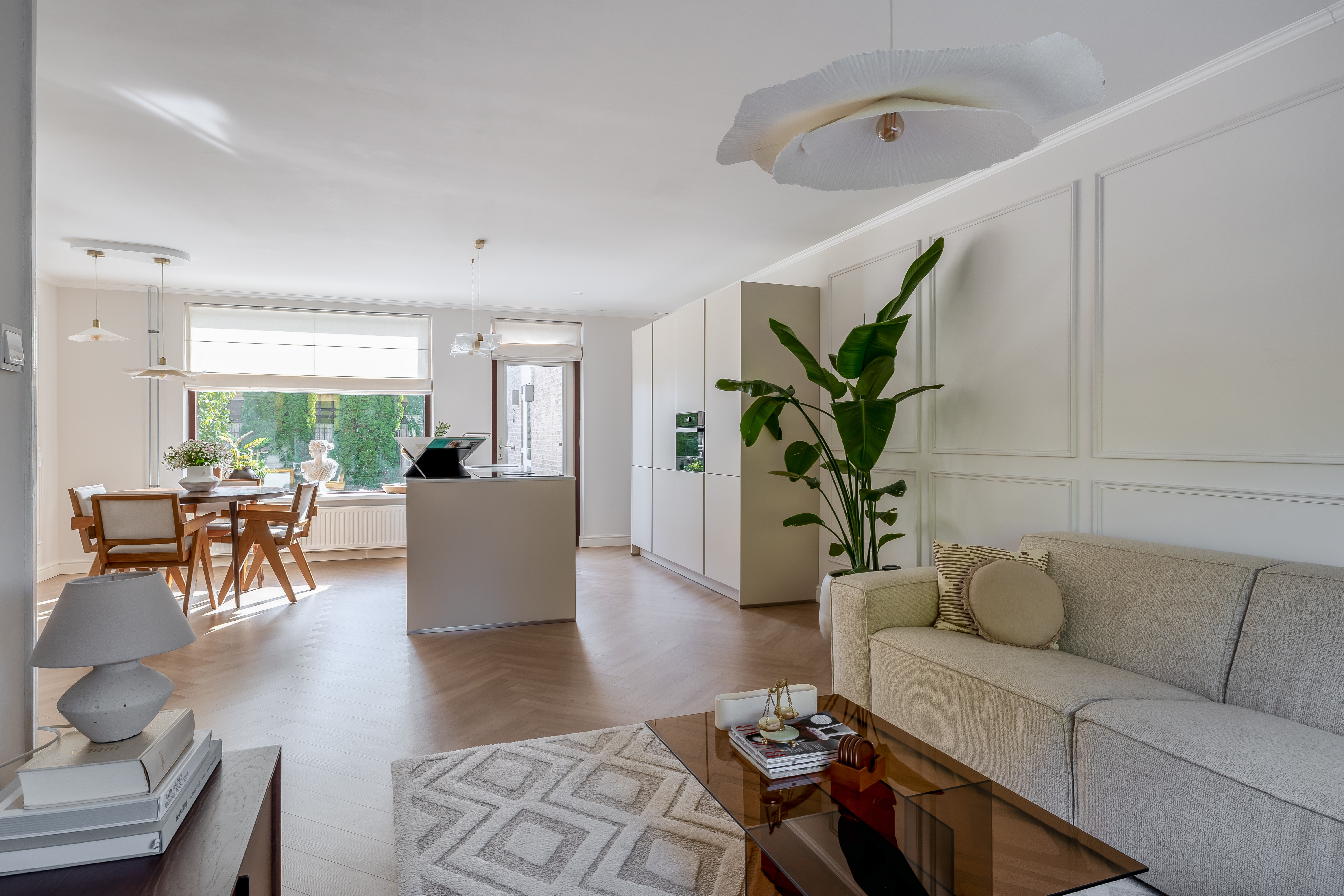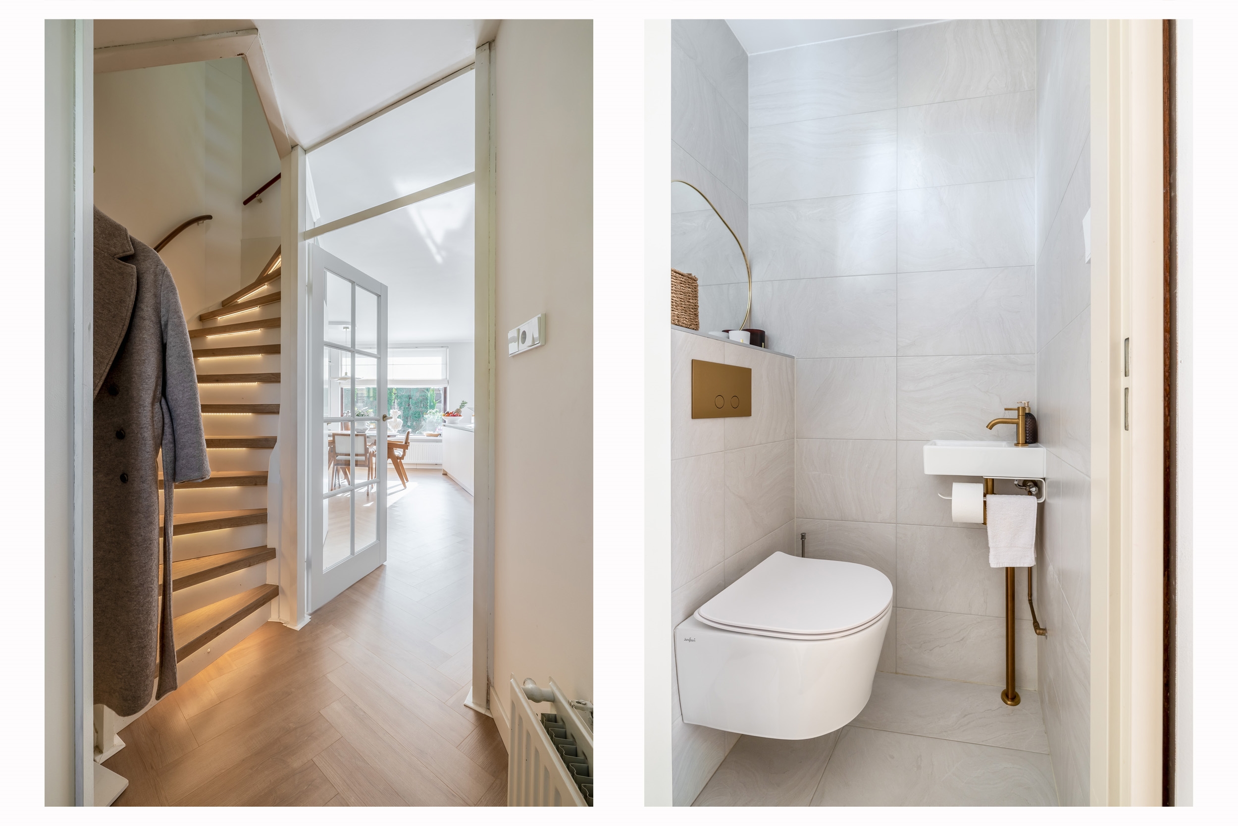 Je komt binnen in de hal met toegang tot het moderne toilet, de meterkast en de trapopgang. Vanuit hier loop je door naar de royale en lichte woonkamer. Dankzij de grote raampartijen en de hoekligging geniet je hier van veel lichtinval en een vrij uitzicht aan de voorzijde. De visgraatvloer en strakke wandafwerking zorgen direct voor een luxe en warme sfeer.