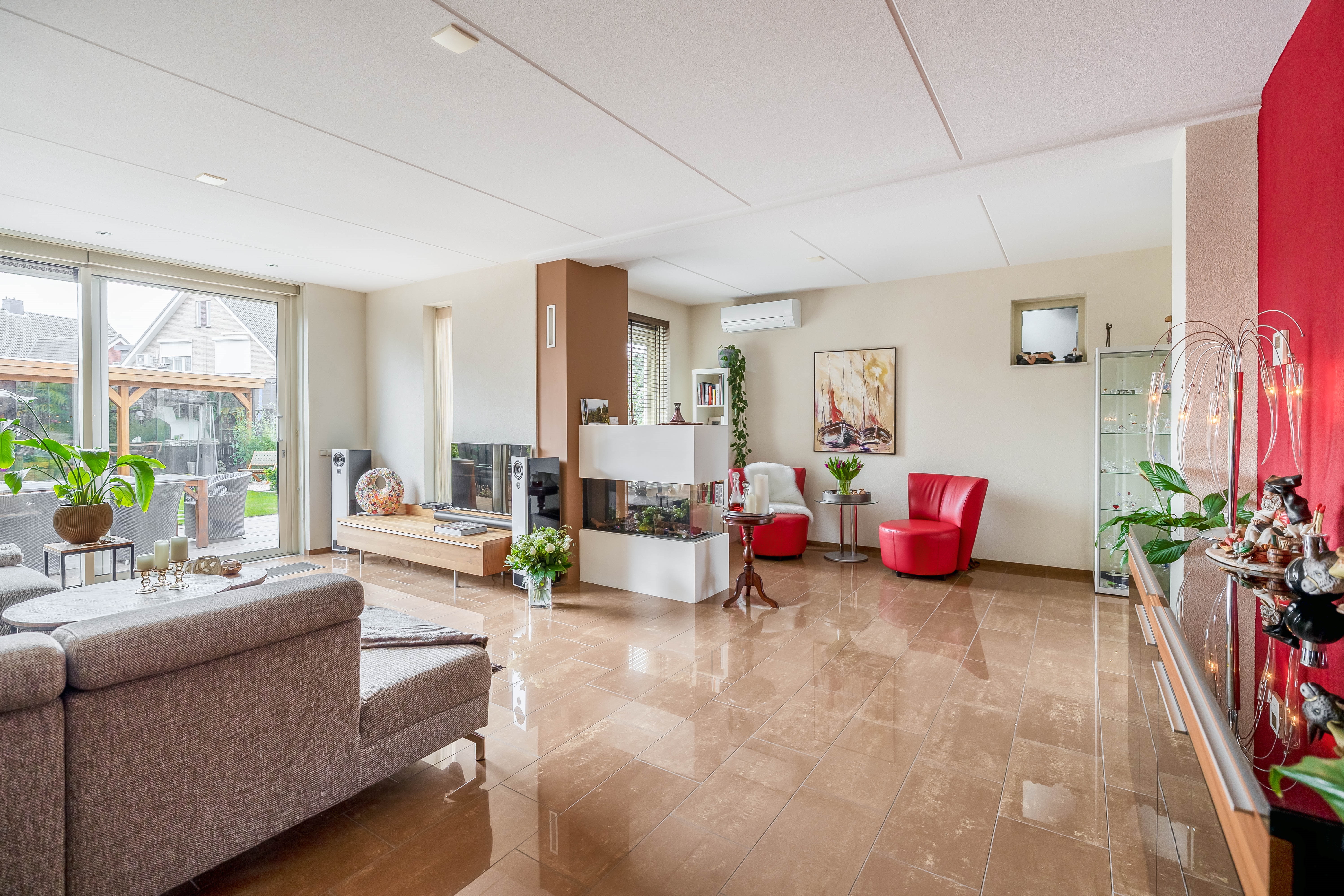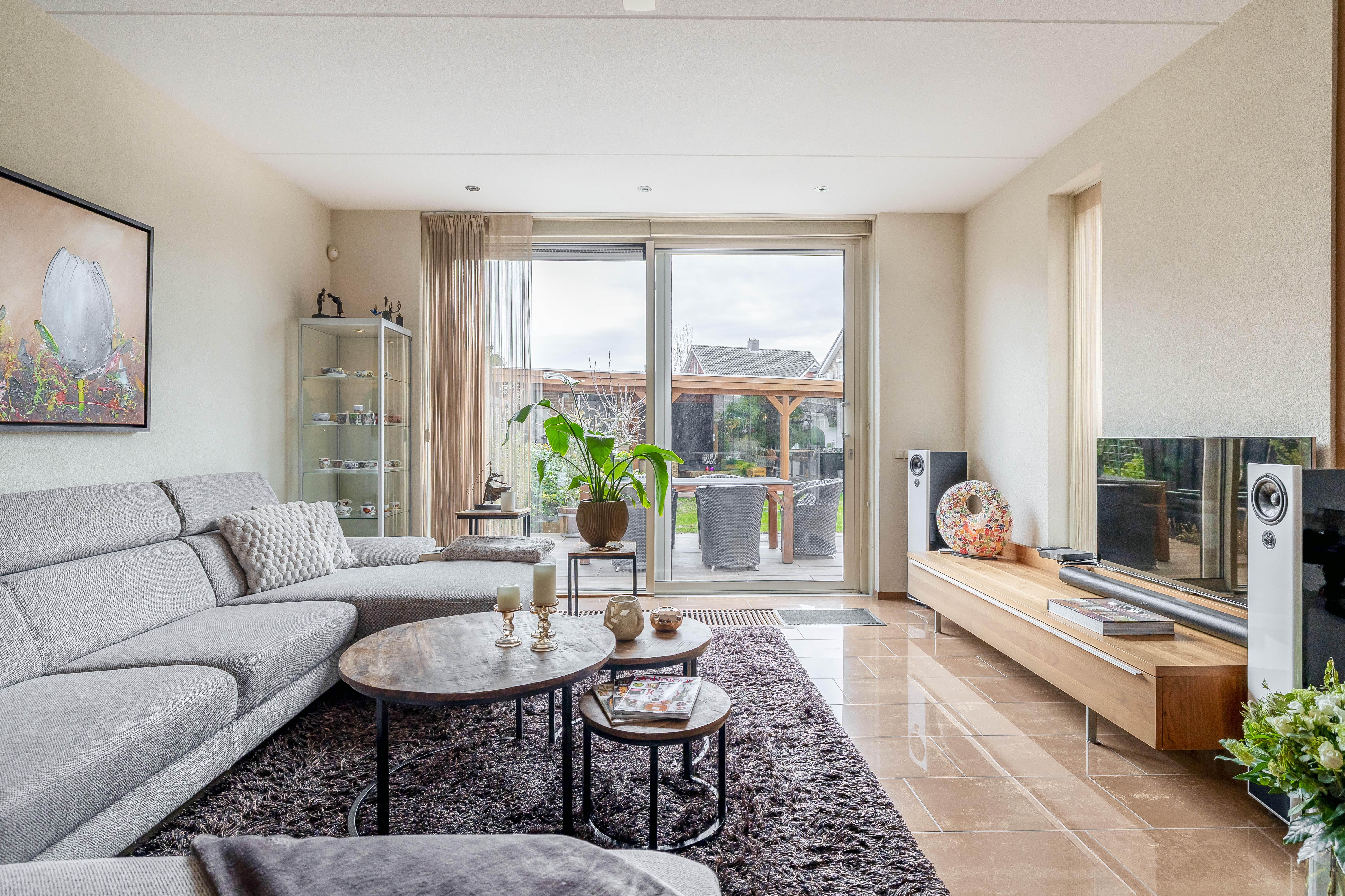 Vanuit de hal stap je de ruime woonkamer in. Wat direct opvalt is de hoeveelheid licht en de fijne indeling. De gashaard zorgt voor een warme en gezellige sfeer, echt zo’n plek waar je ’s avonds heerlijk neerploft.