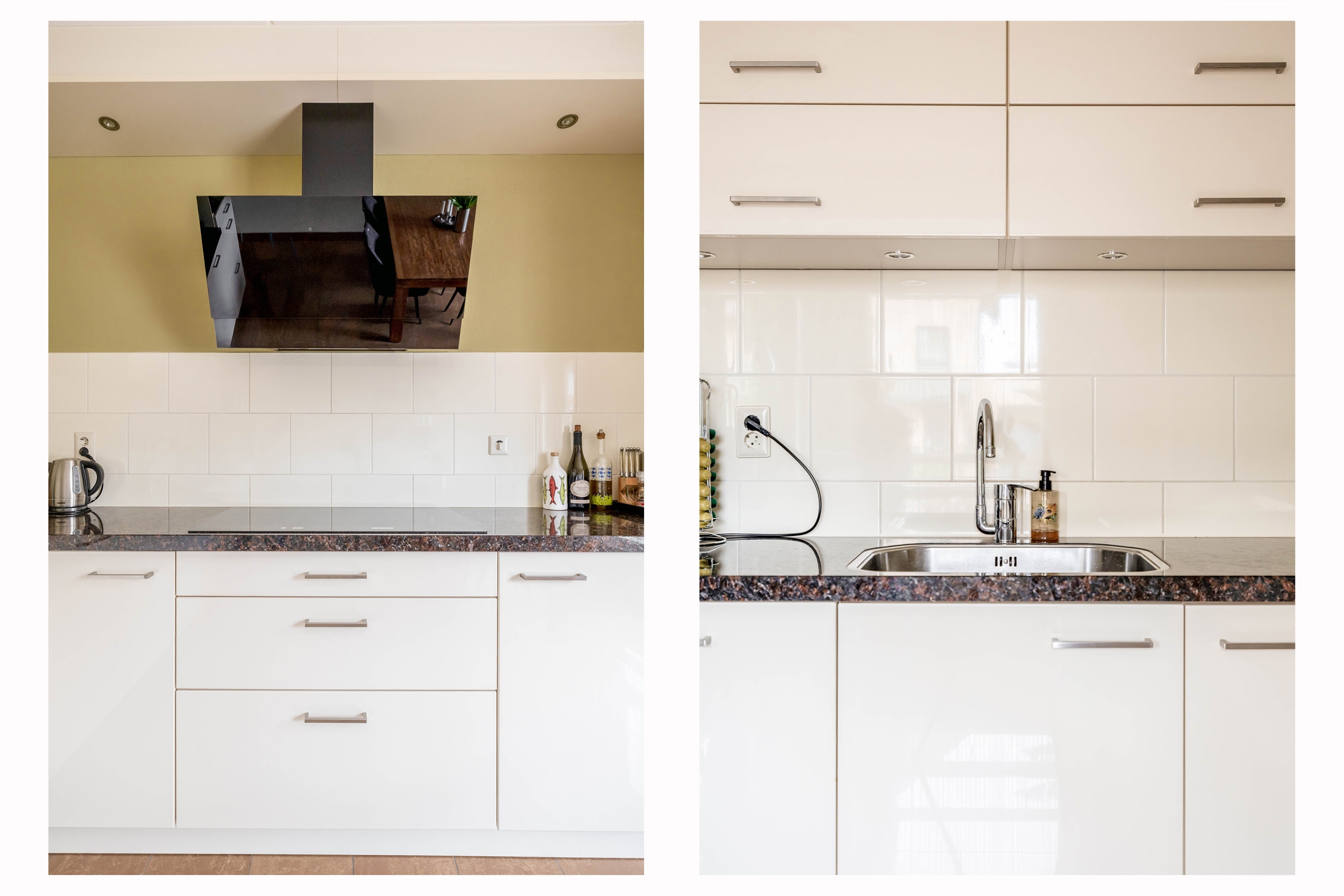 Aan de voorzijde van de woning bevindt zich de strakke keuken in hoekopstelling, voorzien van diverse inbouwapparatuur, een close-in boiler en voldoende werk- en kastruimte.