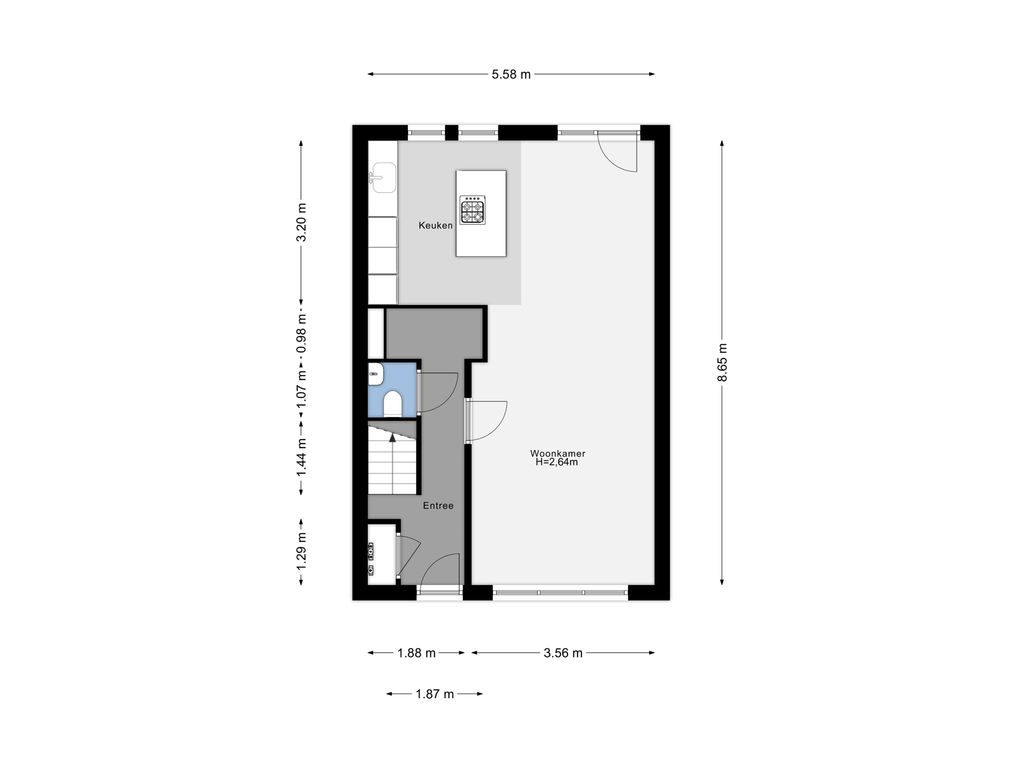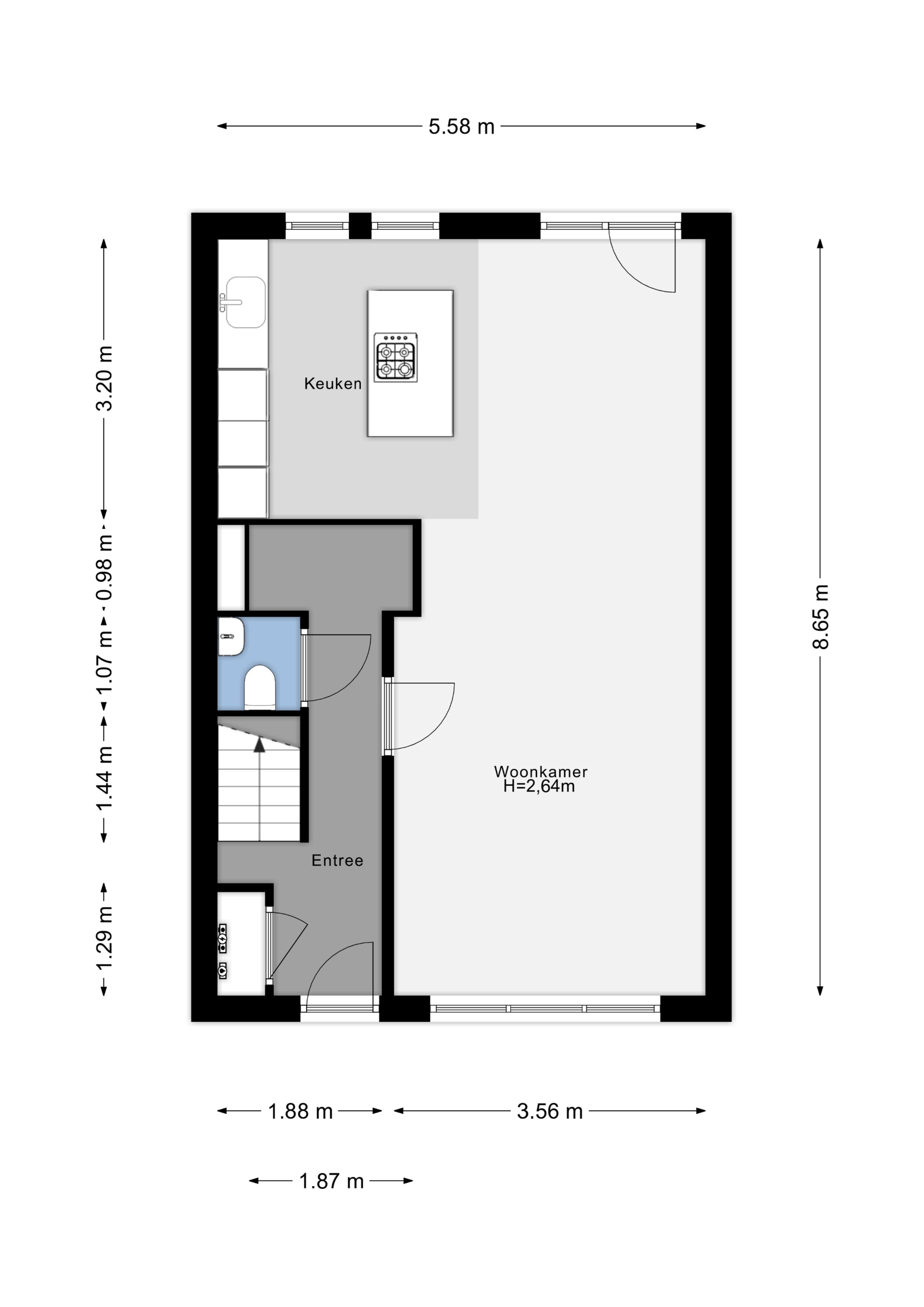 Je komt binnen in de entreehal met toegang tot het toilet, de meterkast, de trapopgang en de woonkamer. De woonkamer is heerlijk licht en ruim opgezet, met grote ramen aan beide zijden en een fijne verbinding met de open keuken aan de achterzijde. De moderne keuken is een echte eyecatcher, voorzien van een kookeiland, veel werkruimte en diverse inbouwapparatuur. Vanuit hier loop je zo de tuin in.