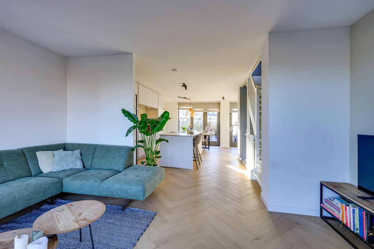 Via de trap kom je op de woonverdieping en hier gebeurt het écht. Je stapt binnen in de ruime en lichte woonkamer, waar grote raampartijen zorgen voor een heerlijke hoeveelheid daglicht. Hier creëer je moeiteloos een comfortabele zithoek waar je na een lange dag heerlijk kunt ontspannen.