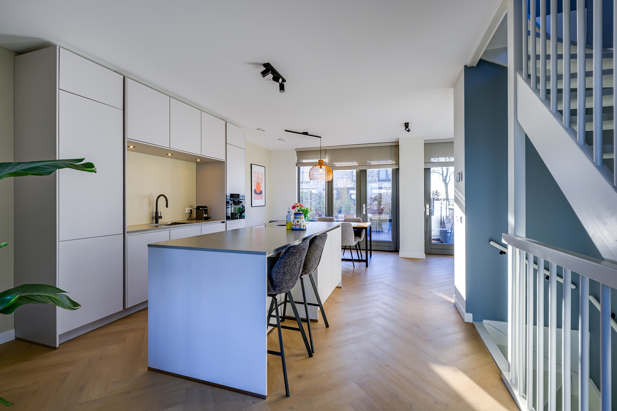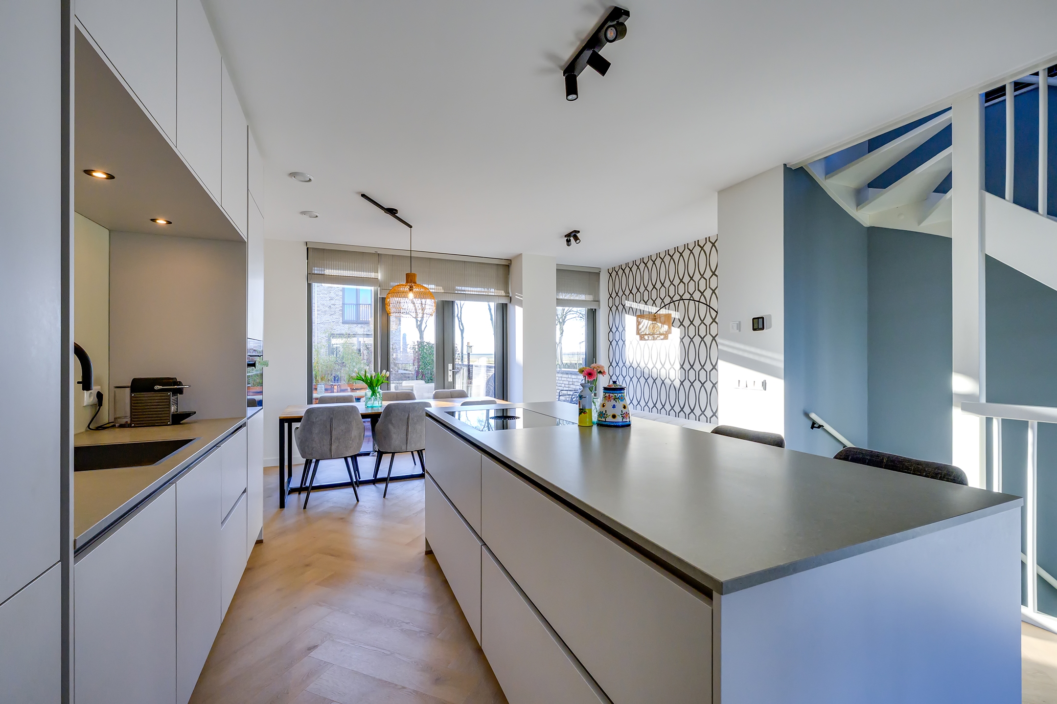 Midden in de woonkamer bevindt zich de prachtige keuken met kookeiland. De keuken is praktisch opgesteld en biedt volop ruimte om uitgebreid te koken én gezellig te tafelen. De open verbinding tussen koken, eten en wonen maakt deze verdieping perfect voor lange avonden met vrienden of familie.