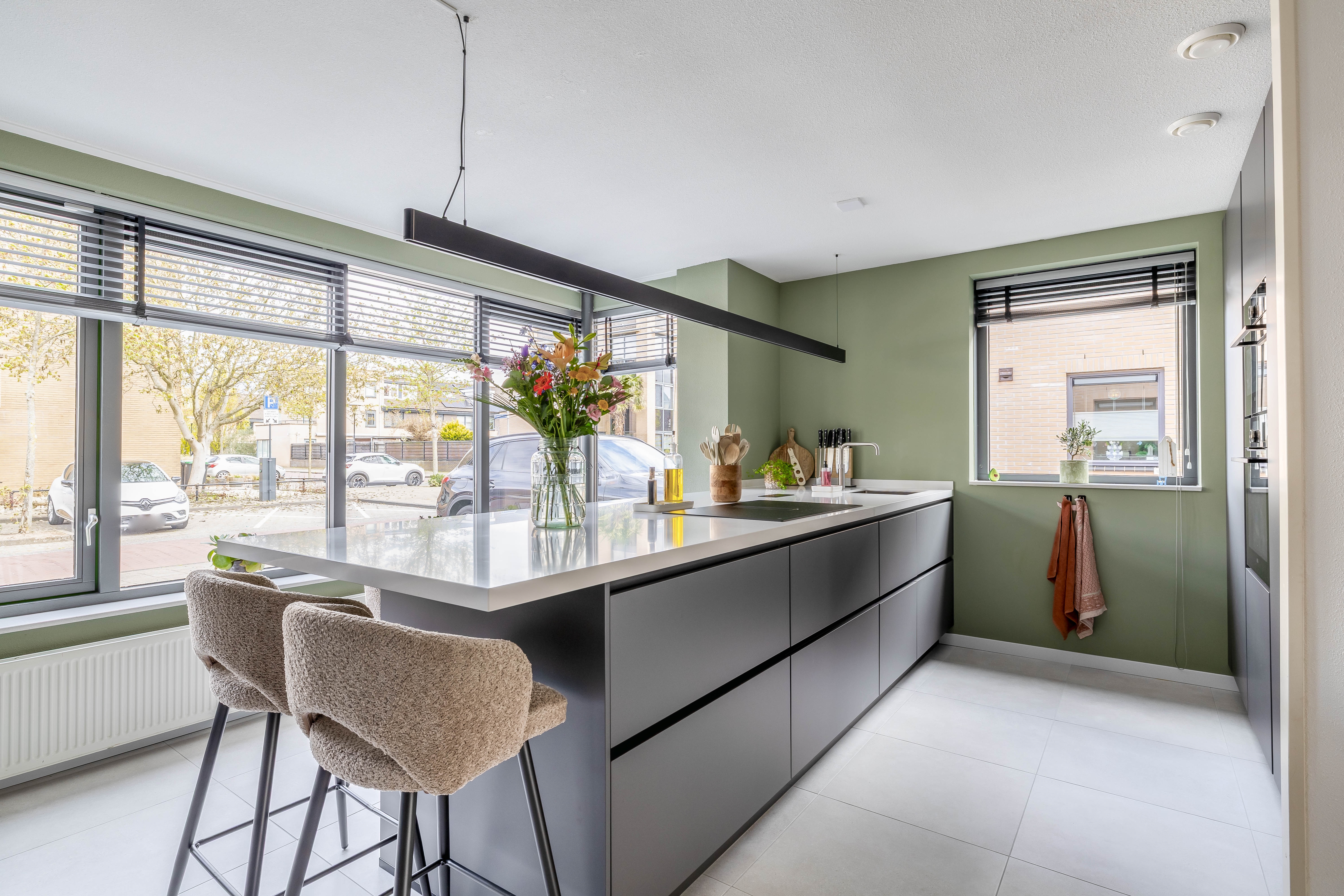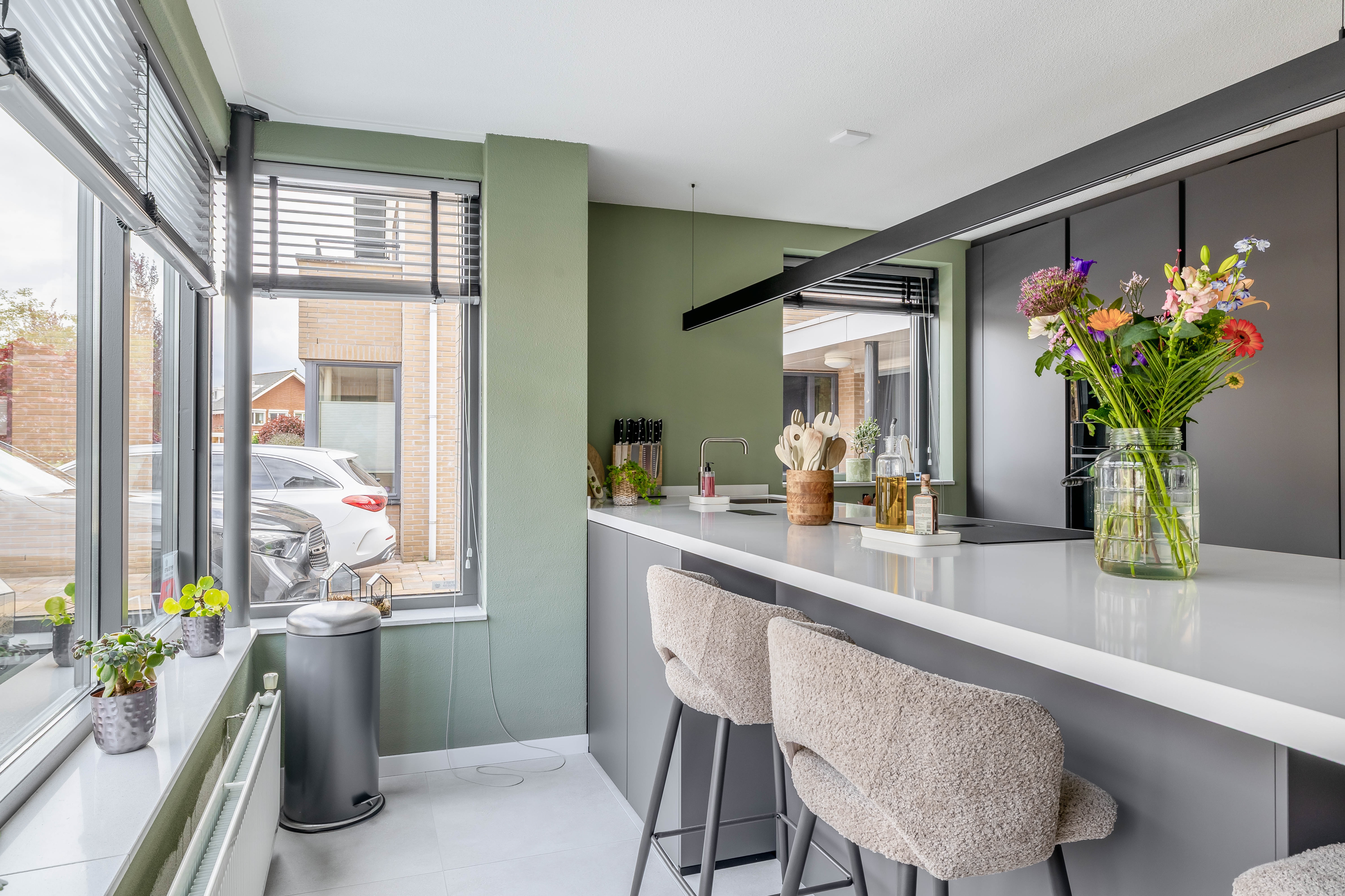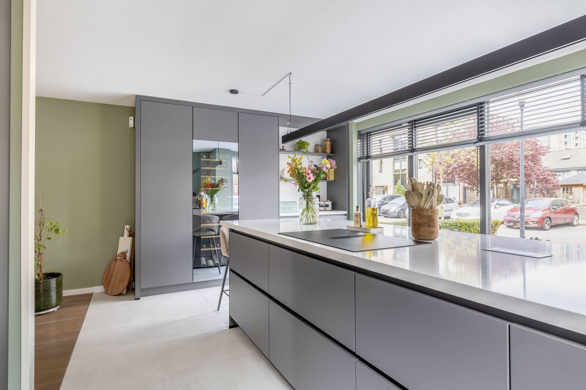 Aan de voorzijde van de woning bevindt zich de absolute eyecatcher: de nieuwe keuken uit 2025! Deze luxe greeploze keuken met eiland, hoge kastenwand, wijnkoelkast en koffiecorner is strak afgewerkt en voorzien van alle denkbare inbouwapparatuur. Hier kook je met plezier en geniet je van lange avonden tafelen.