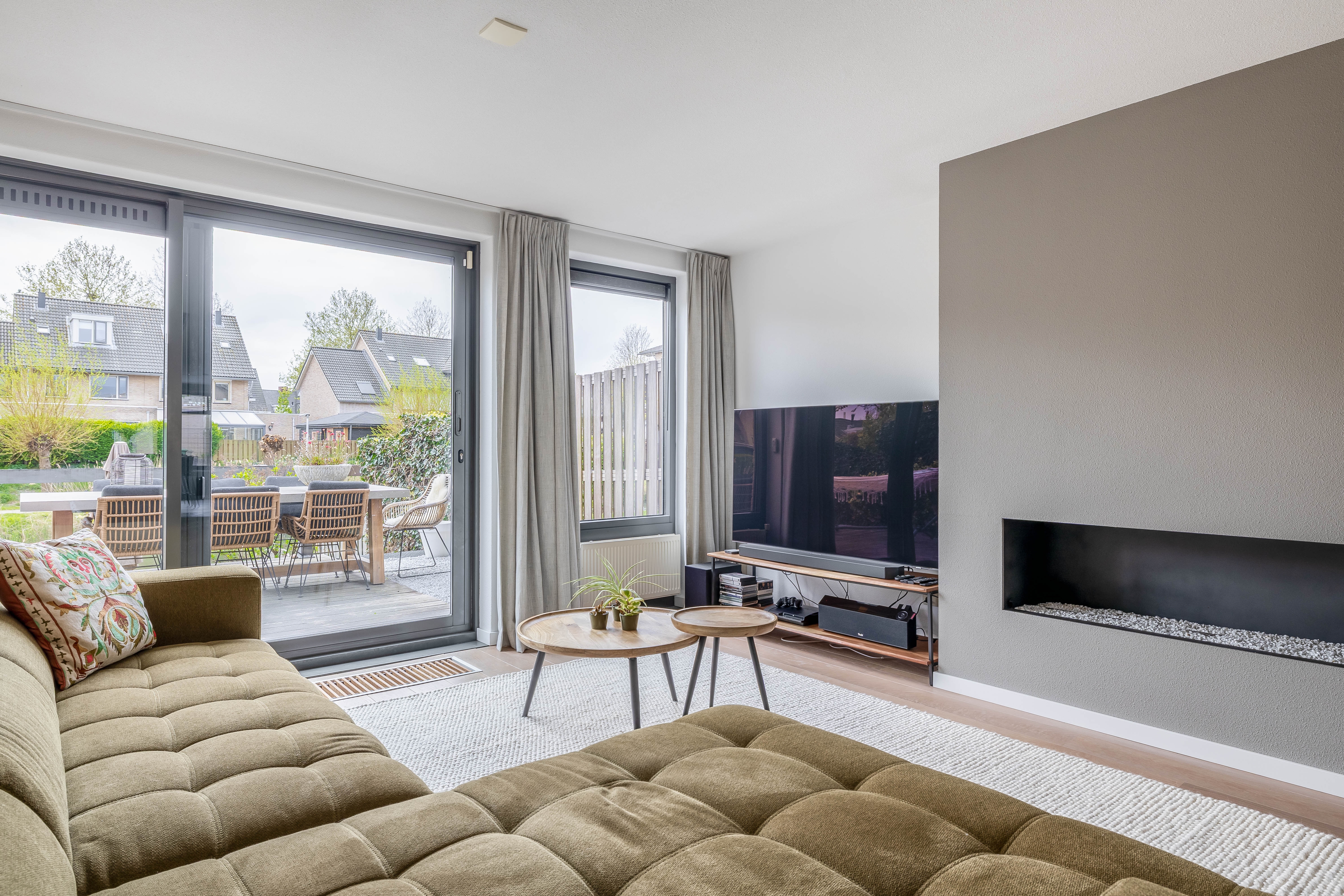 Je komt via op je eigen oprit en stapt binnen in de hal met toilet, meterkast en trapopgang. Vanuit hier loop je door de moderne stalen deur door naar de royale woonkamer. Dankzij het betrekken van een deel van de garage bij de woonkamer en grote raampartijen voelt deze ruimte heerlijk licht en ruim aan. De moderne gashaard geeft een heerlijke sfeer aan de woonkamer.