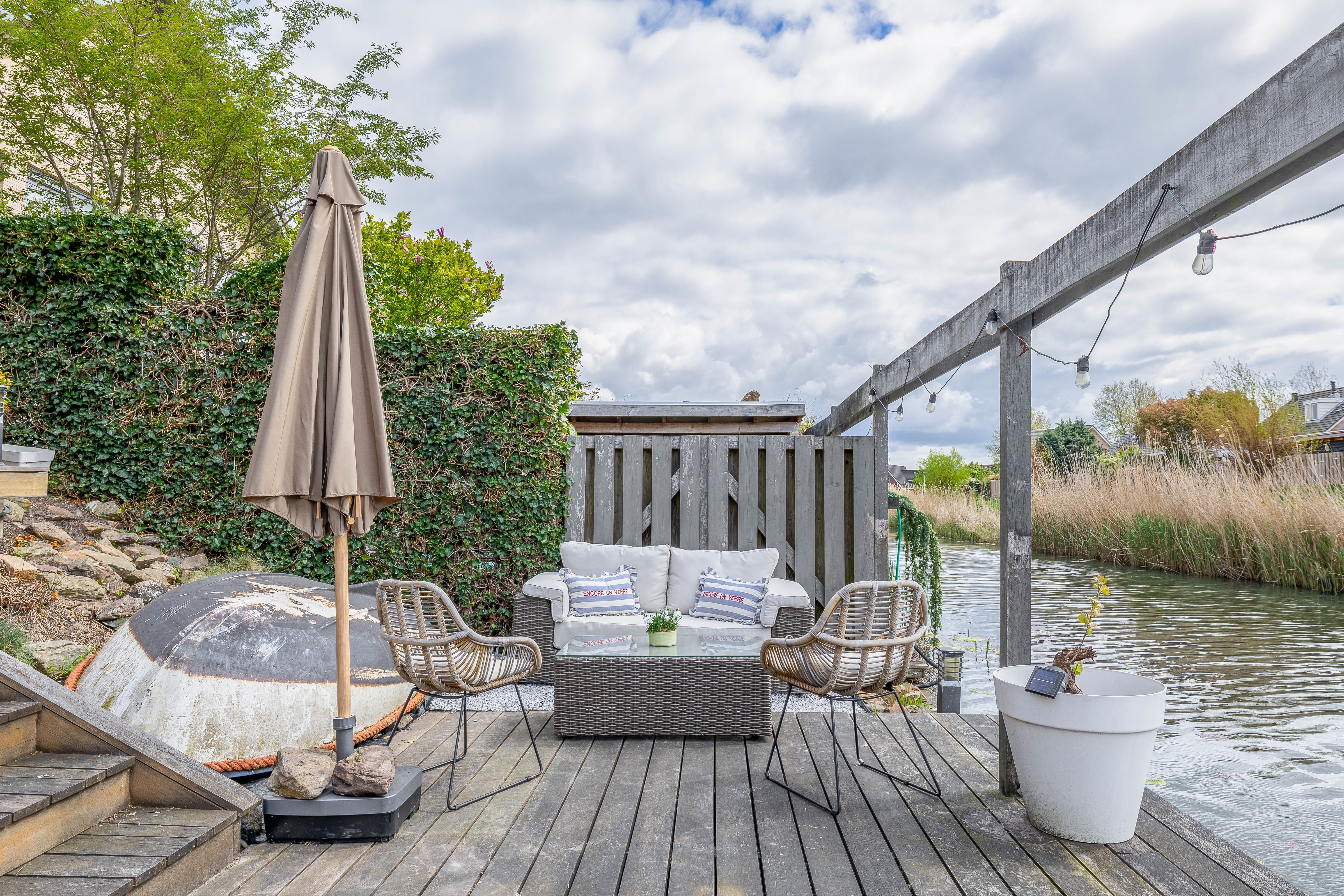 Via de woonkamer bereik je de zonnige achtertuin aan het water – een plek waar je echt tot rust komt en geniet van het buitenleven. De tuin is strak aangelegd en perfect onderhouden! Door de ligging op het zuidwesten geniet je hier de hele dag van de zon. Er zijn twee elektrische zonneschermen aanwezig voor als je toch wat schaduw wil in de tuin.