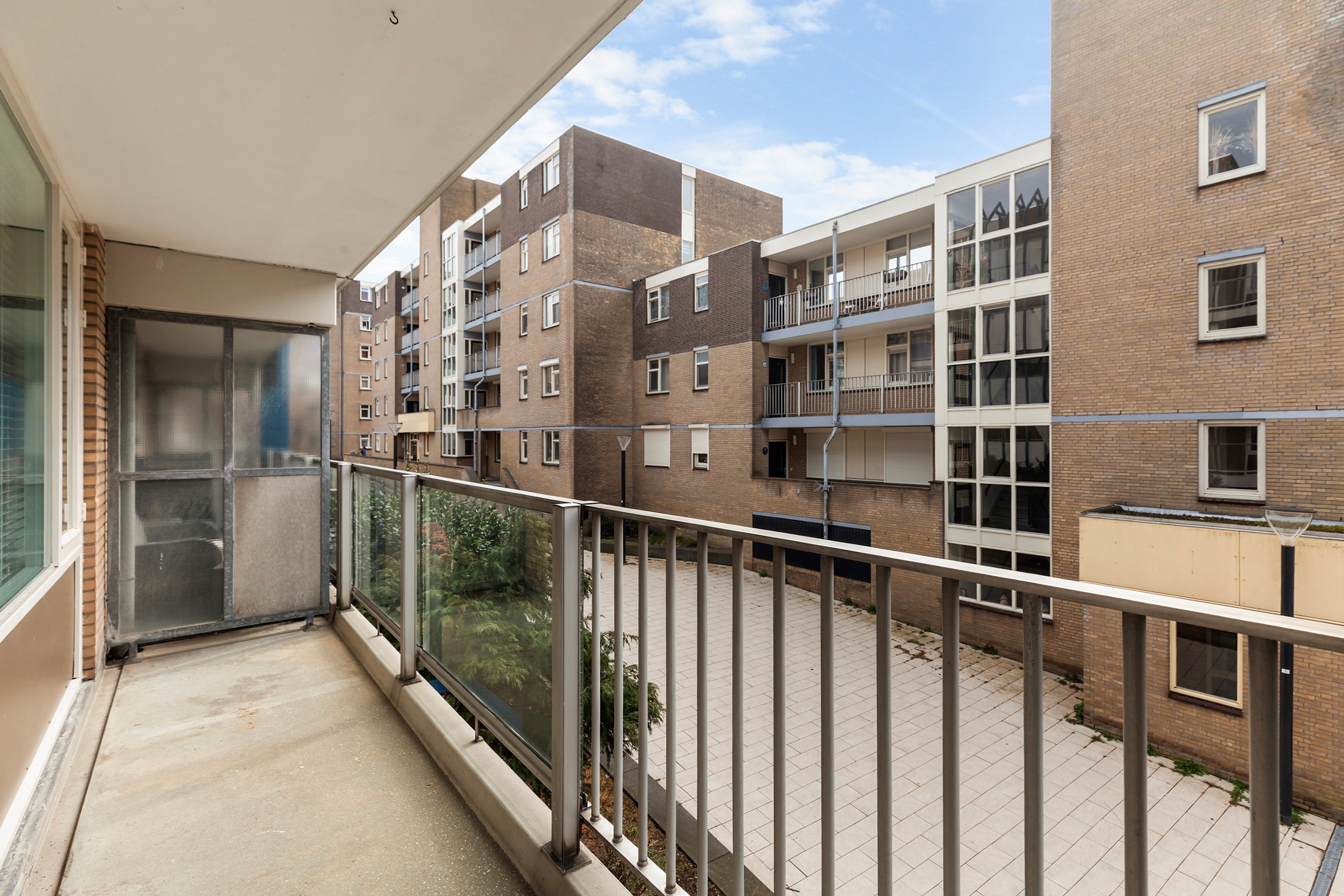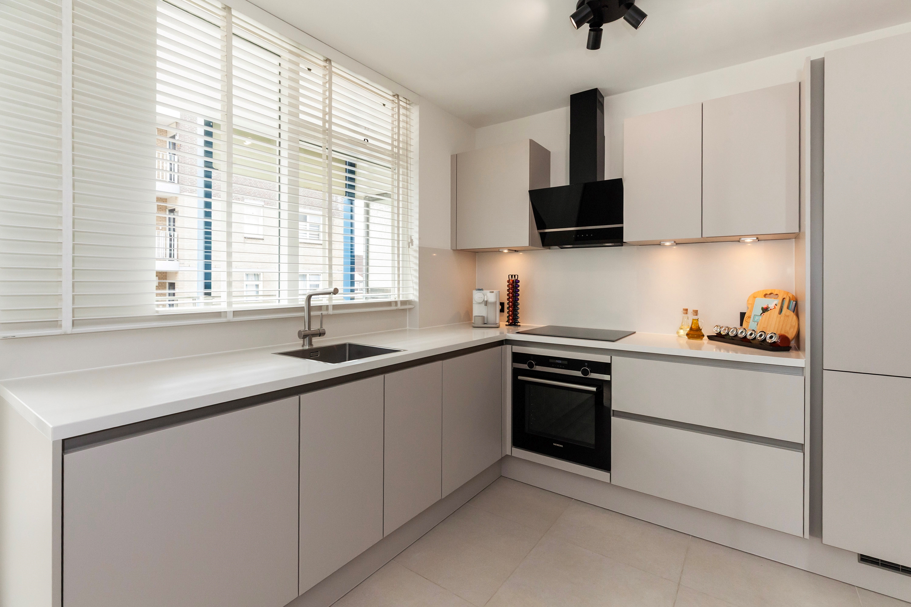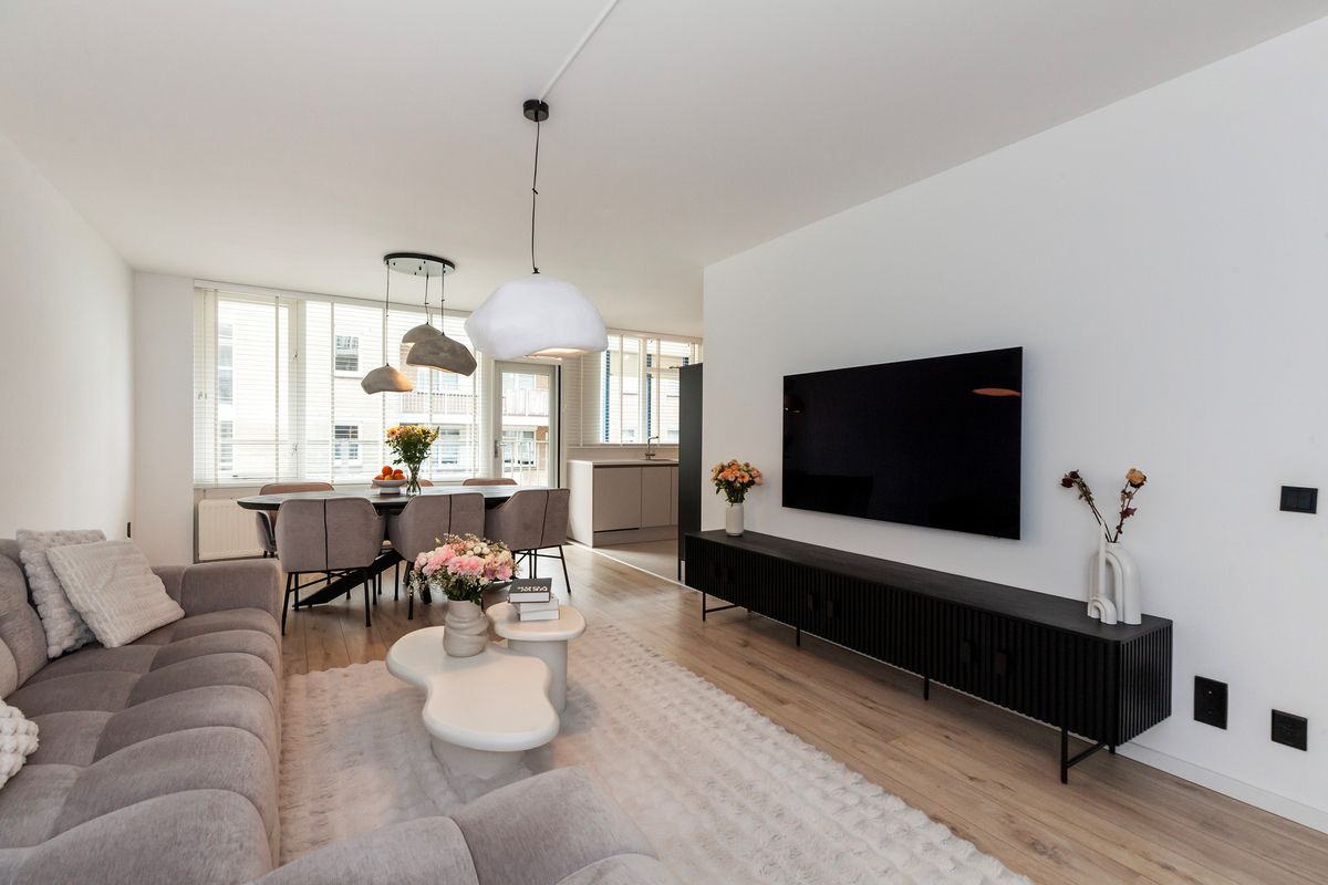 De woonkamer is heerlijk licht en strak afgewerkt, met directe toegang tot het zonnige balkon op het zuidwesten, een fijne plek om na je werk nog even van de zon te genieten.